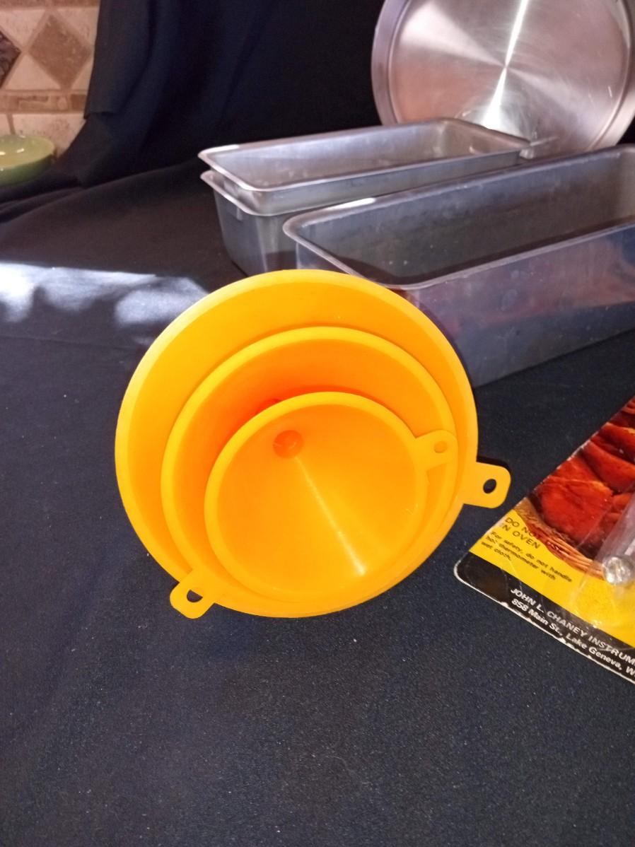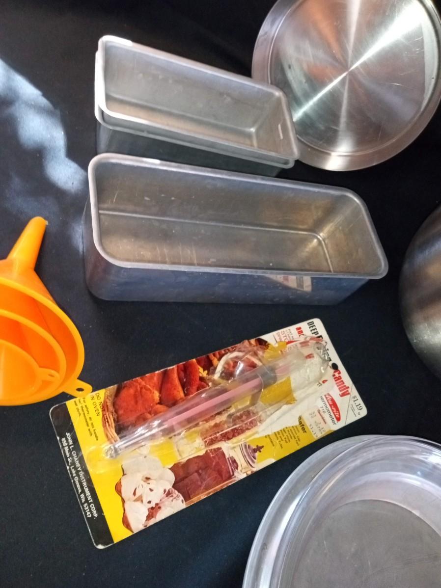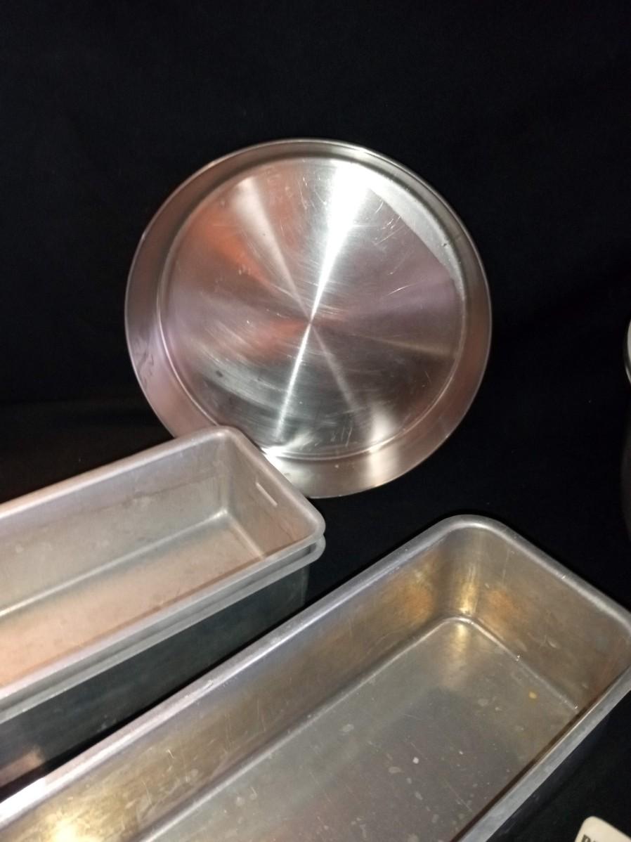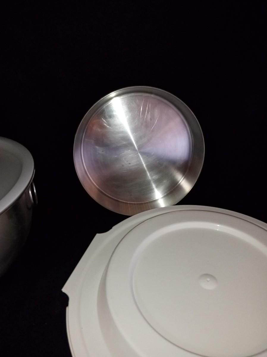 3 MEASURING STAINLESS STEEL BOWLS WITH PLASTIC LIDS, PIE STORAGE CONTAINER, BAKING PANS, THERMOMETER, HAND MIXER AND FUNNELS