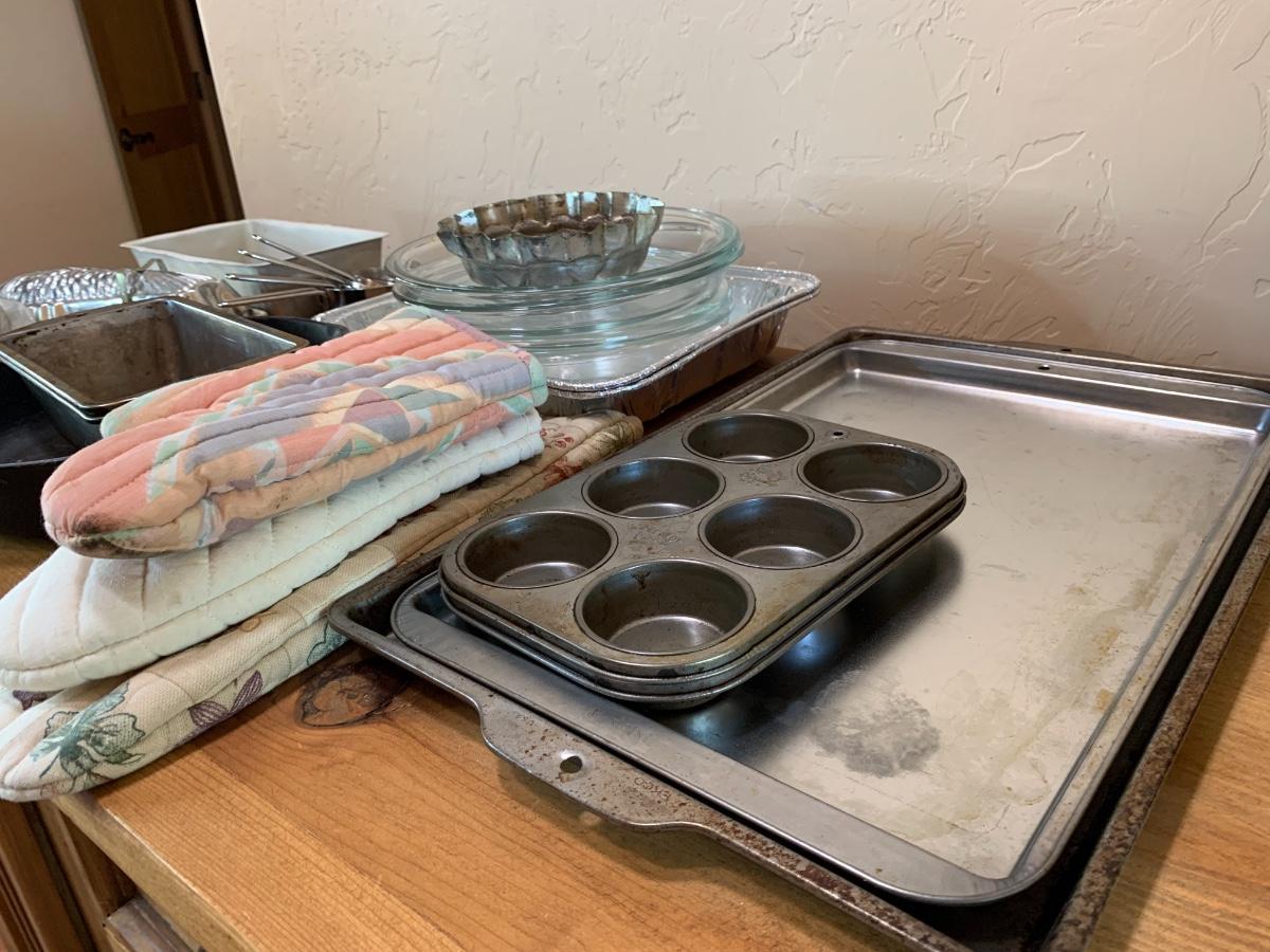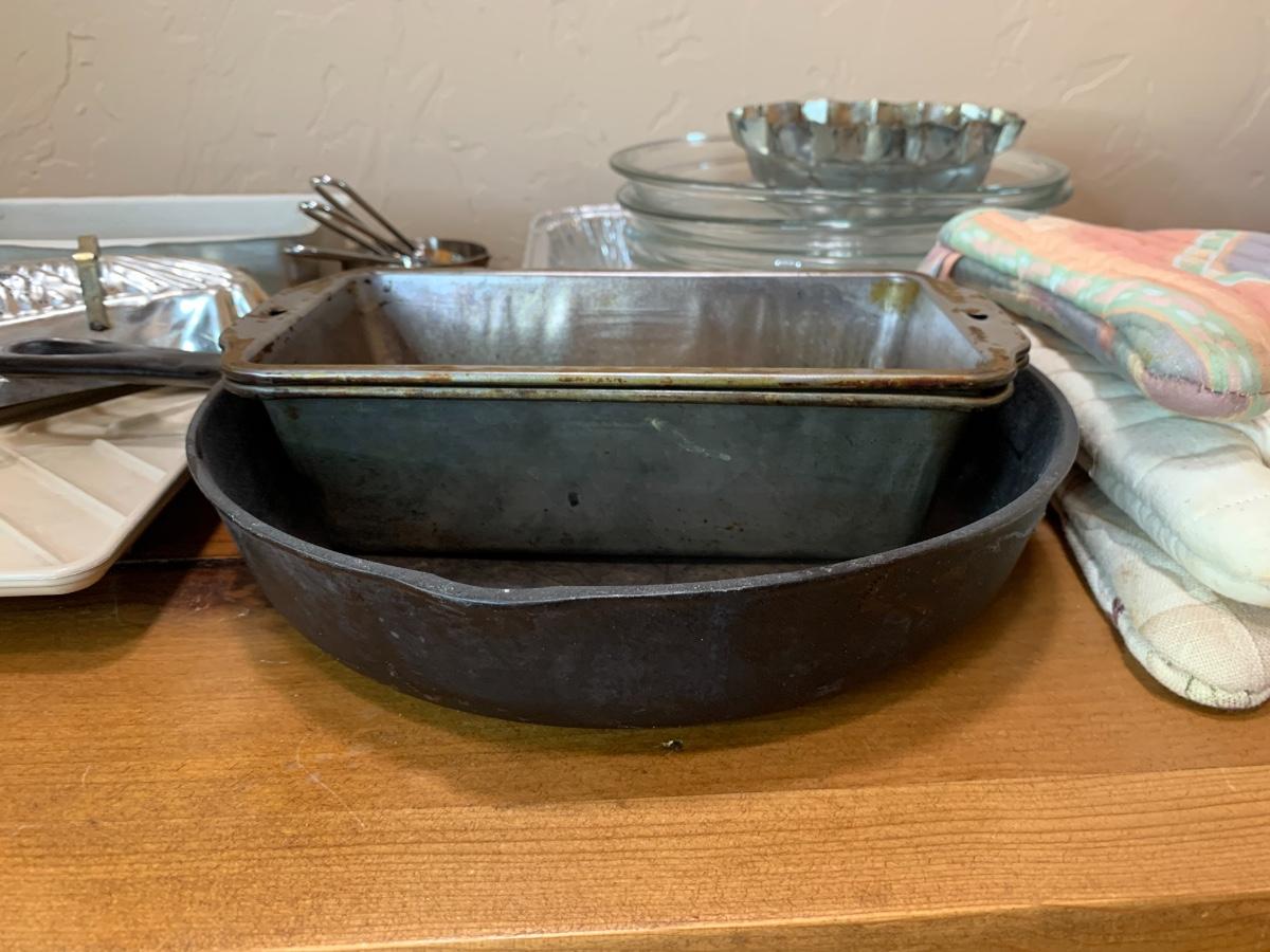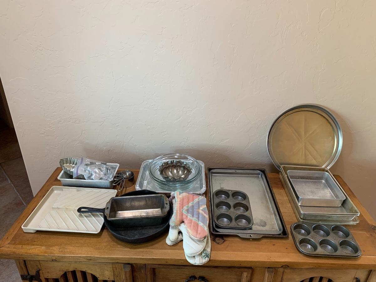 Misc bakeware includes tinfoil pans, pie pans, baking sheets, cupcake pans, cast iron skillet, measuring cups, 3 different oven mitts and microwavable bacon rack