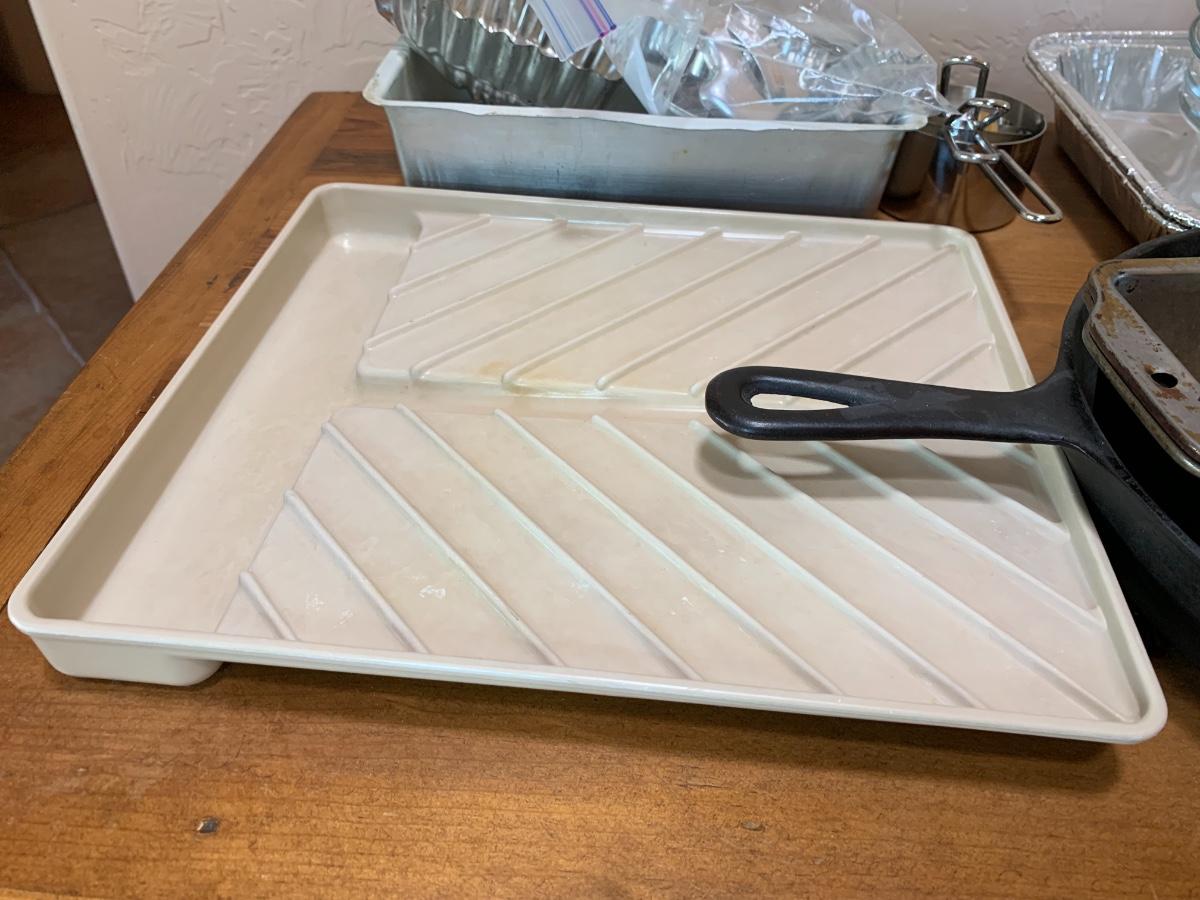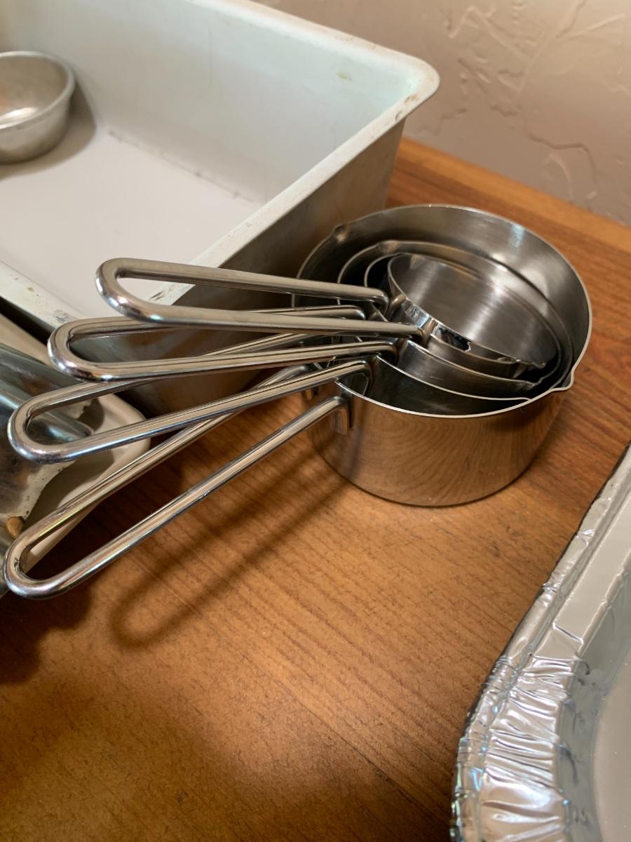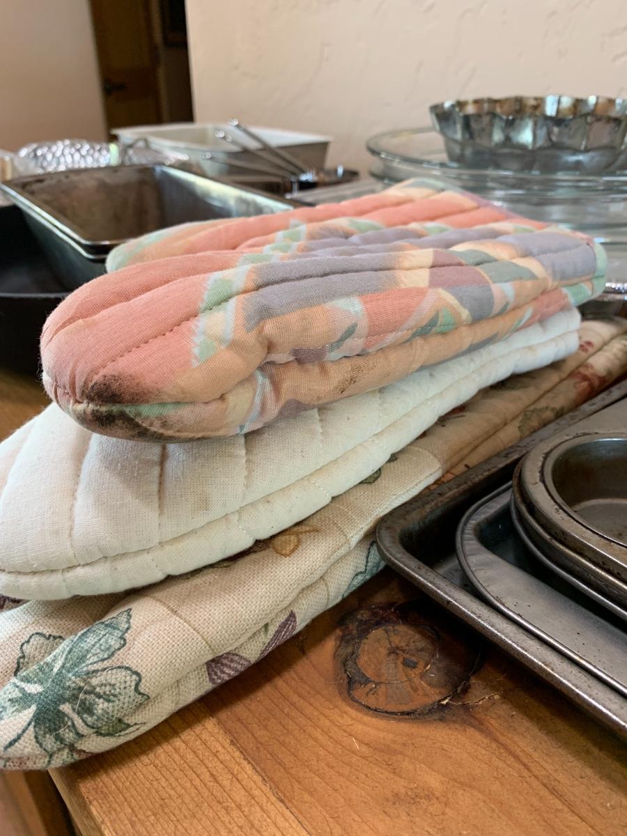 Misc bakeware includes tinfoil pans, pie pans, baking sheets, cupcake pans, cast iron skillet, measuring cups, 3 different oven mitts and microwavable bacon rack