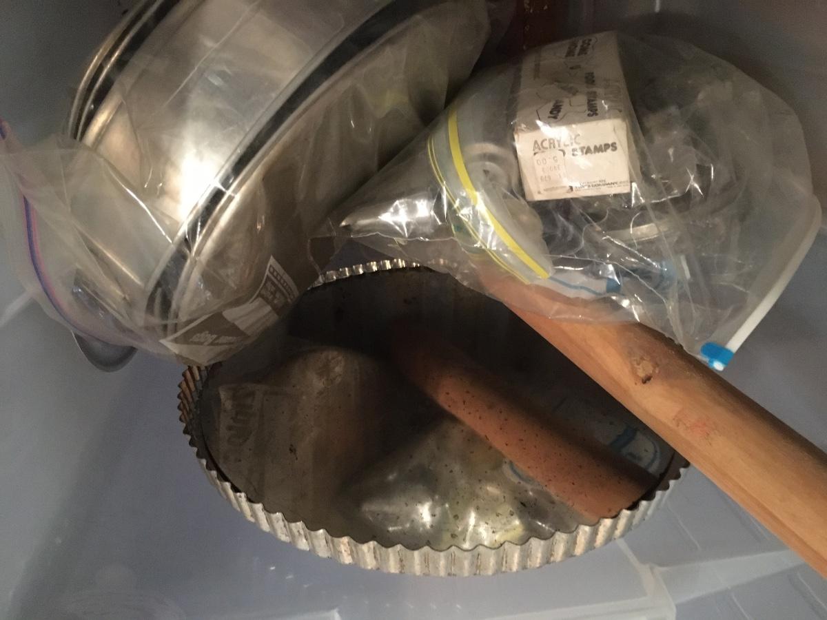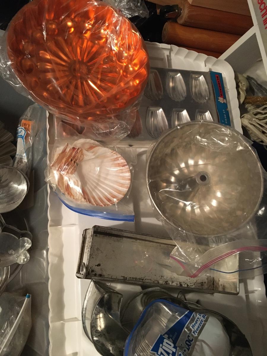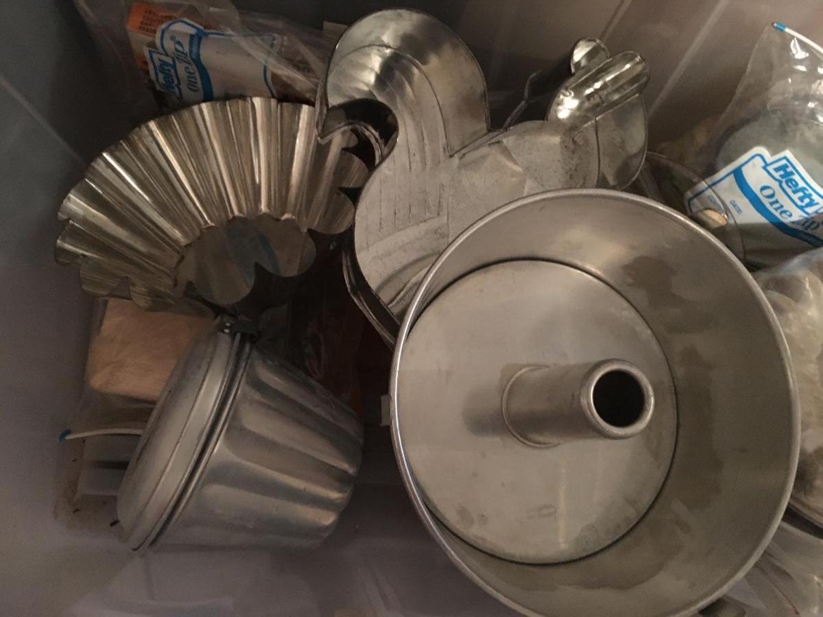 Large plastic bin filled with so many baking items, many vintage. Molds, cake pans, angel food pan, tarts and so much more!