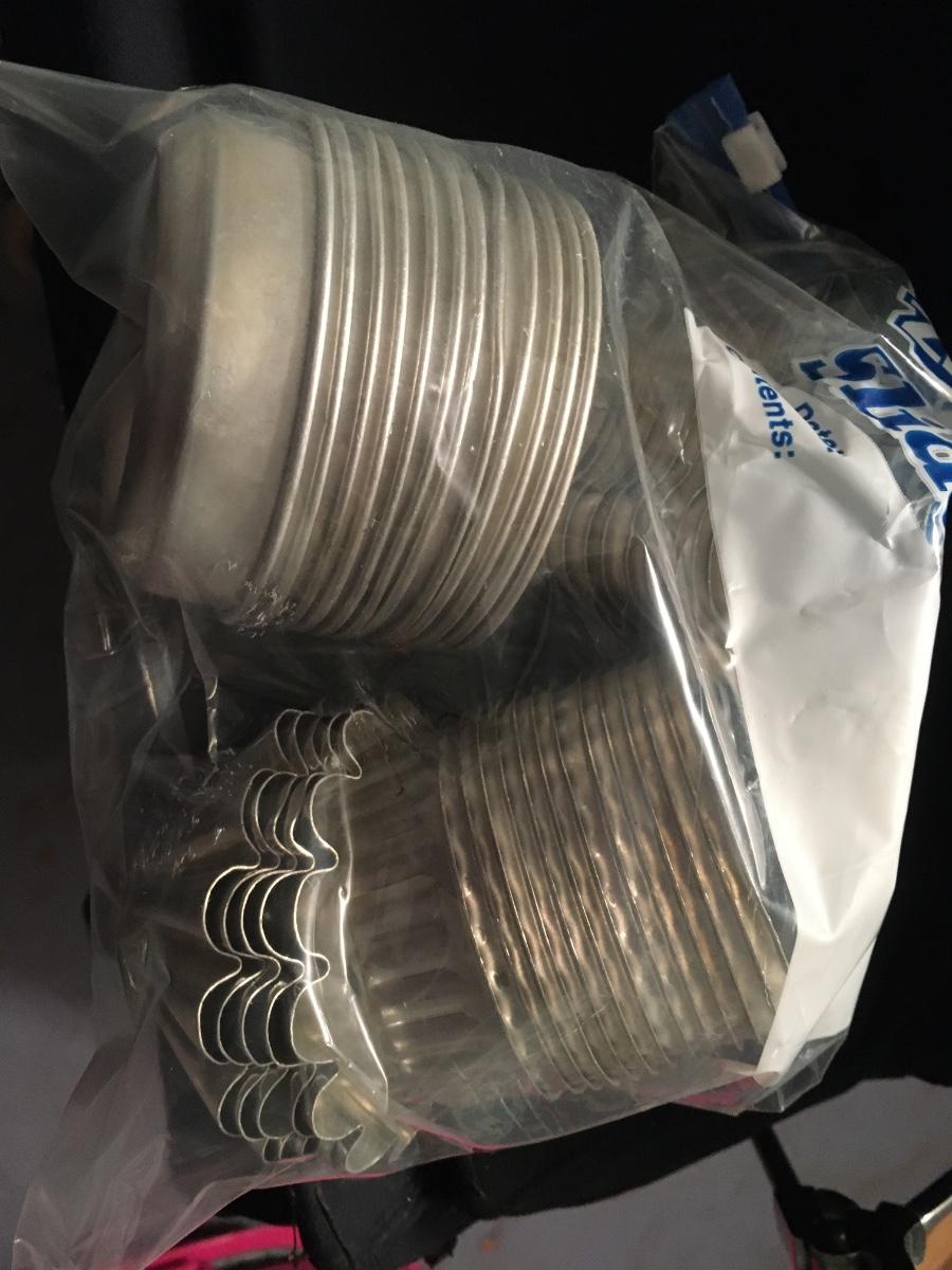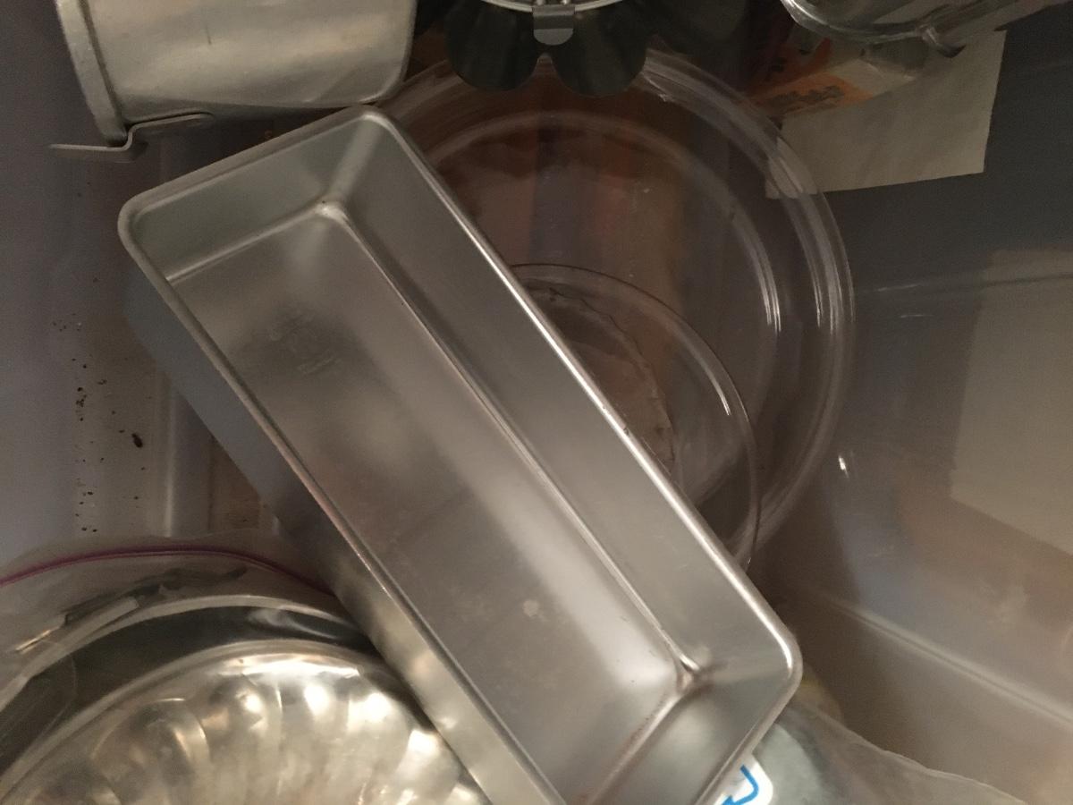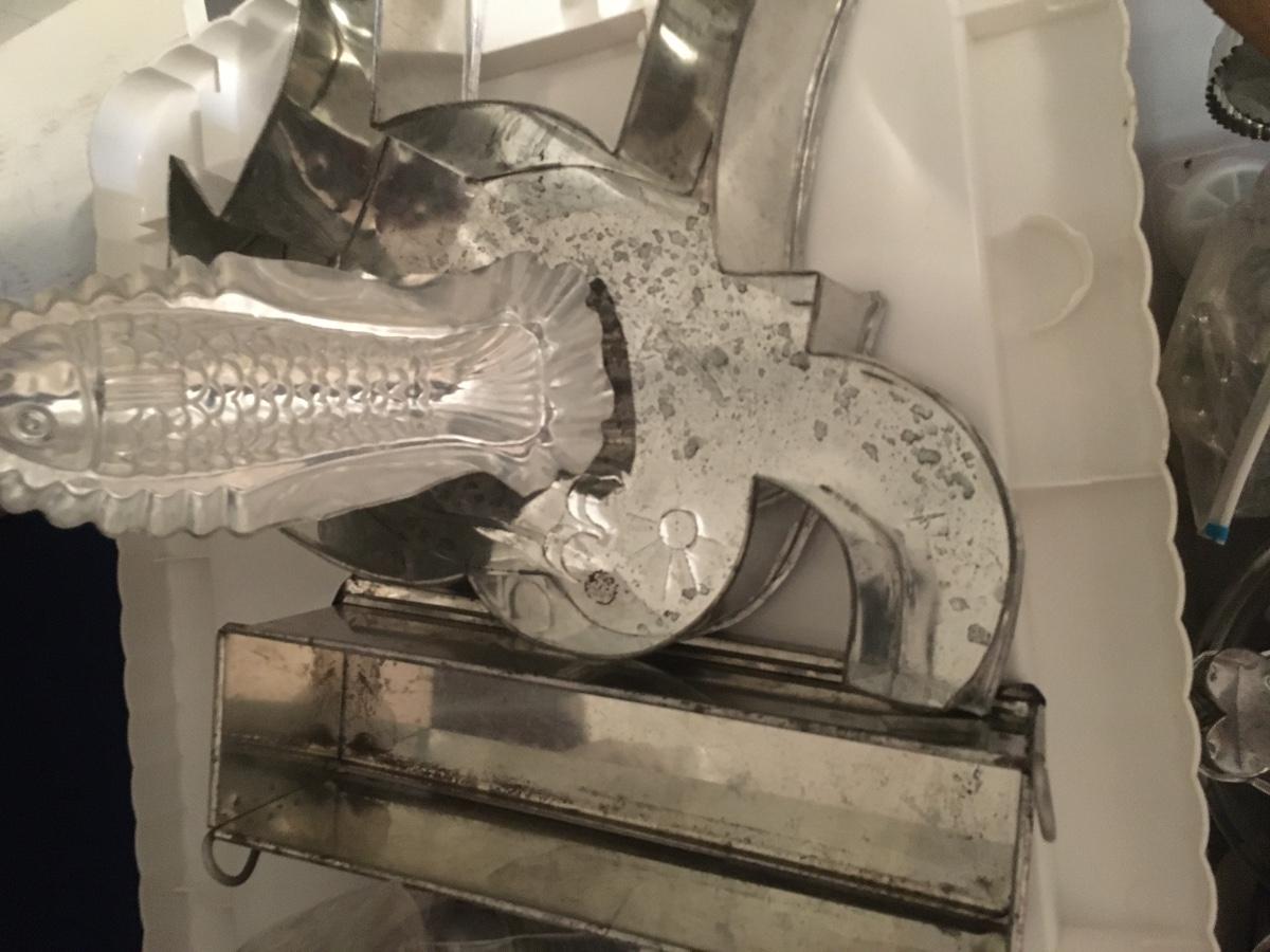 Large plastic bin filled with so many baking items, many vintage. Molds, cake pans, angel food pan, tarts and so much more!