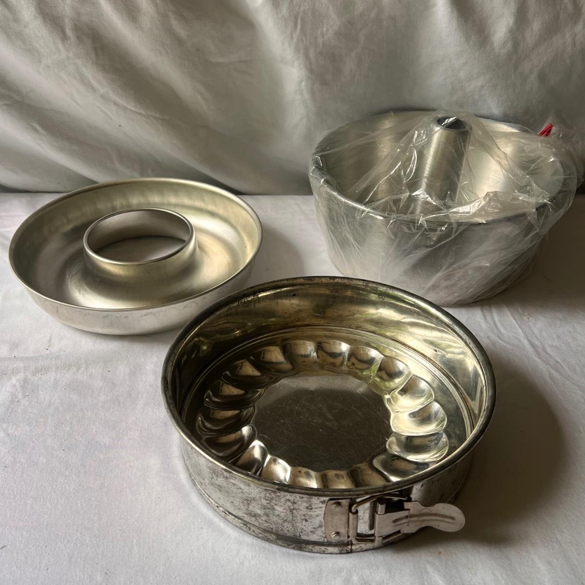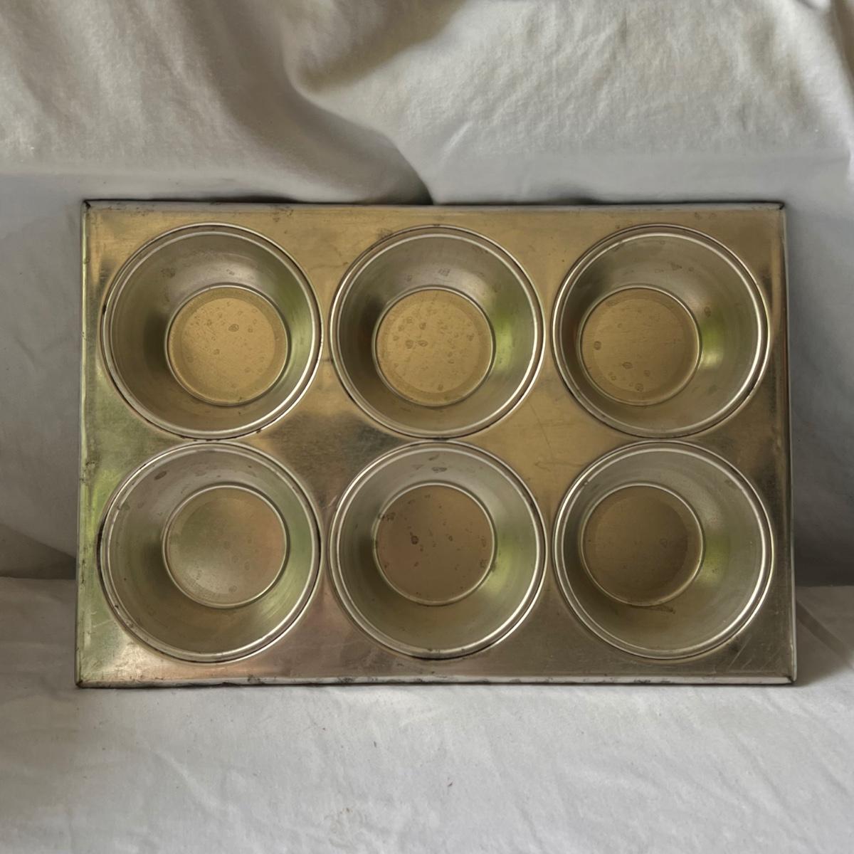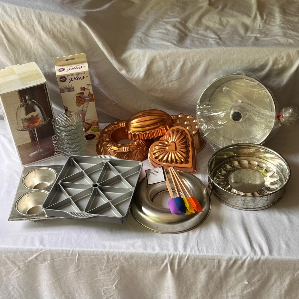 This lot includes seven cake trays in various sizes, four small spatulas and scrapers, one large muffin pan, eight small dessert dishes, one glass footed dessert dome, one Wilton’s dessert decorator, and one mini scone pan. The large muffin pan measures 13.5” x 9”H. The small glass dessert dishes individually measure 3.75”D x 2.25”H. One of the cake pans is branded with Kaiser on the bottom. Shipping available.