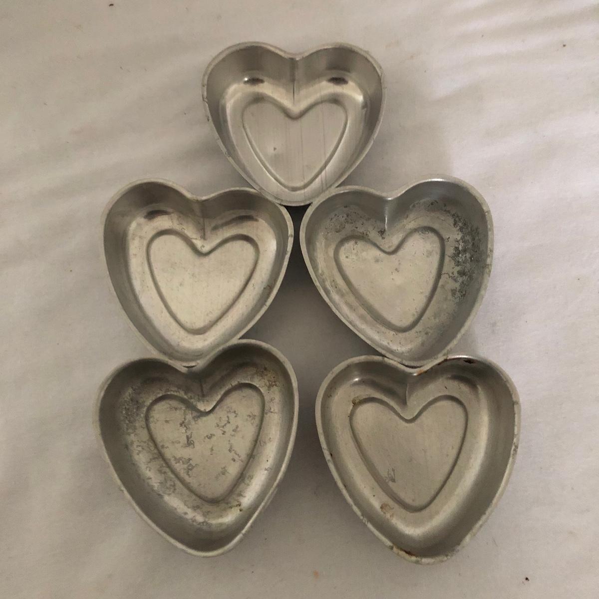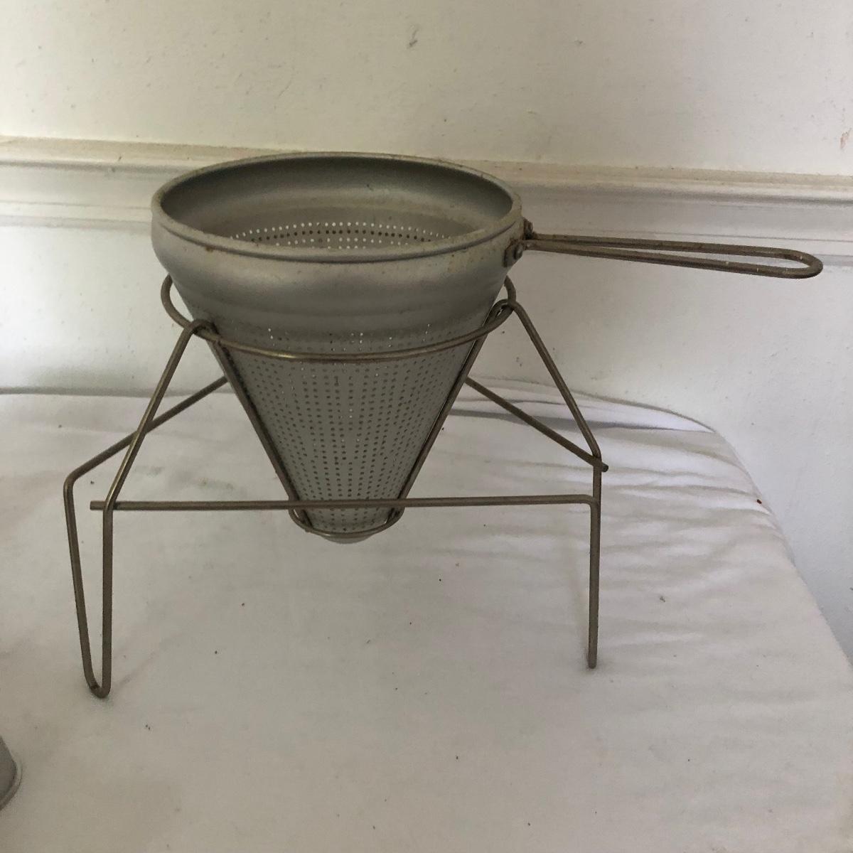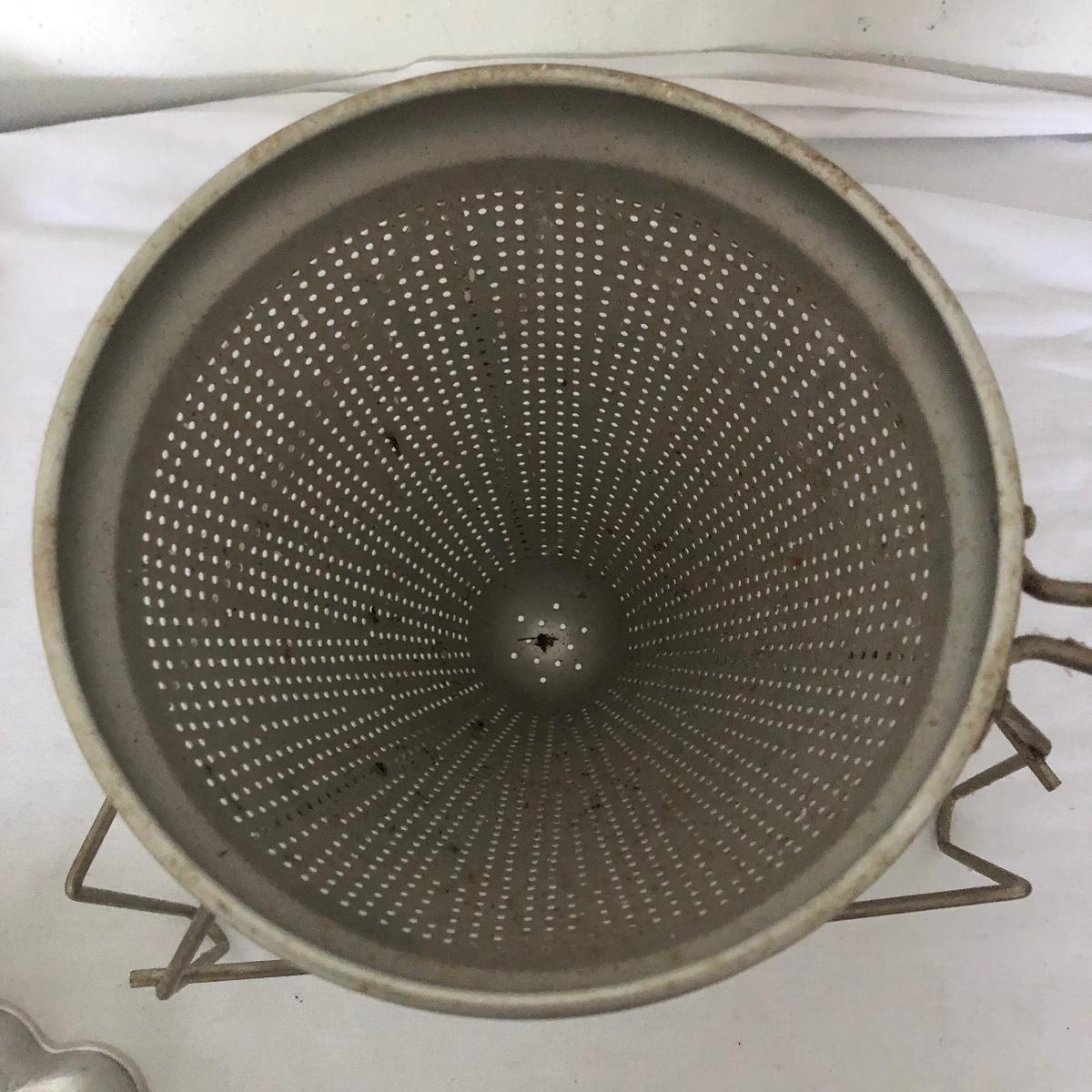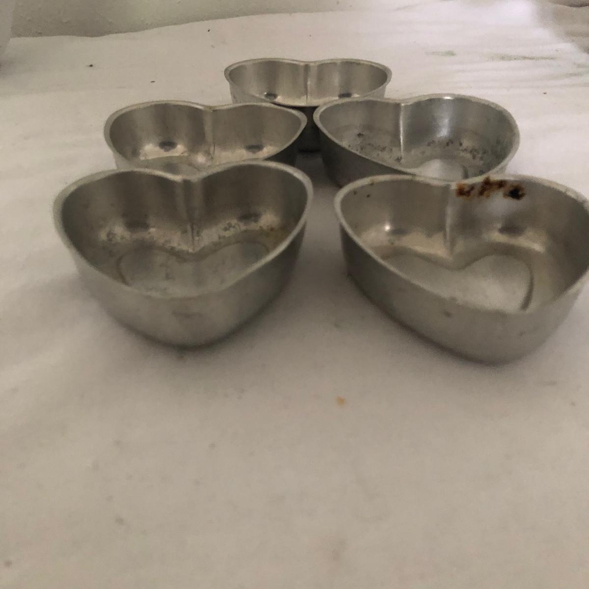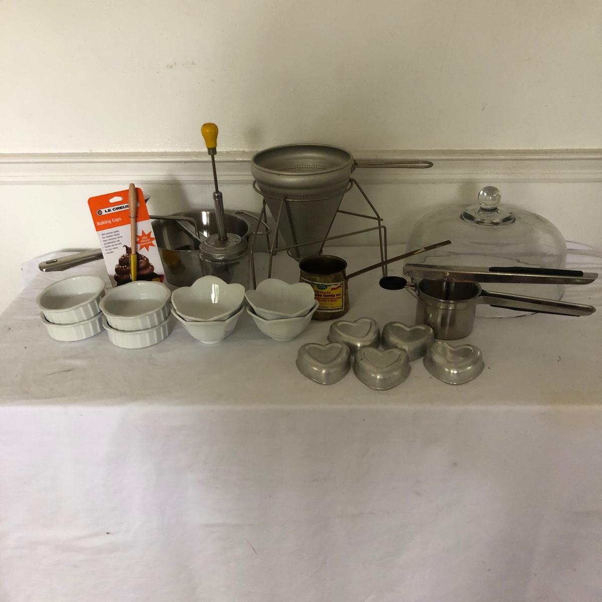 Lot includes glass cake cover, vintage sifter and stand, juicer, four ramekins, four small bowls, vintage chopper, five heart shaped pans, Greek brass coffee pot, baking cups and a sifter with handle. Glass cover measures 11”D x 8” tall.