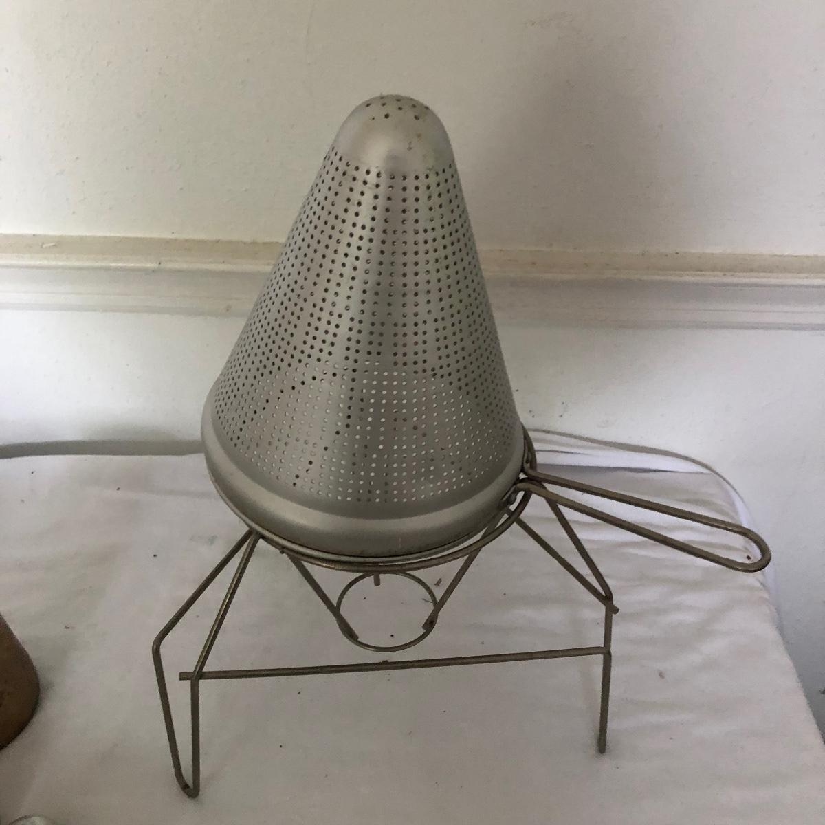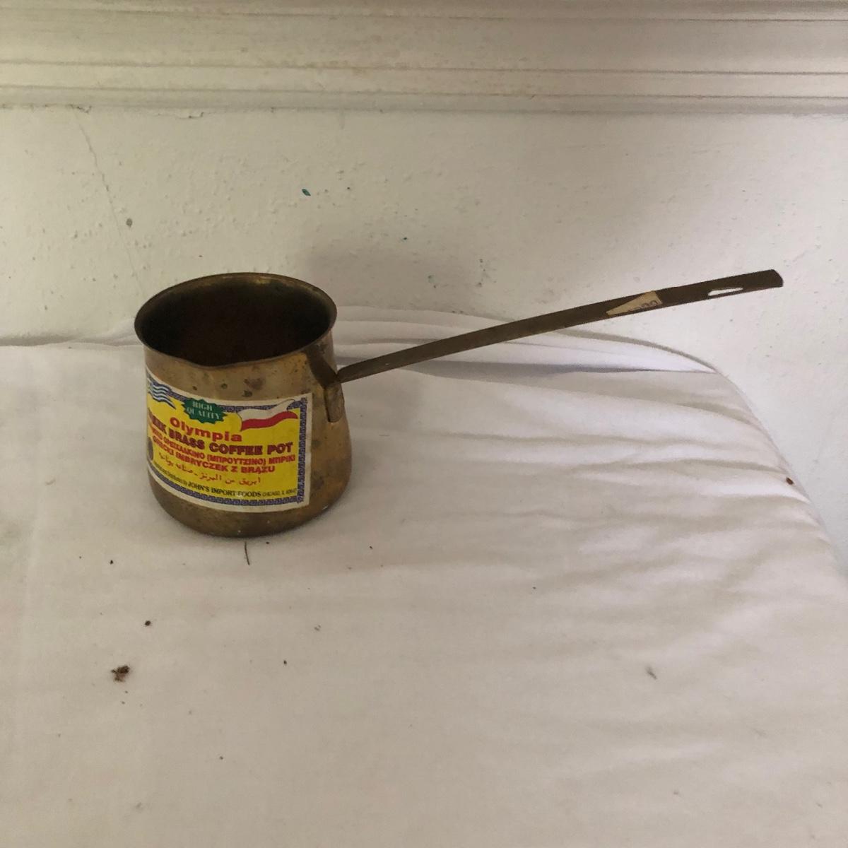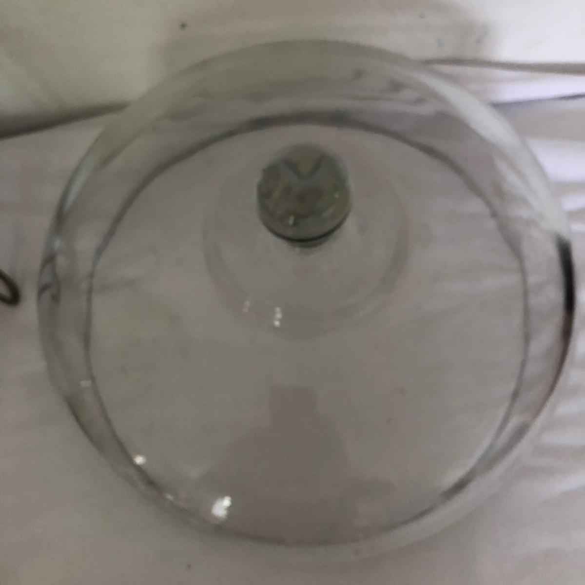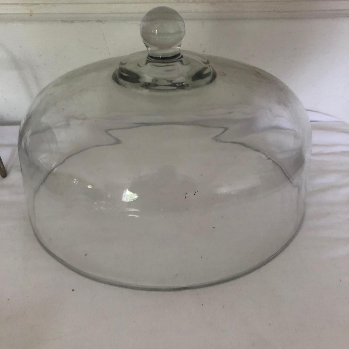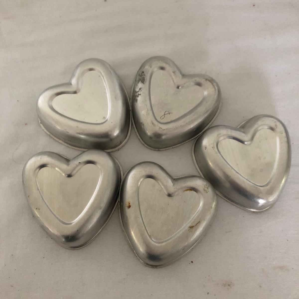 Lot includes glass cake cover, vintage sifter and stand, juicer, four ramekins, four small bowls, vintage chopper, five heart shaped pans, Greek brass coffee pot, baking cups and a sifter with handle. Glass cover measures 11”D x 8” tall.