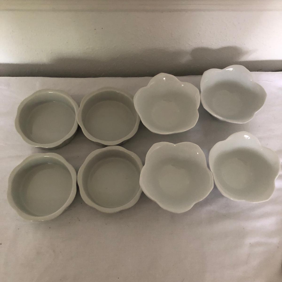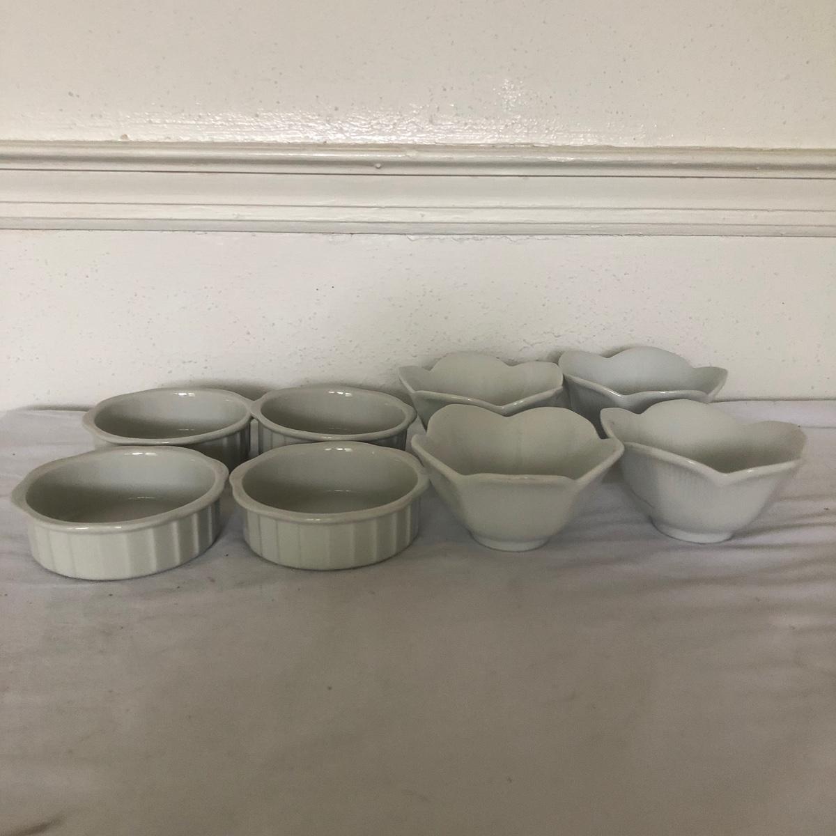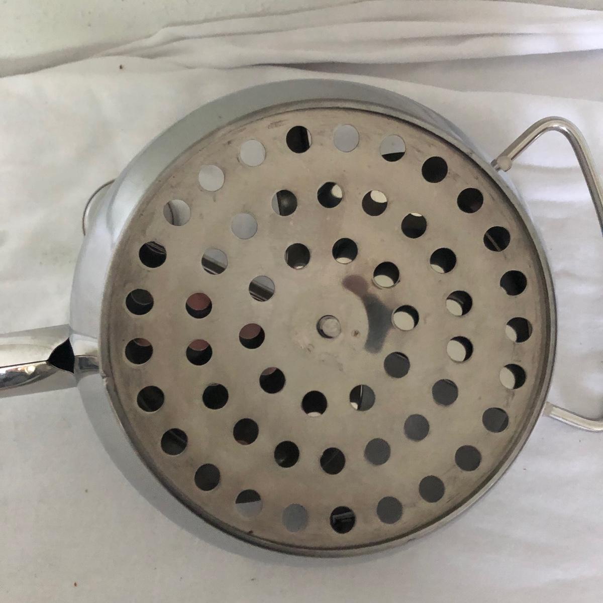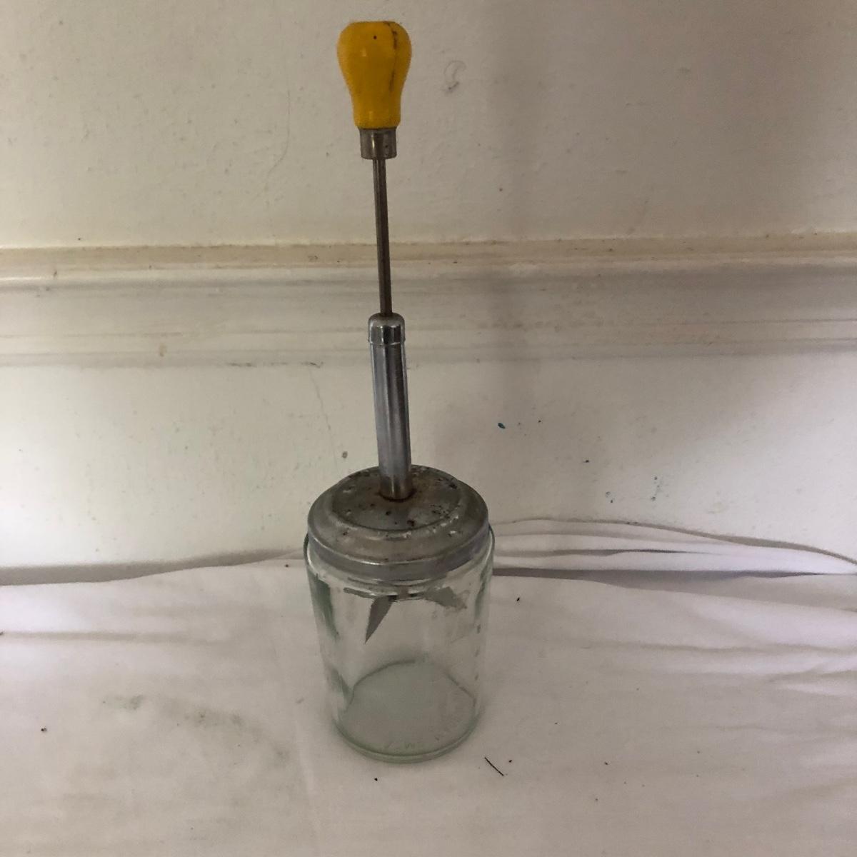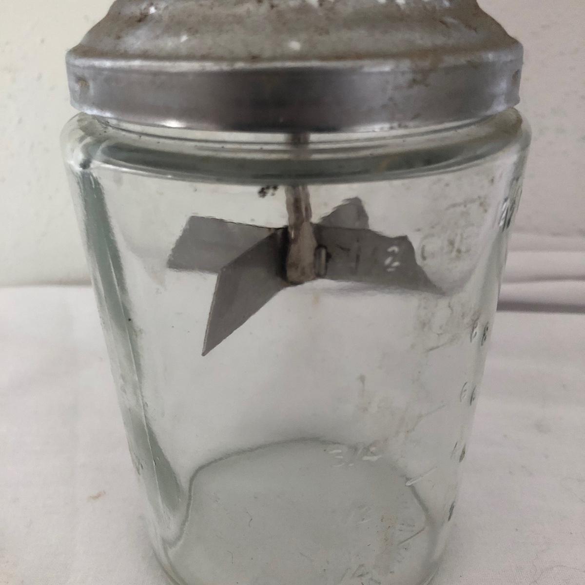 Lot includes glass cake cover, vintage sifter and stand, juicer, four ramekins, four small bowls, vintage chopper, five heart shaped pans, Greek brass coffee pot, baking cups and a sifter with handle. Glass cover measures 11”D x 8” tall.