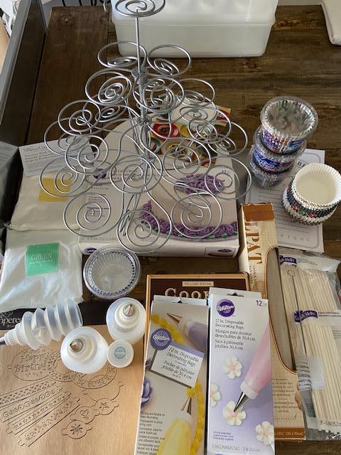 Cupcake stand/holder (23 cupcakes), Williams Sonoma Cookie Press w/18 cookie disks, Silpat, Sanding sugars x 2, Treat sticks, Disposable decorating bags x 2, Pampered Chef decorator bottle set, Williams Sonoma Royal Icing x 2 (green & yellow), 4 x packs halloween baking cups PLUS lots more, 10" cake circles, Martha Stewart cupcake & cookie stencils, Pampered Chef plate art & stencil set.