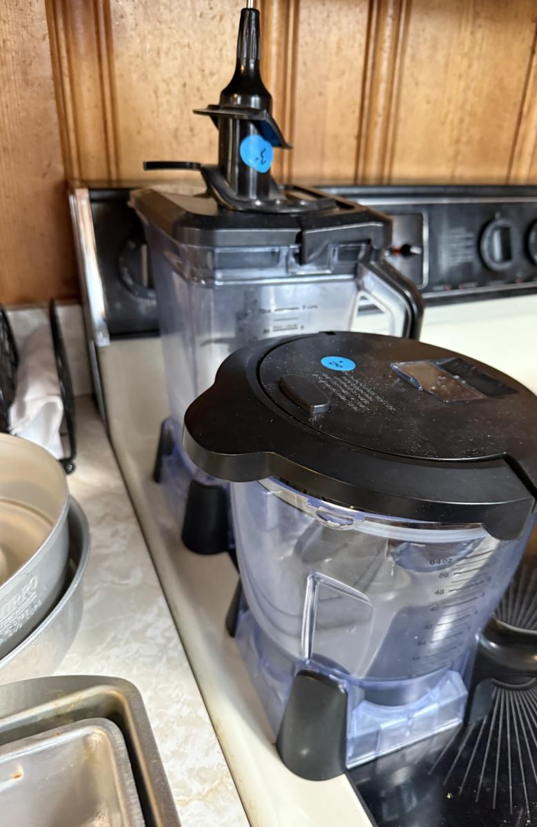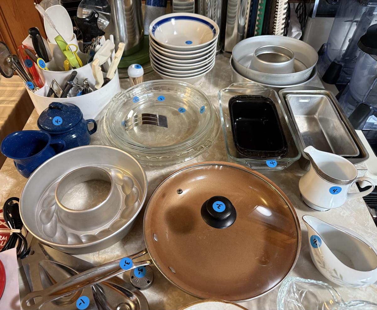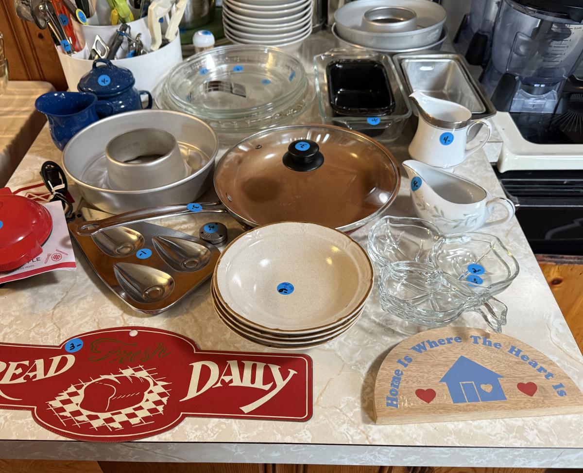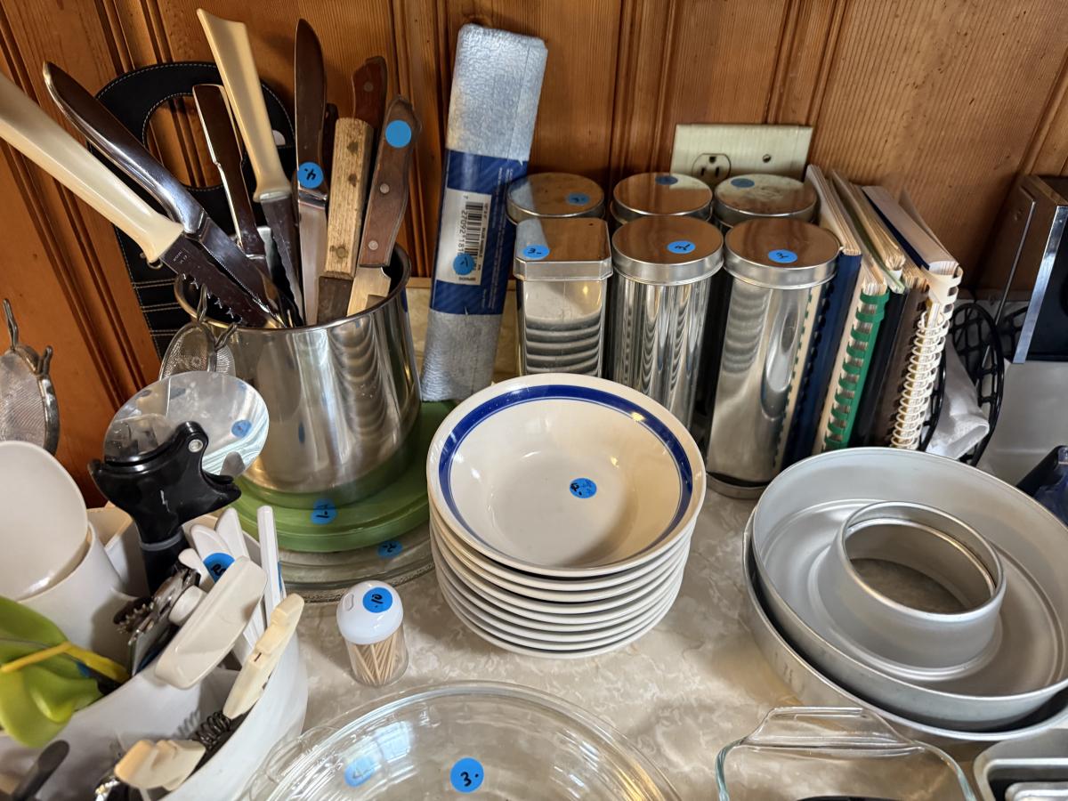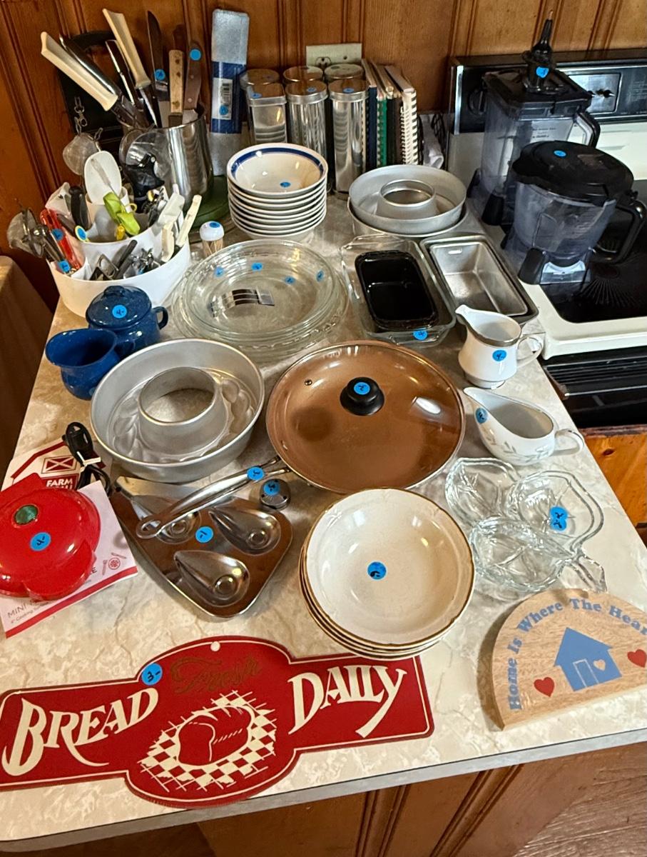 Baking pans, pot, bowls, cooking prep utensils, cookbooks, bread tubes, etc