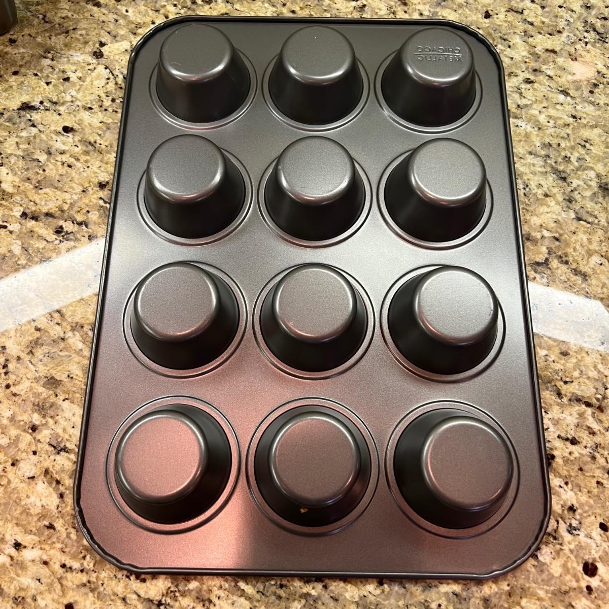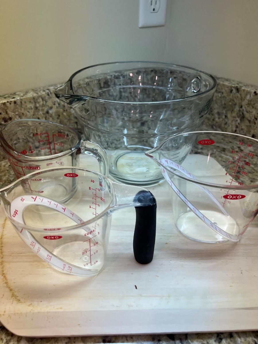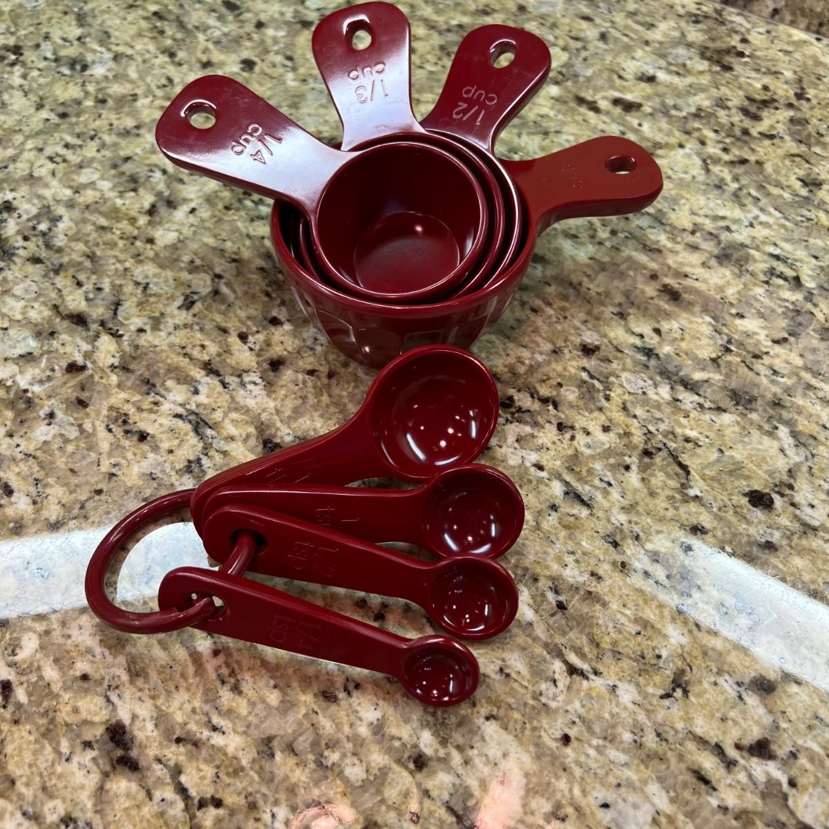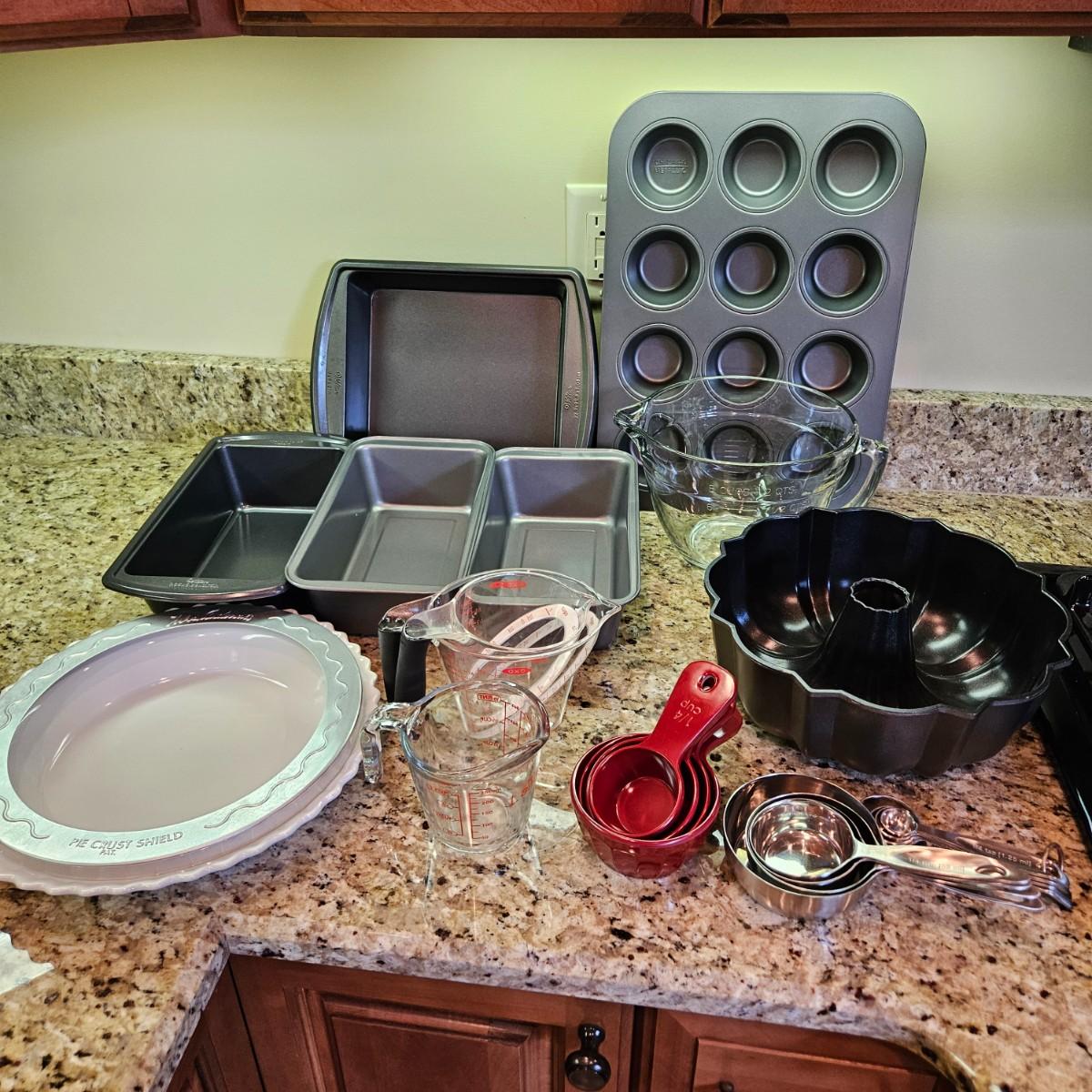 A terrific assortment of baking essentials! Includes a 10” round pie crust protector, a decorative white 9”D pie plate, a set of red plastic measuring cups and spoons. Items include one Pyrex 1 cup measuring cup two Oxo measuring cups, one 1 cup and one 2 cups. Also a large Pampered Chef 8 cup/ 2Qt. handled measuring cup. Also includes a set of stainless steel measuring cups and spoons, a metal baking dishes include one 9” x 9” x 2” square pan and three loaf pans, each 9.25” x 5.25” x 2.75”H. A 12 cup muffin pan and a 12 cup non-scratch Bundt pan.