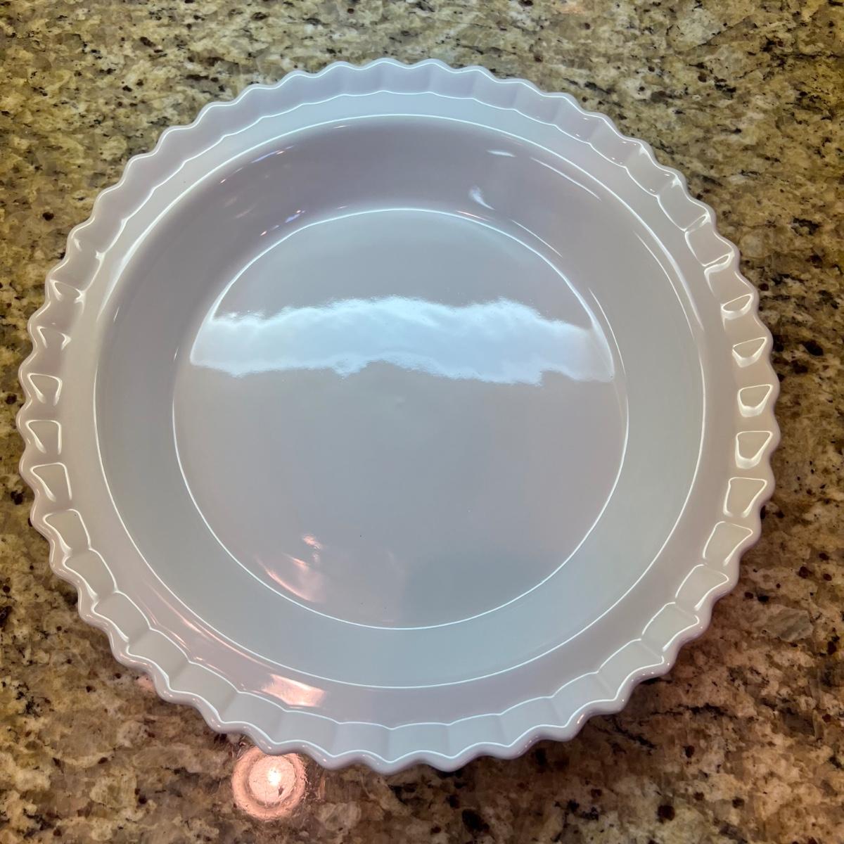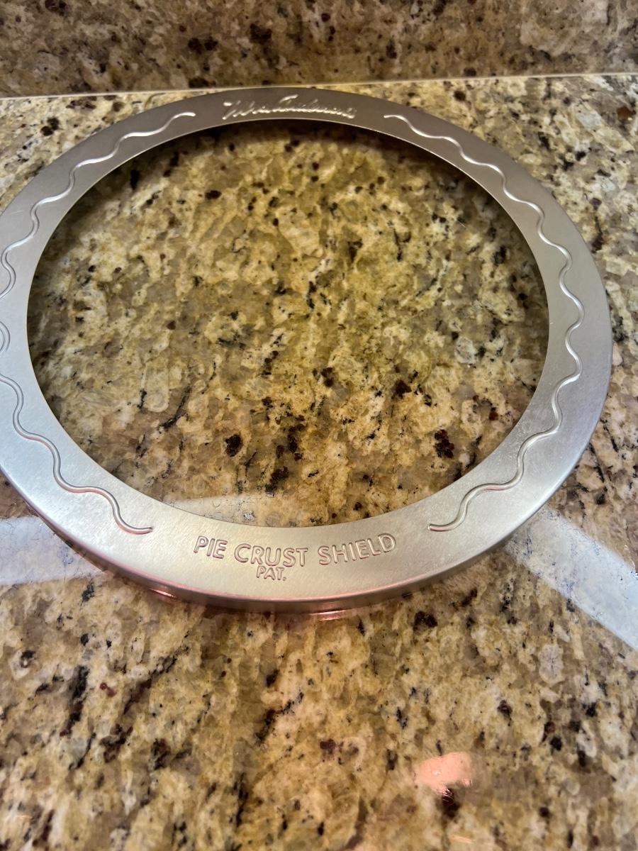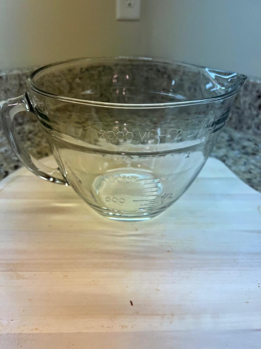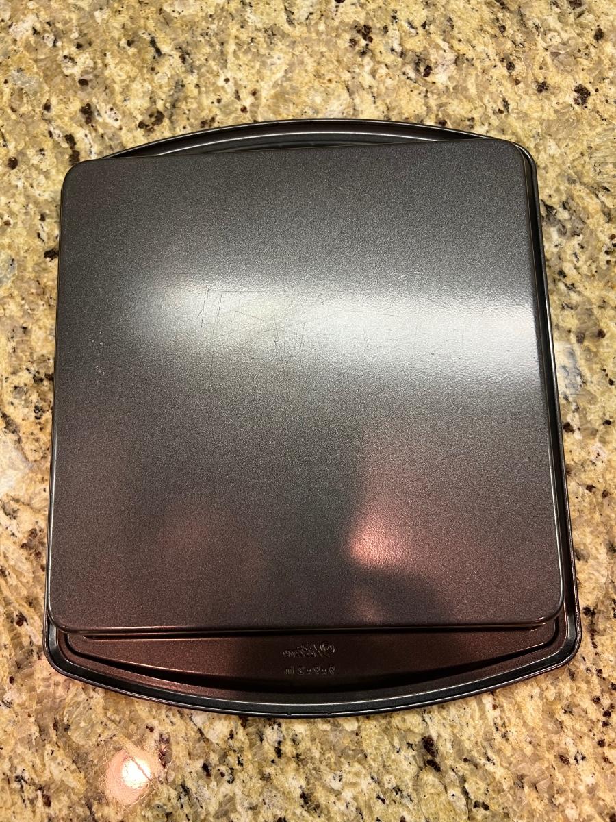 A terrific assortment of baking essentials! Includes a 10” round pie crust protector, a decorative white 9”D pie plate, a set of red plastic measuring cups and spoons. Items include one Pyrex 1 cup measuring cup two Oxo measuring cups, one 1 cup and one 2 cups. Also a large Pampered Chef 8 cup/ 2Qt. handled measuring cup. Also includes a set of stainless steel measuring cups and spoons, a metal baking dishes include one 9” x 9” x 2” square pan and three loaf pans, each 9.25” x 5.25” x 2.75”H. A 12 cup muffin pan and a 12 cup non-scratch Bundt pan.