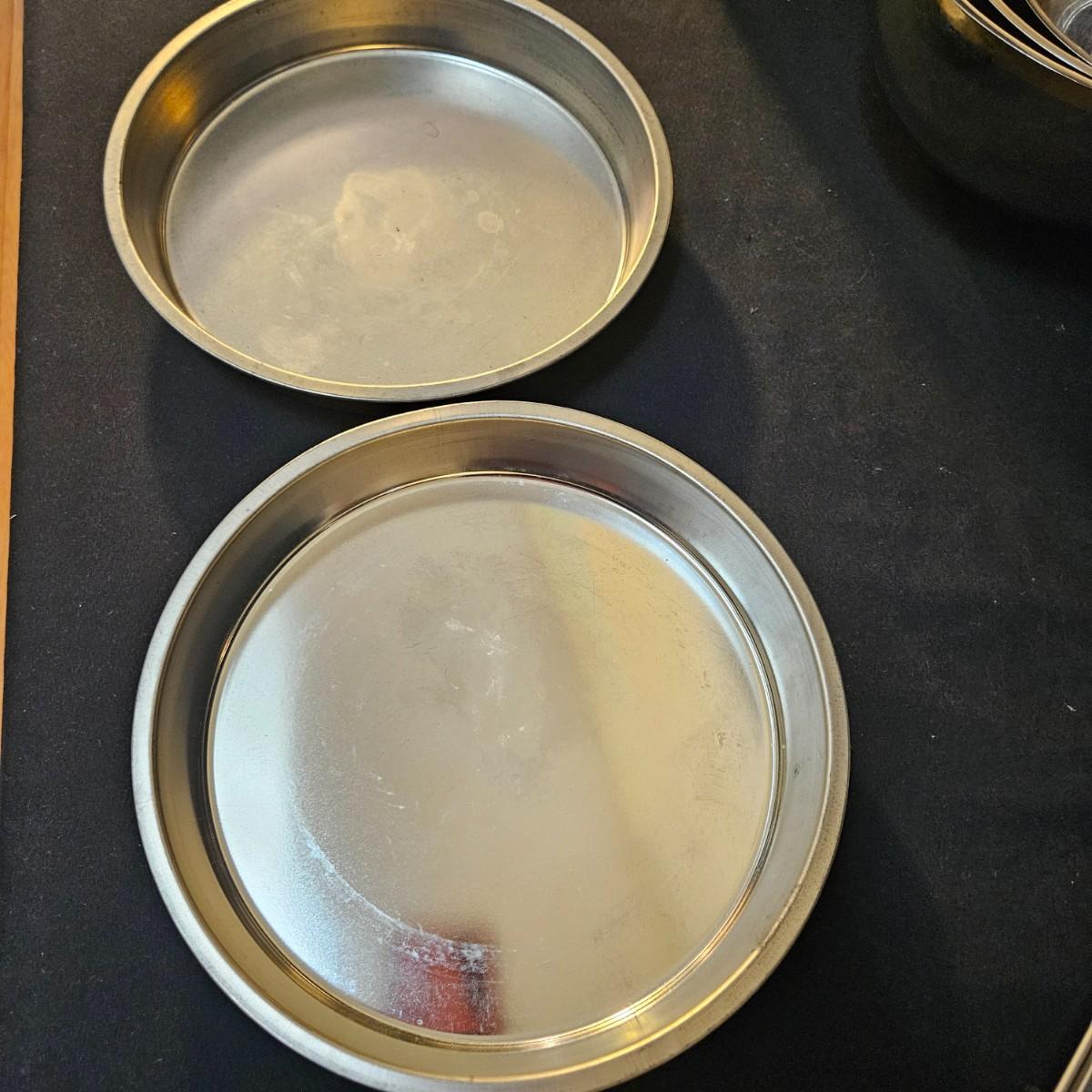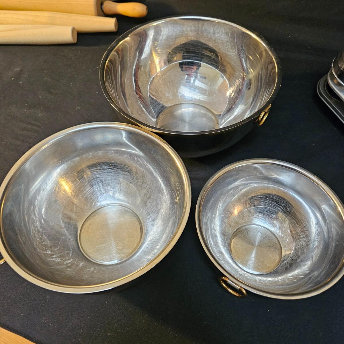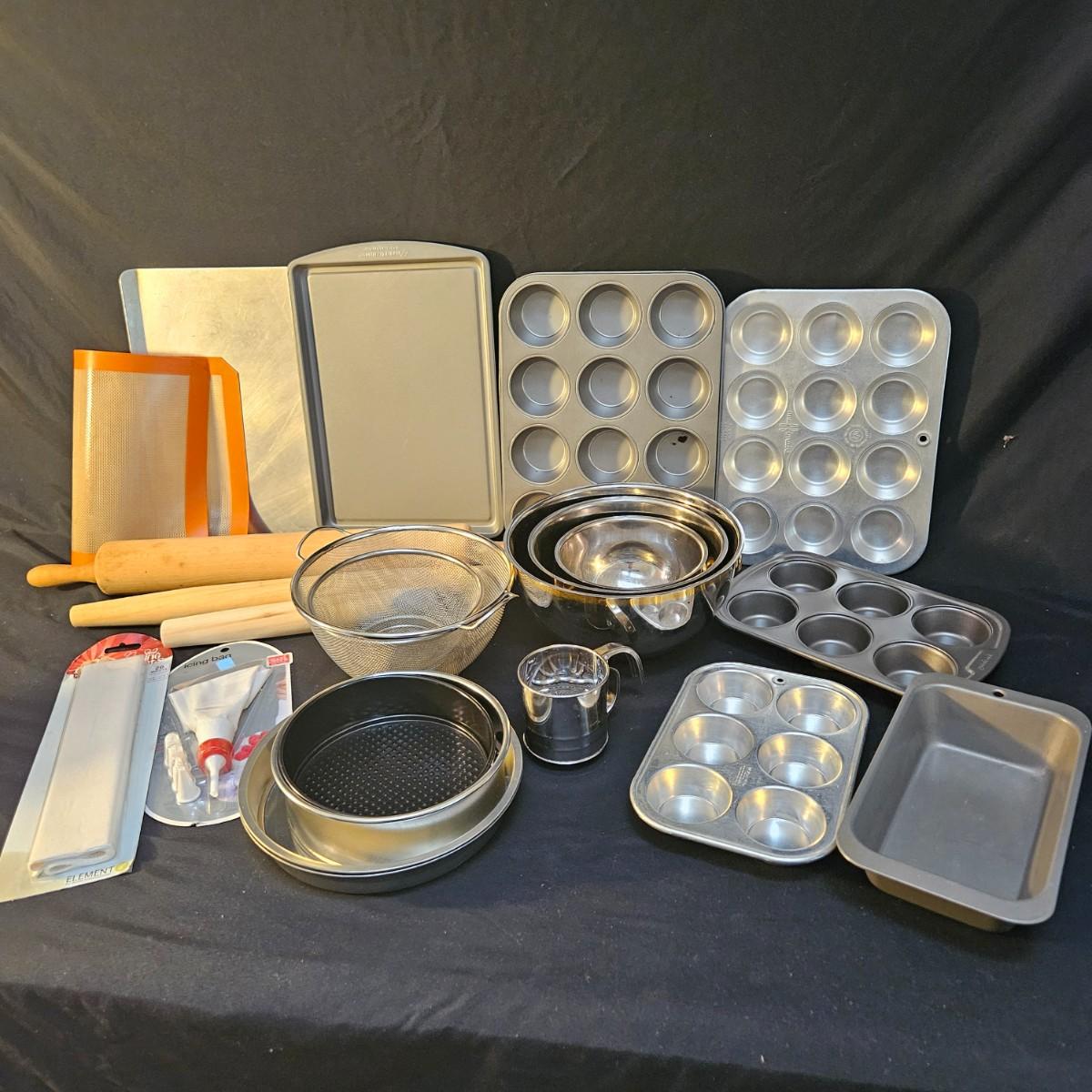 An assortment of baking essentials that includes baking pans, mixing bowls, rolling pins, muffin pans, strainers and more. See attached pictures for complete inventory. Local pickup only.
