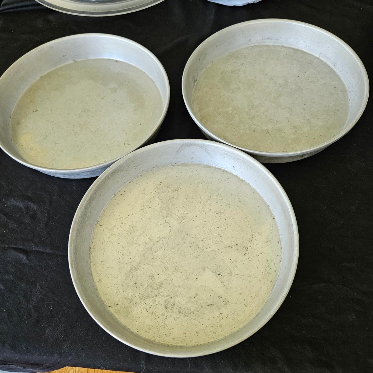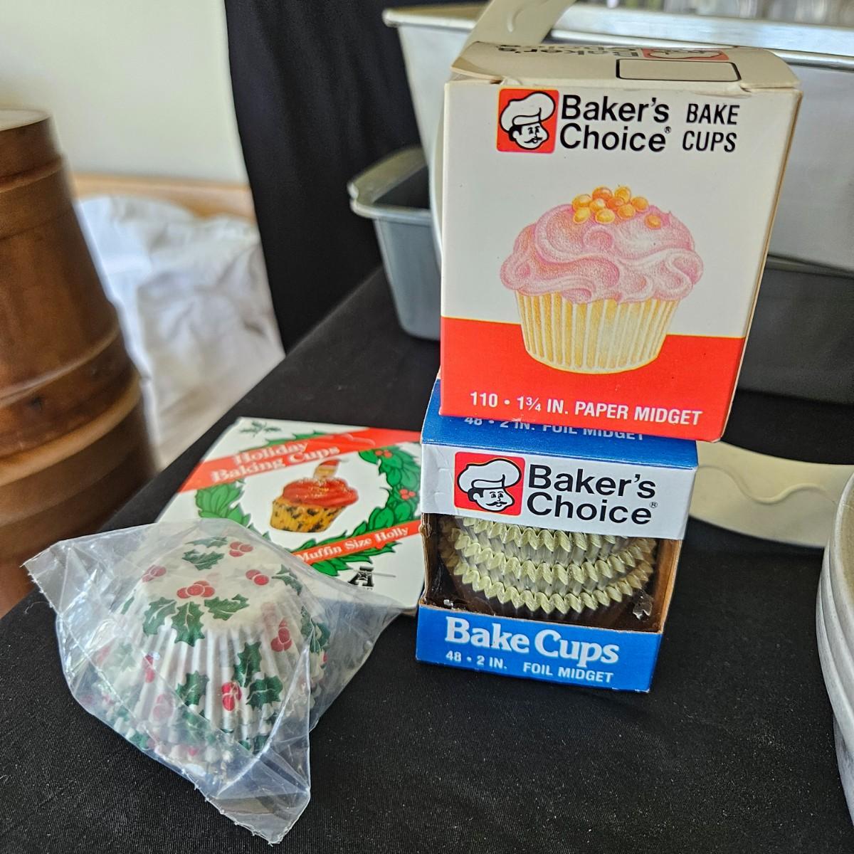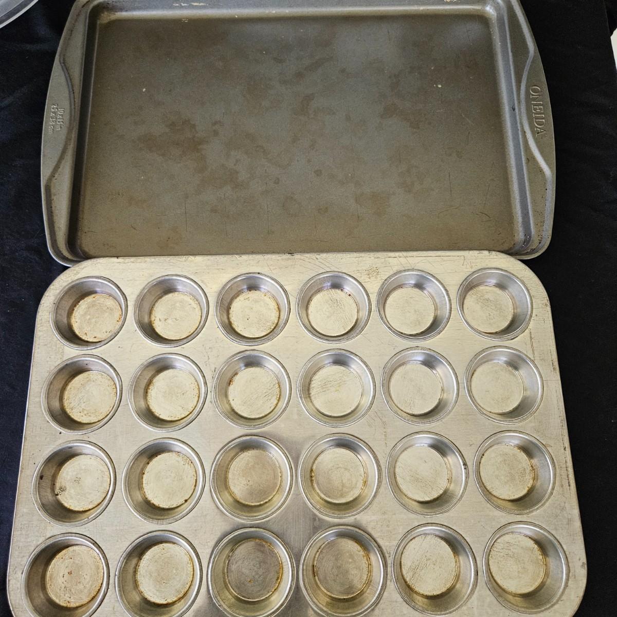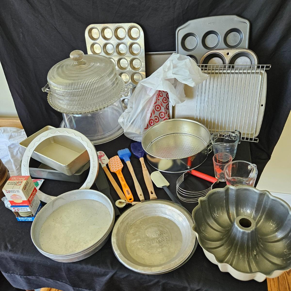 An assortment of baking essentials that includes muffin pans, baking sheets, bunt pans, measuring cups, cookie cutters, bread pans, baking utensils, cake plates amd more. The largest covered cake plate is made of glass and measures approximately 30"D x 7"H. See attached pictures for full inventory. Local pickup only