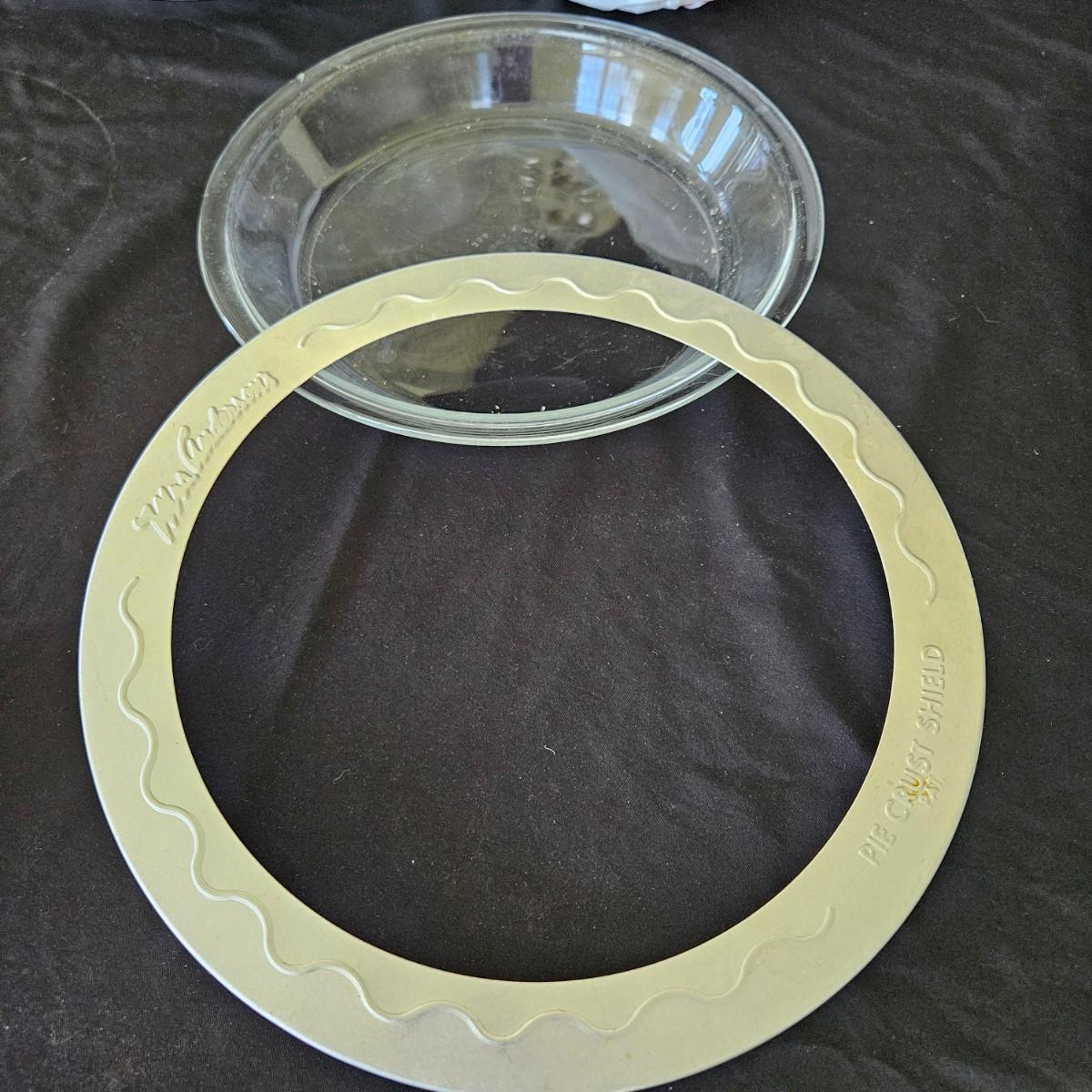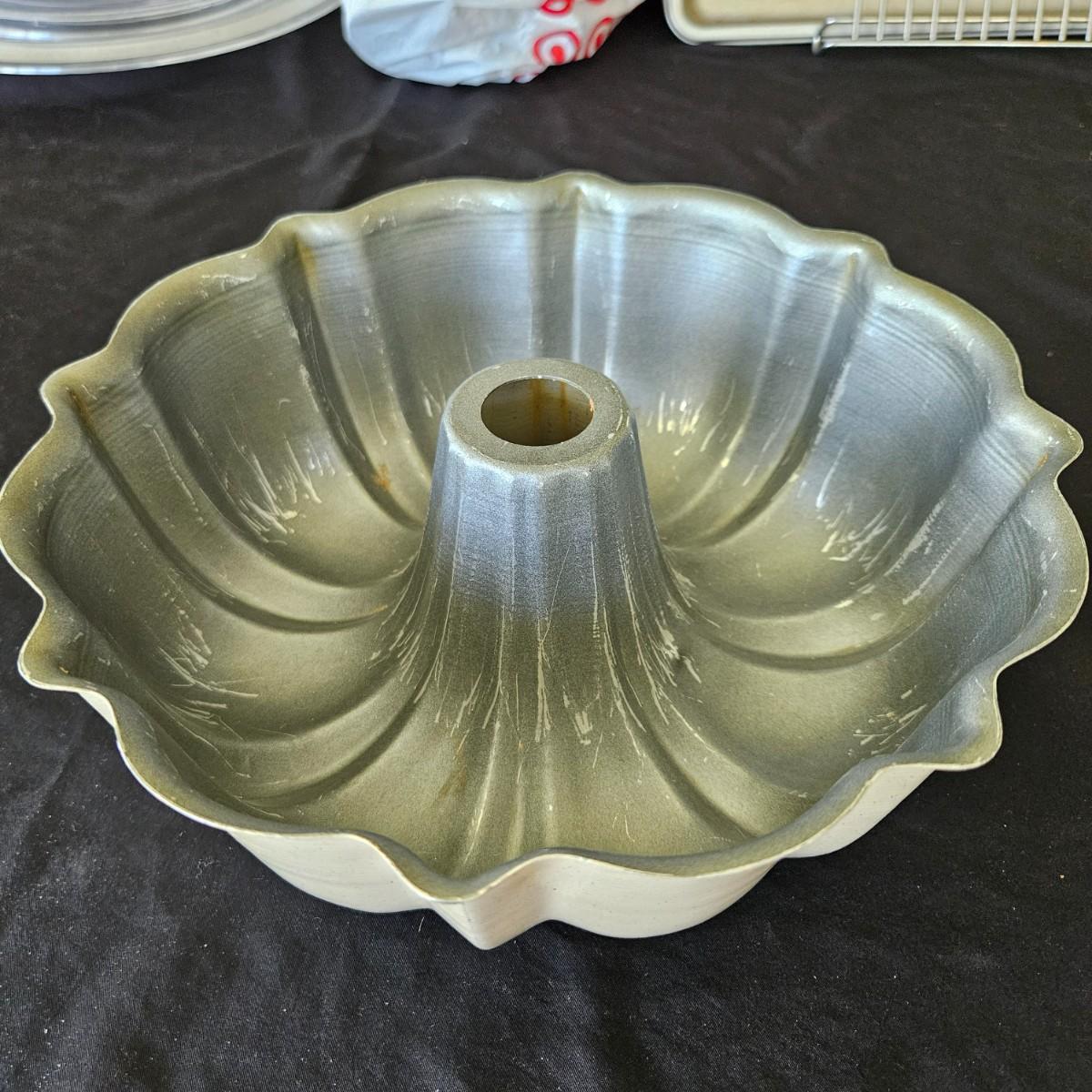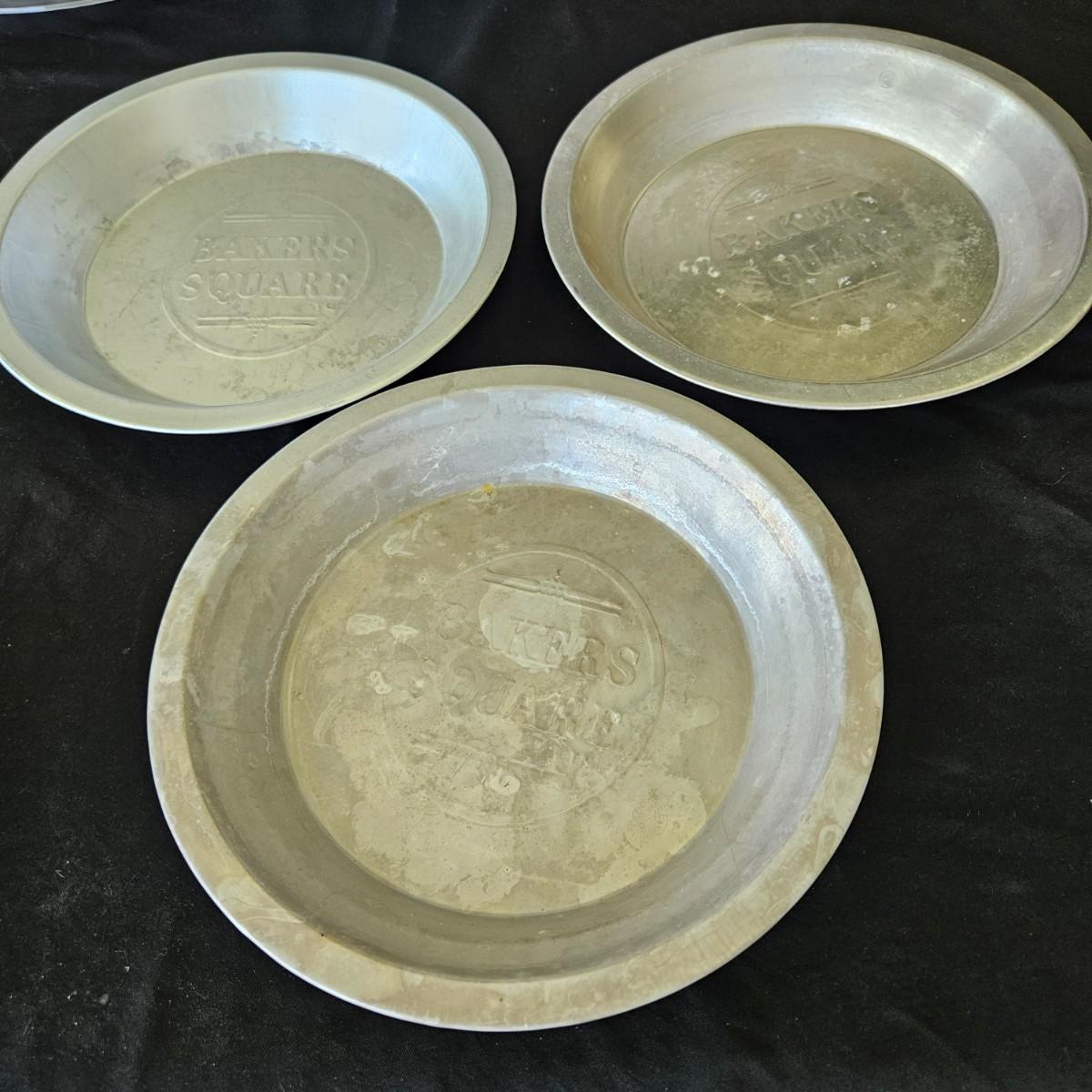 An assortment of baking essentials that includes muffin pans, baking sheets, bunt pans, measuring cups, cookie cutters, bread pans, baking utensils, cake plates amd more. The largest covered cake plate is made of glass and measures approximately 30"D x 7"H. See attached pictures for full inventory. Local pickup only