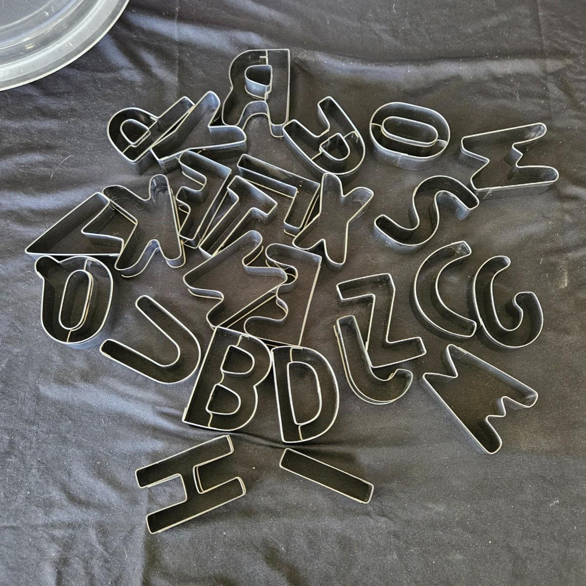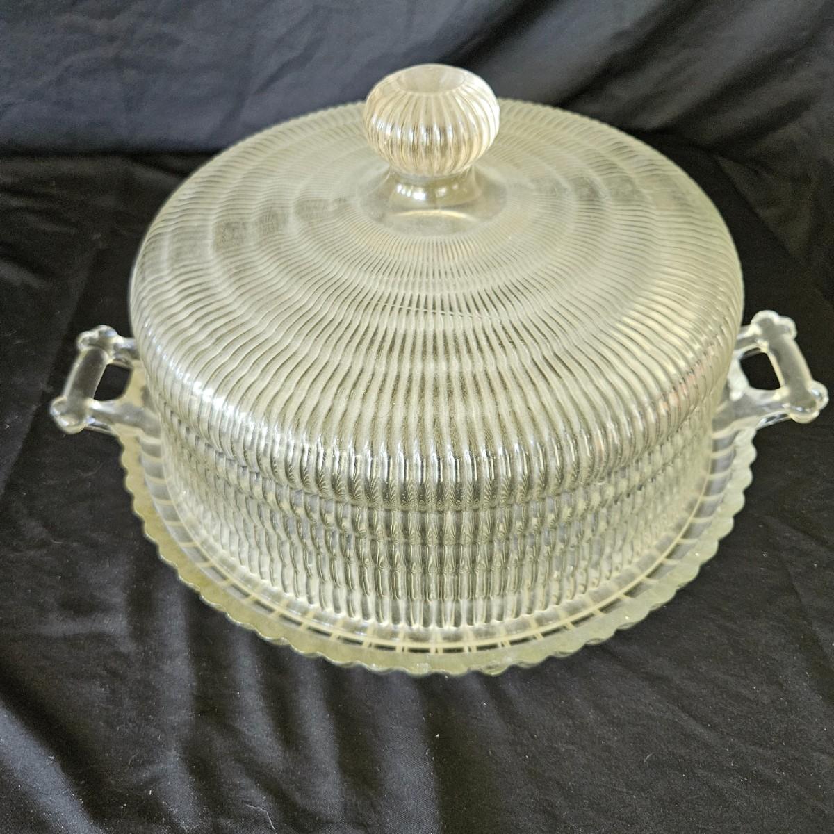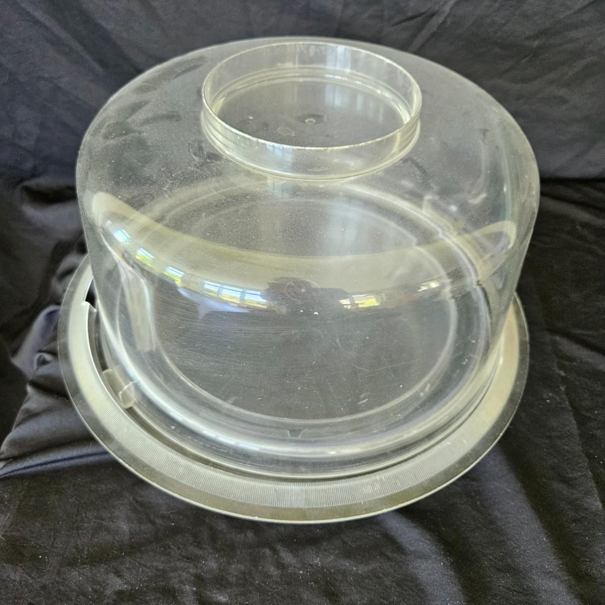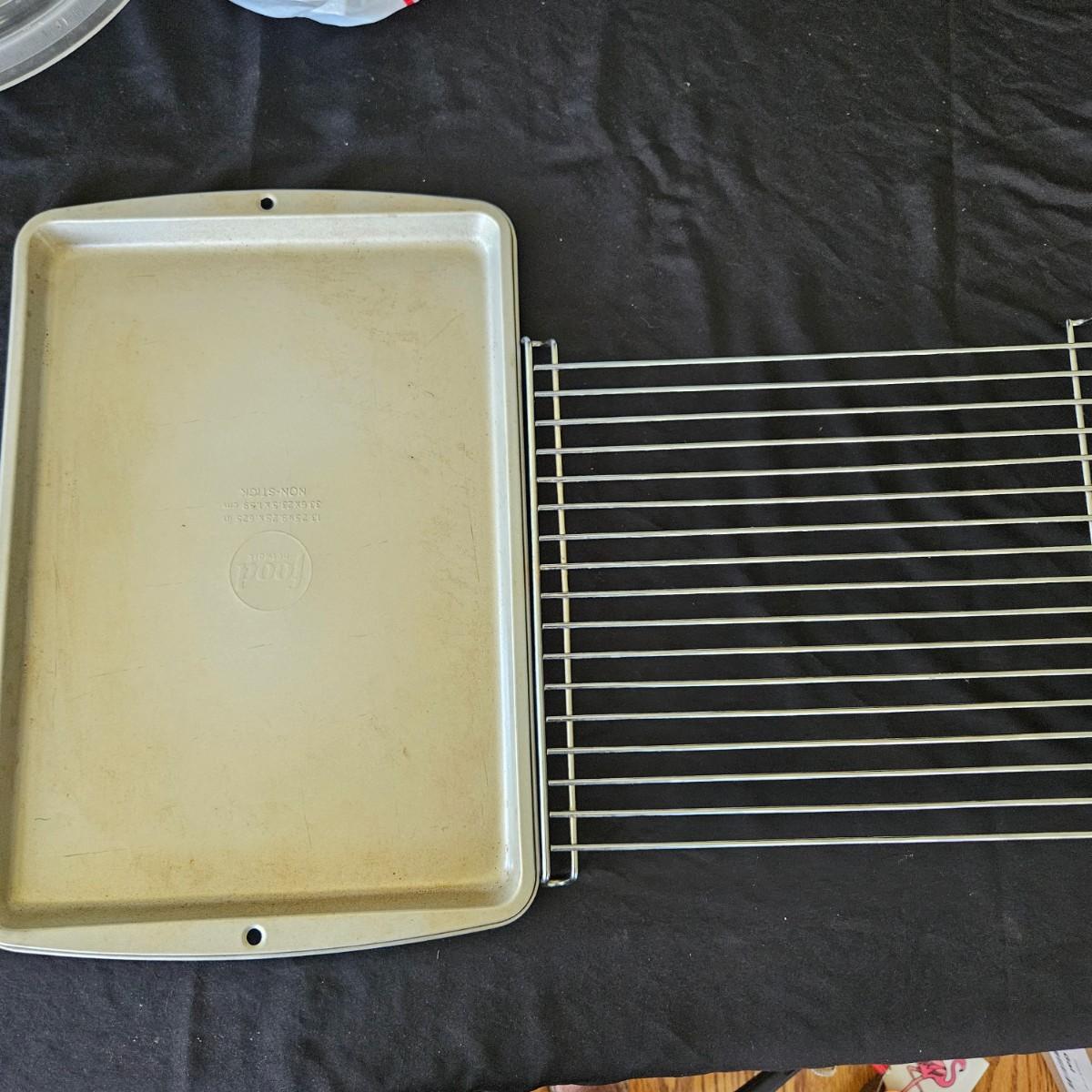 An assortment of baking essentials that includes muffin pans, baking sheets, bunt pans, measuring cups, cookie cutters, bread pans, baking utensils, cake plates amd more. The largest covered cake plate is made of glass and measures approximately 30"D x 7"H. See attached pictures for full inventory. Local pickup only