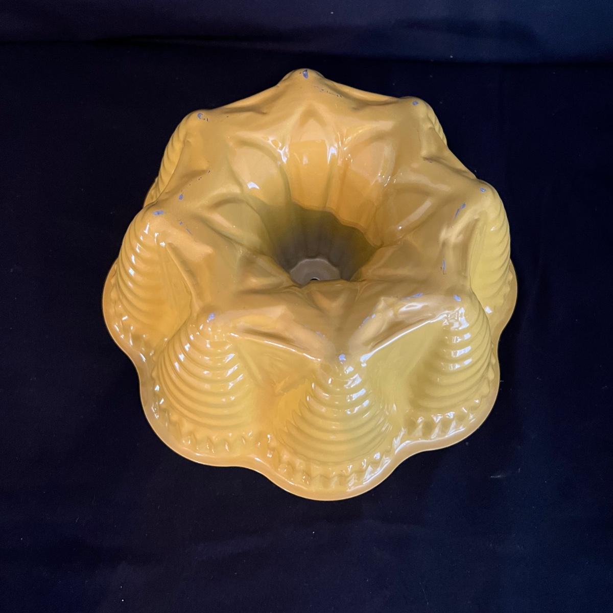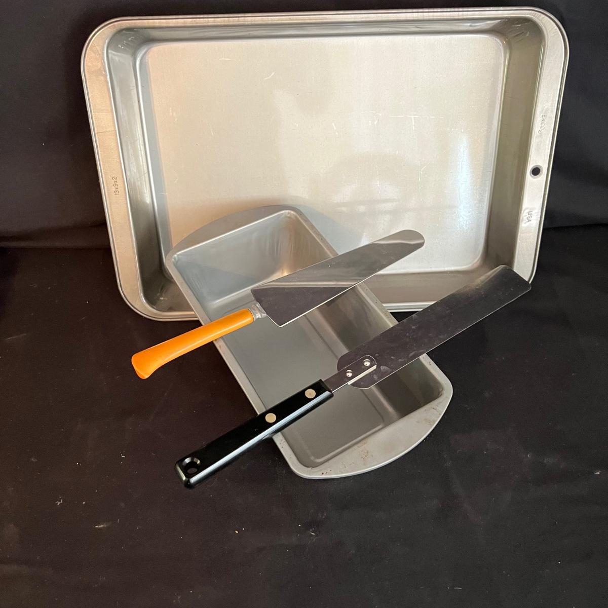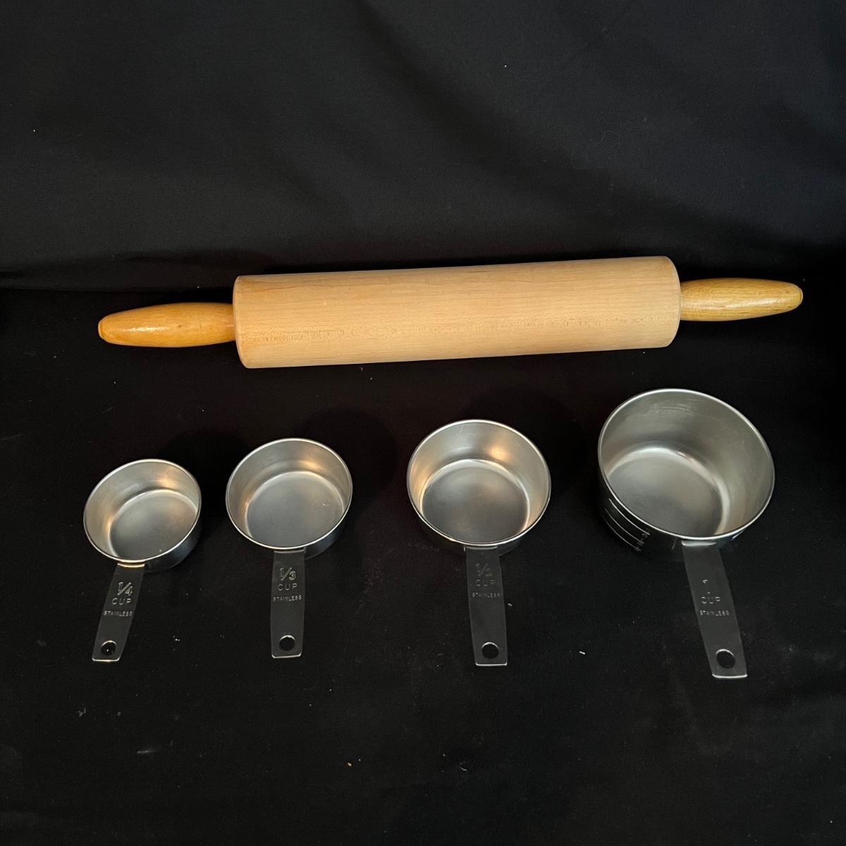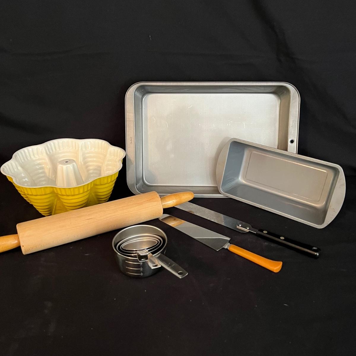 Six kitchen essentials. A 9.5” D x 3.75”H round bundt pan, a wooden rolling pin and four metal measuring cups. Also an 8.5” x 4.75” x 2.5” loaf pan, an Ekco 13” x 9” x 2” baking and two cake spatulas.