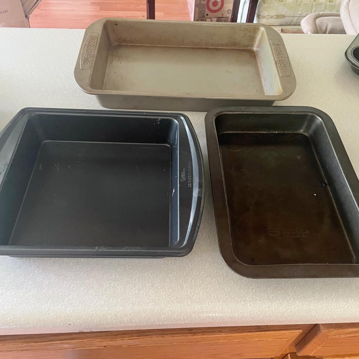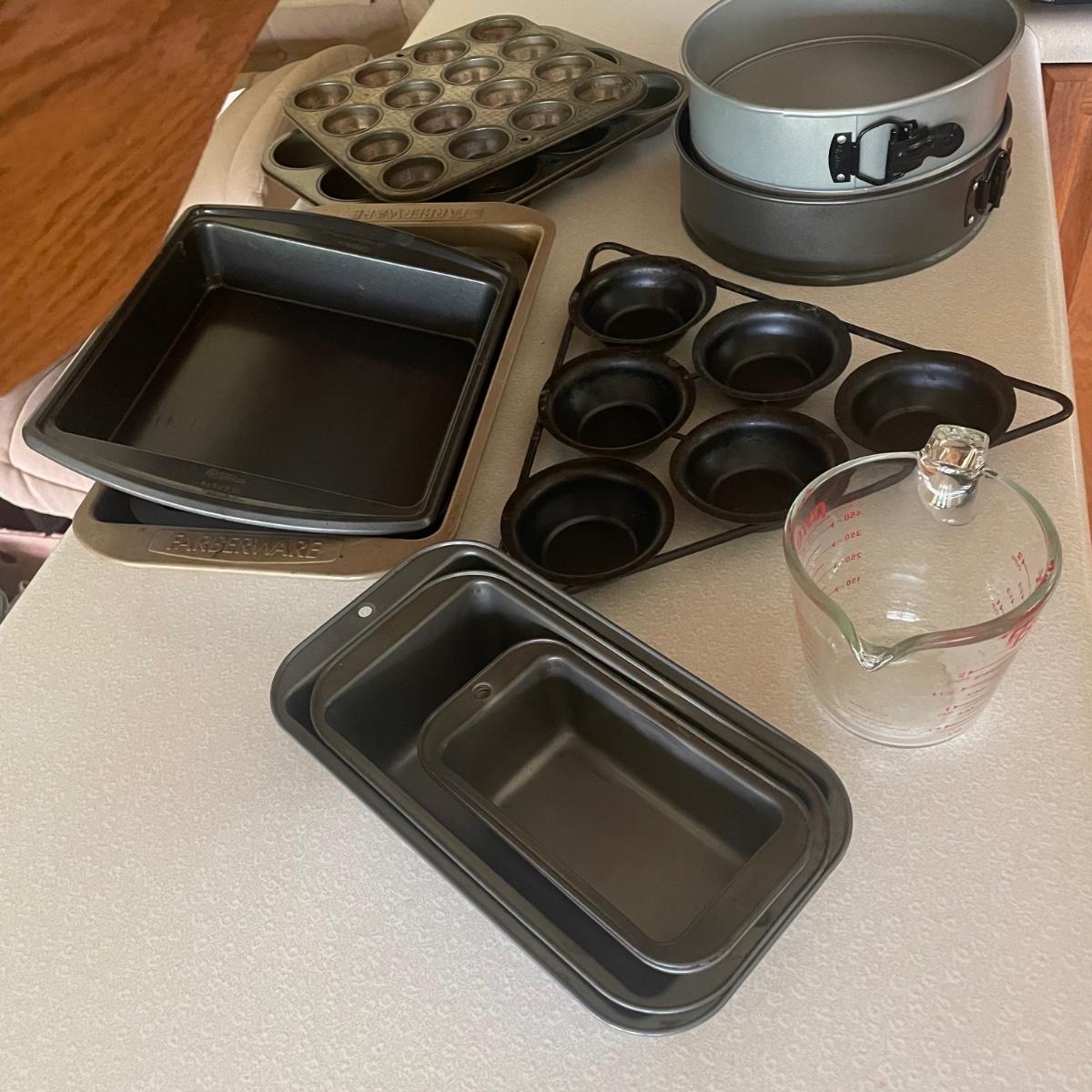 This handy baking lot includes cake tins, cupcake tins and tins in all shapes and sizes plus a Pyrex glass measuring jug.