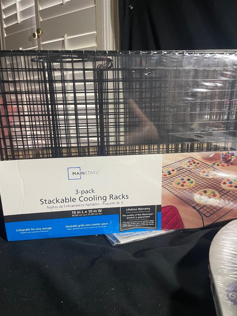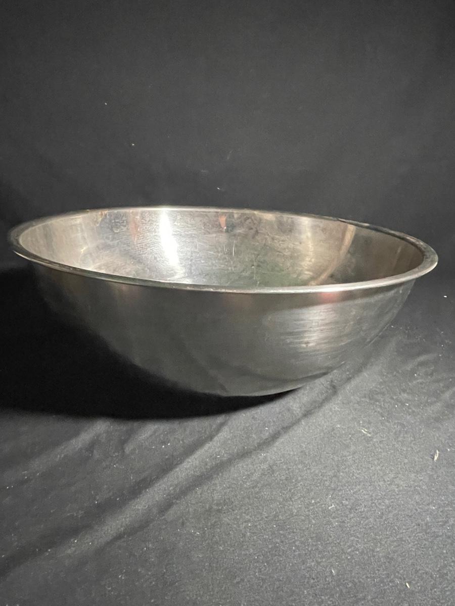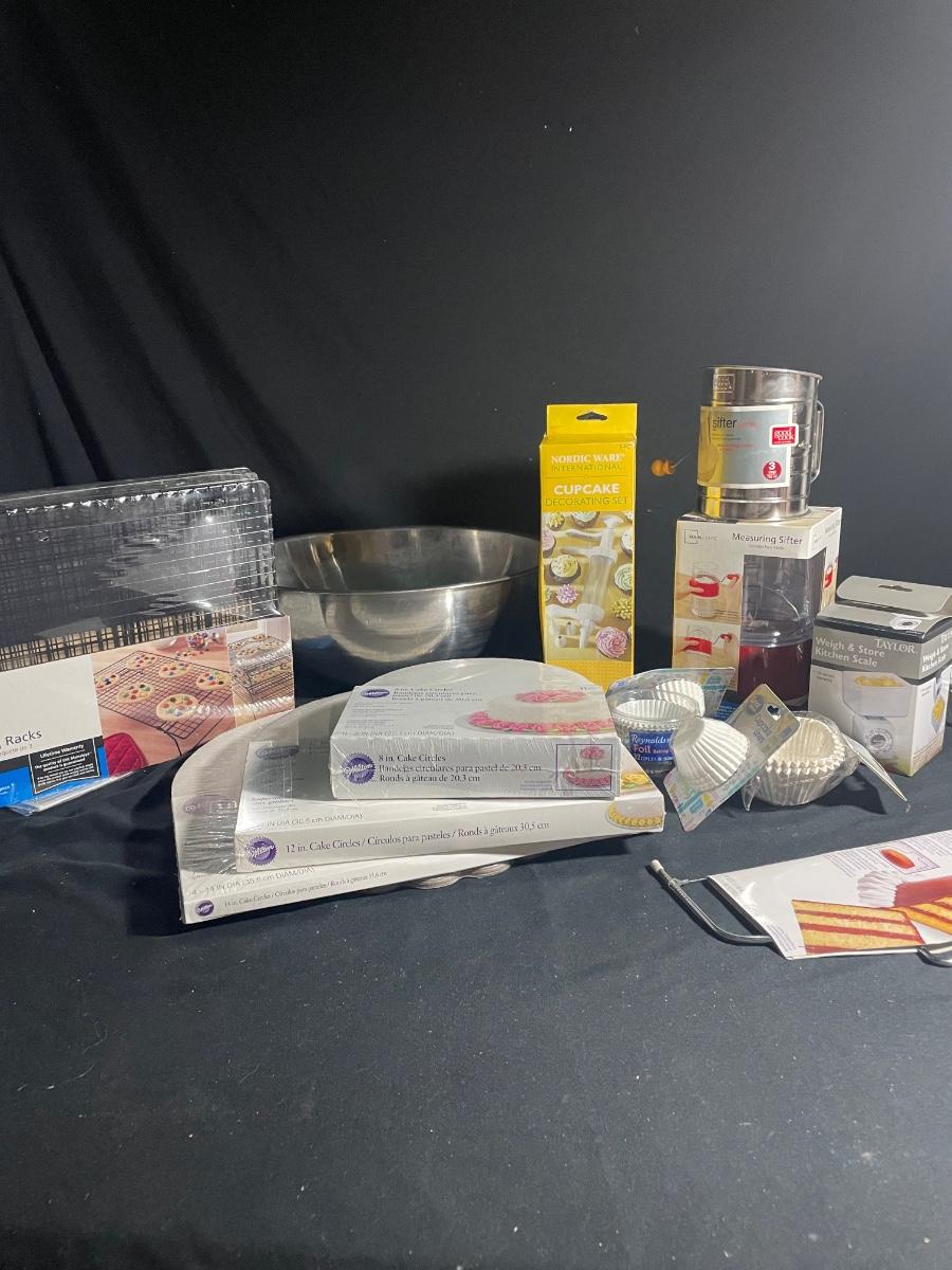 This lot includes a large metal mixing bowl that measures 16” d x 6” tall; this is the only used item and does have a dent on its underside, everything else is new and includes scales, sifters, cooling racks and much more.