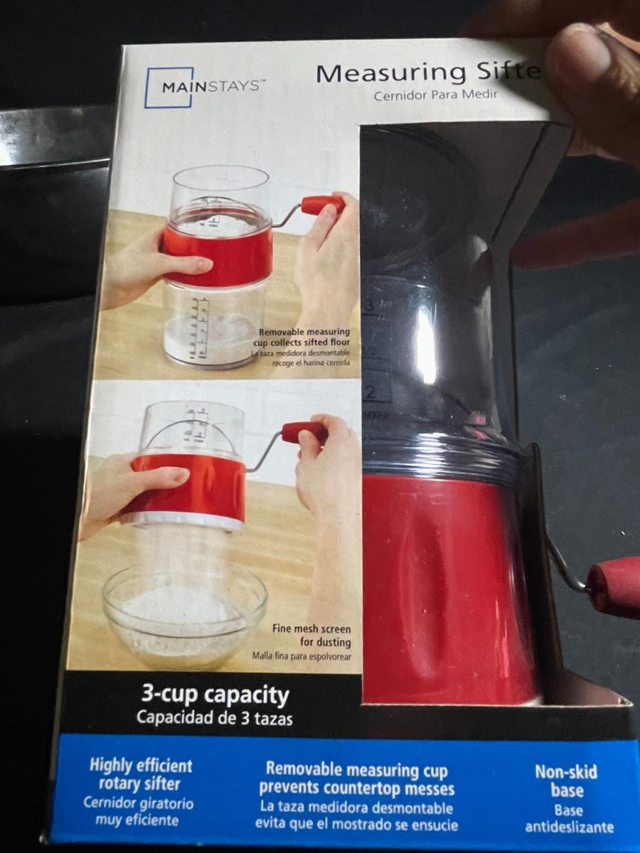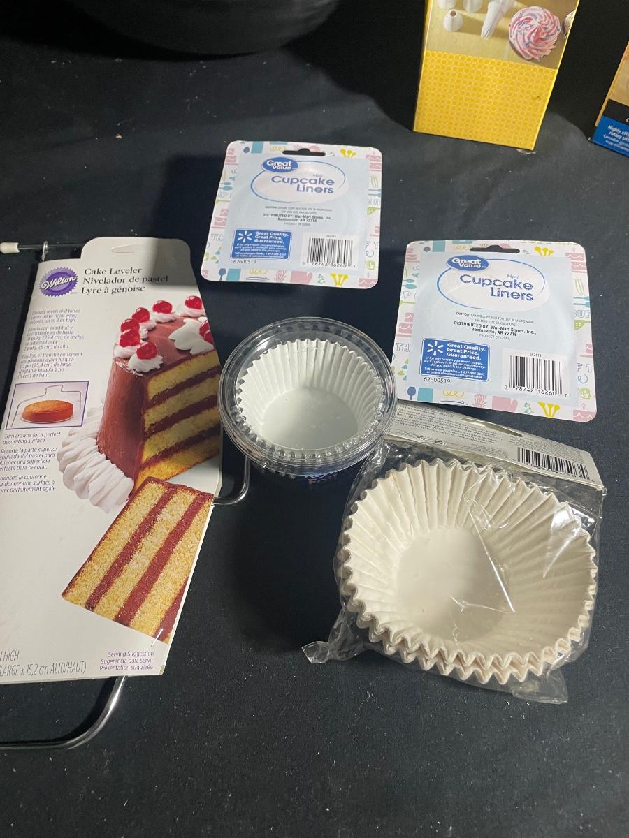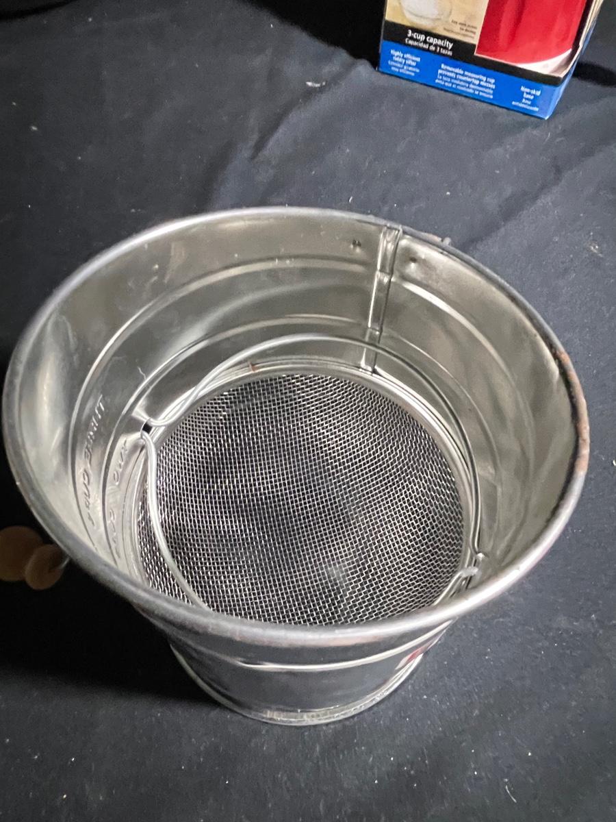 This lot includes a large metal mixing bowl that measures 16” d x 6” tall; this is the only used item and does have a dent on its underside, everything else is new and includes scales, sifters, cooling racks and much more.