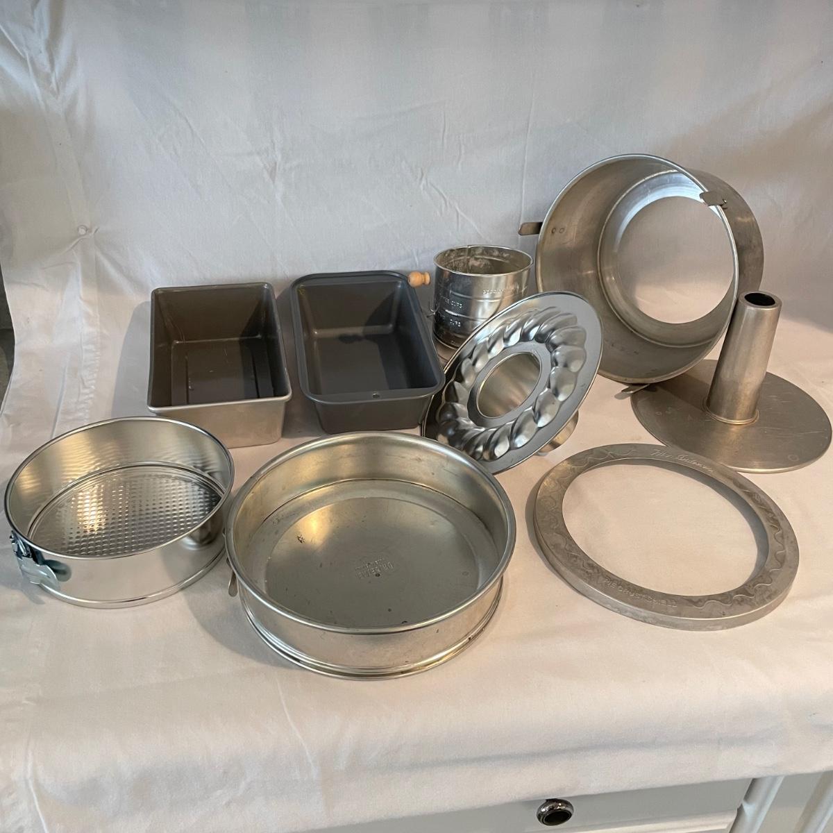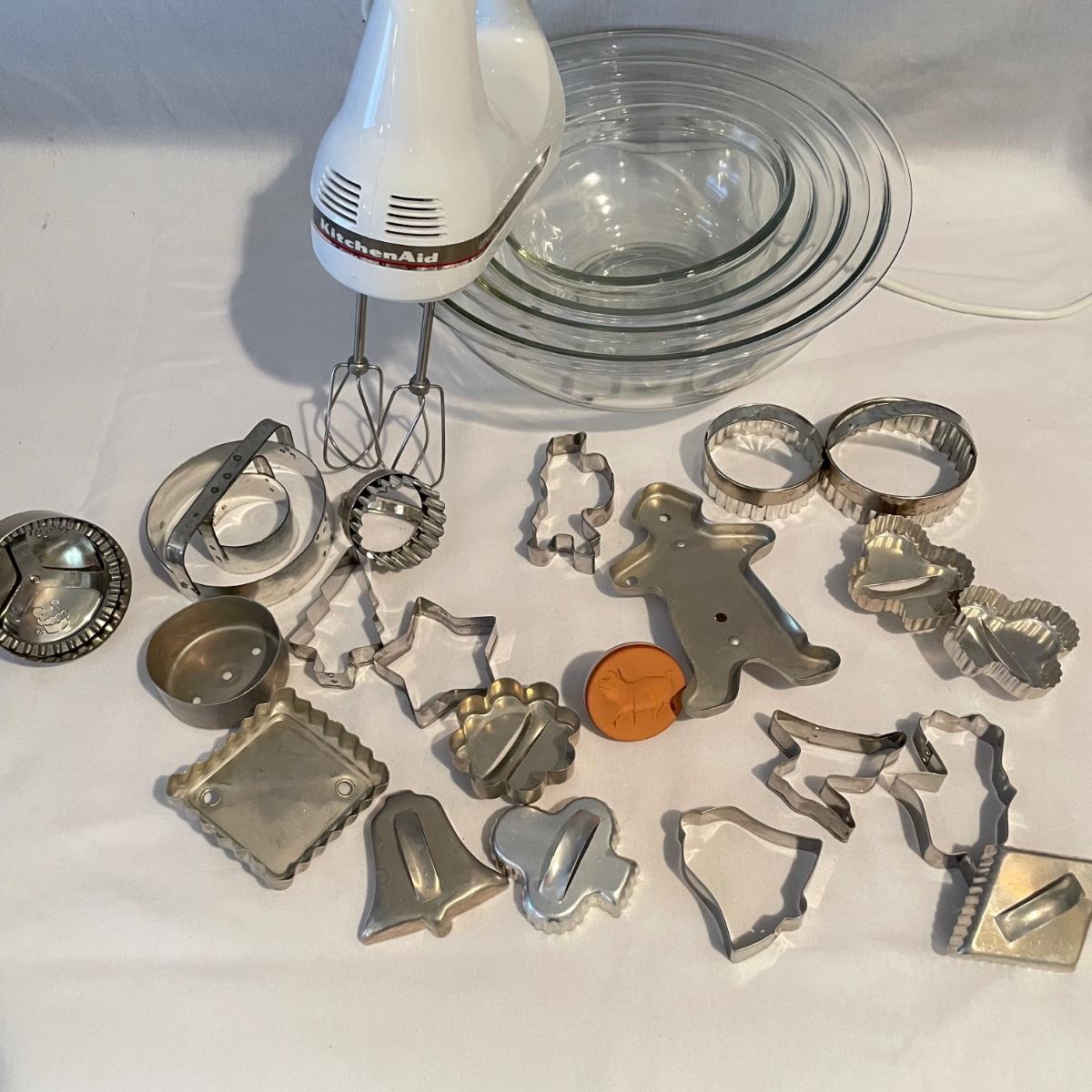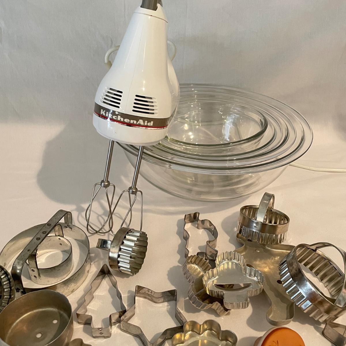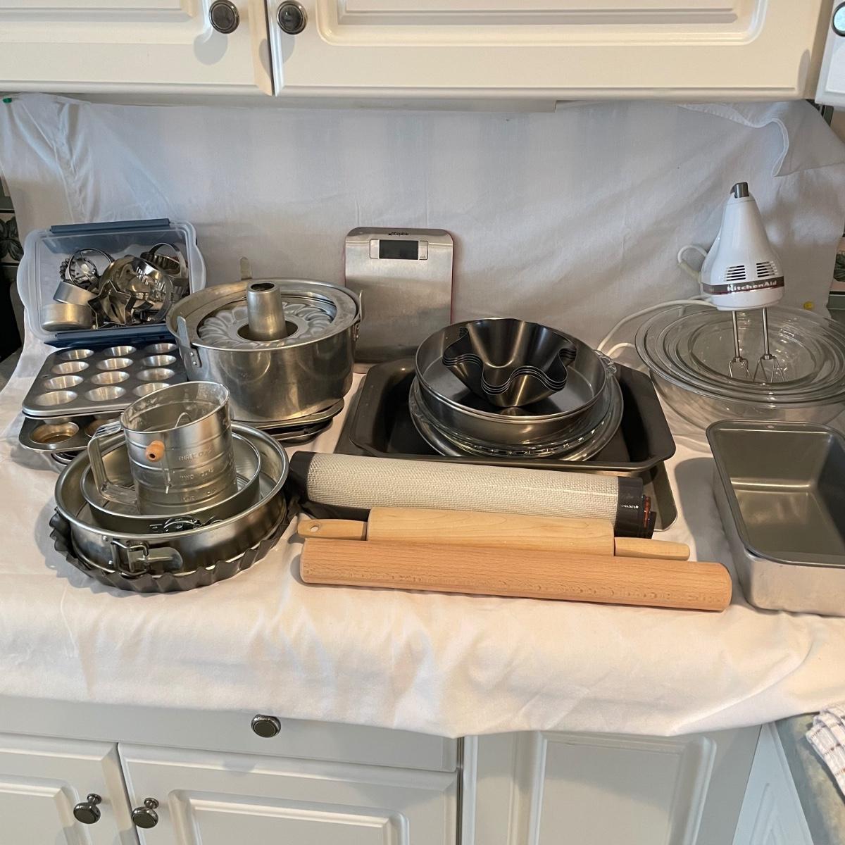 A well rounded baking lot! Start with a Mastrad scale and Goodcook sifter, use the KitchenAid hand mixer (powered on when plugged in) and nesting bowls, roll it out with two wooden rolling pins and design your cookies with a variety of cutters. The Roul ’Pat mat measures 23” x 15”. Lot also includes multiple forms and pans to bake away with. See images for total lot inventory. Local pick up only.