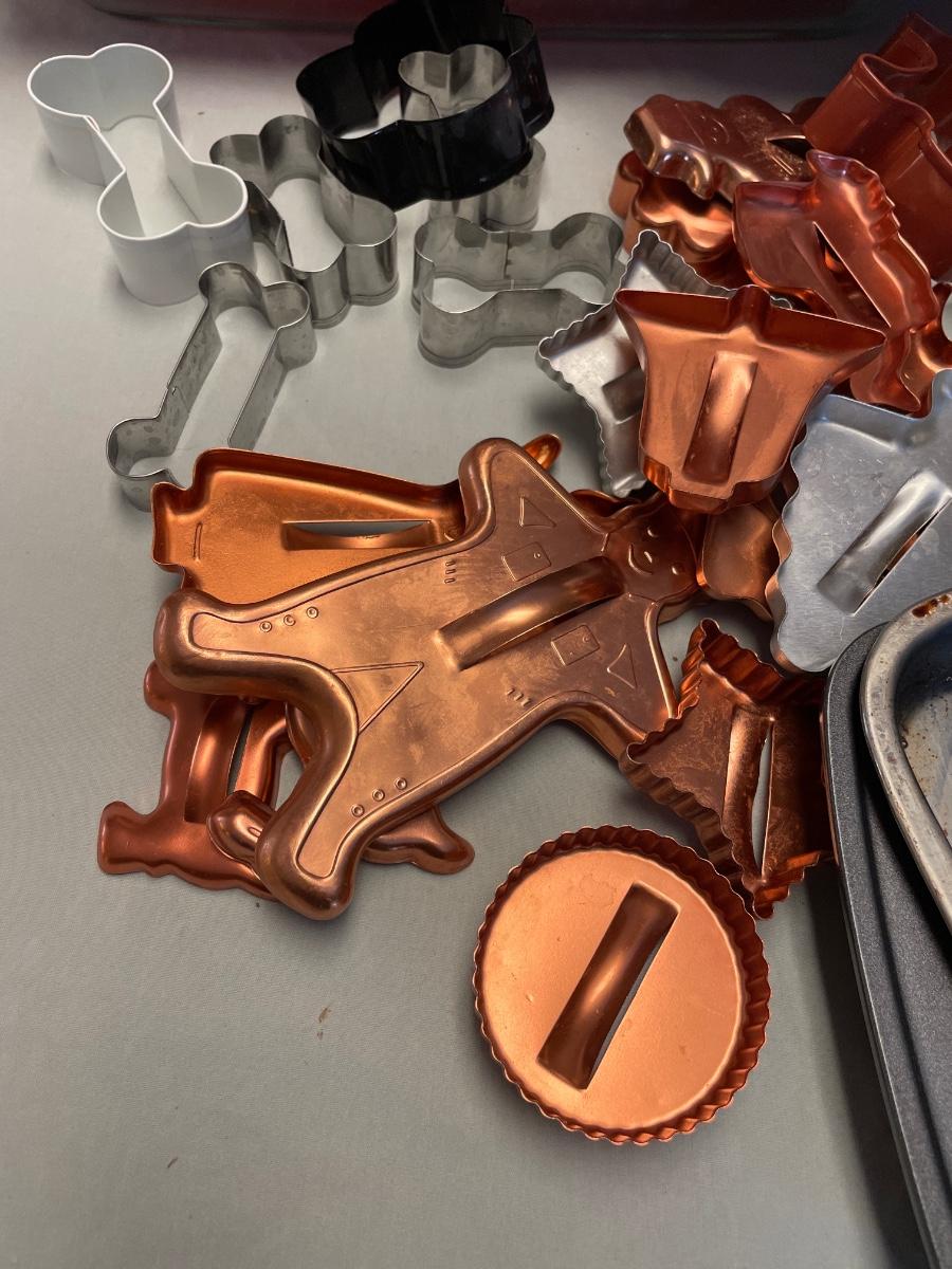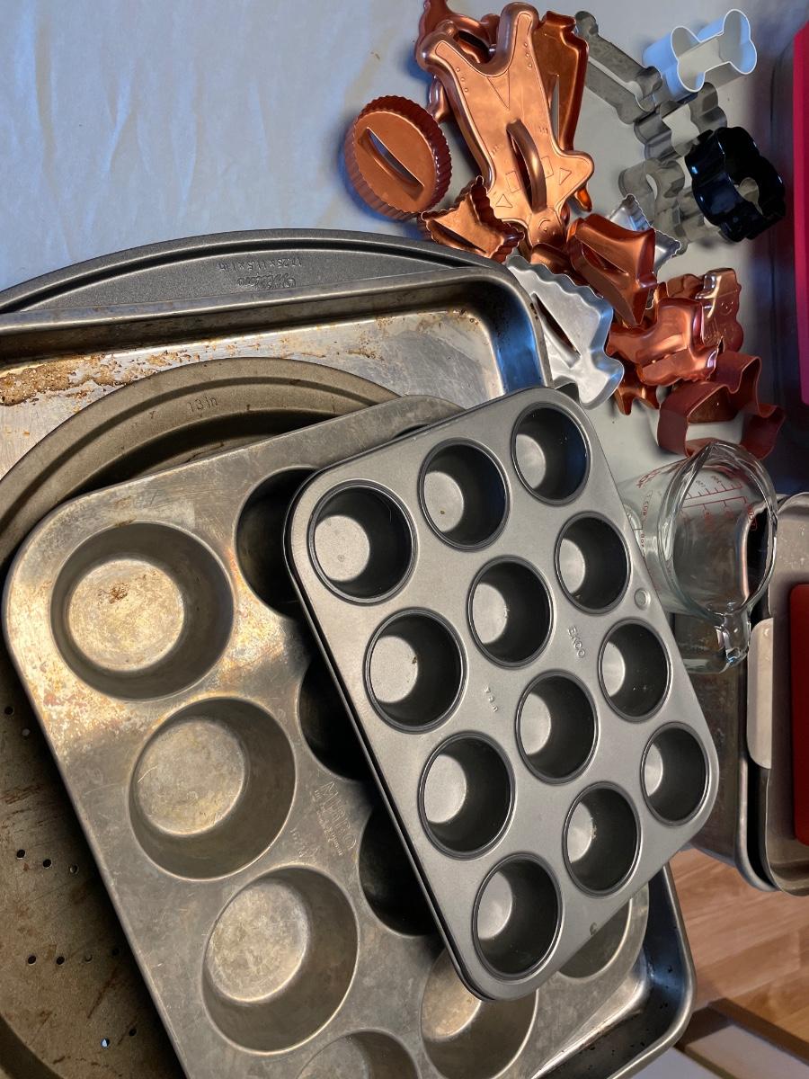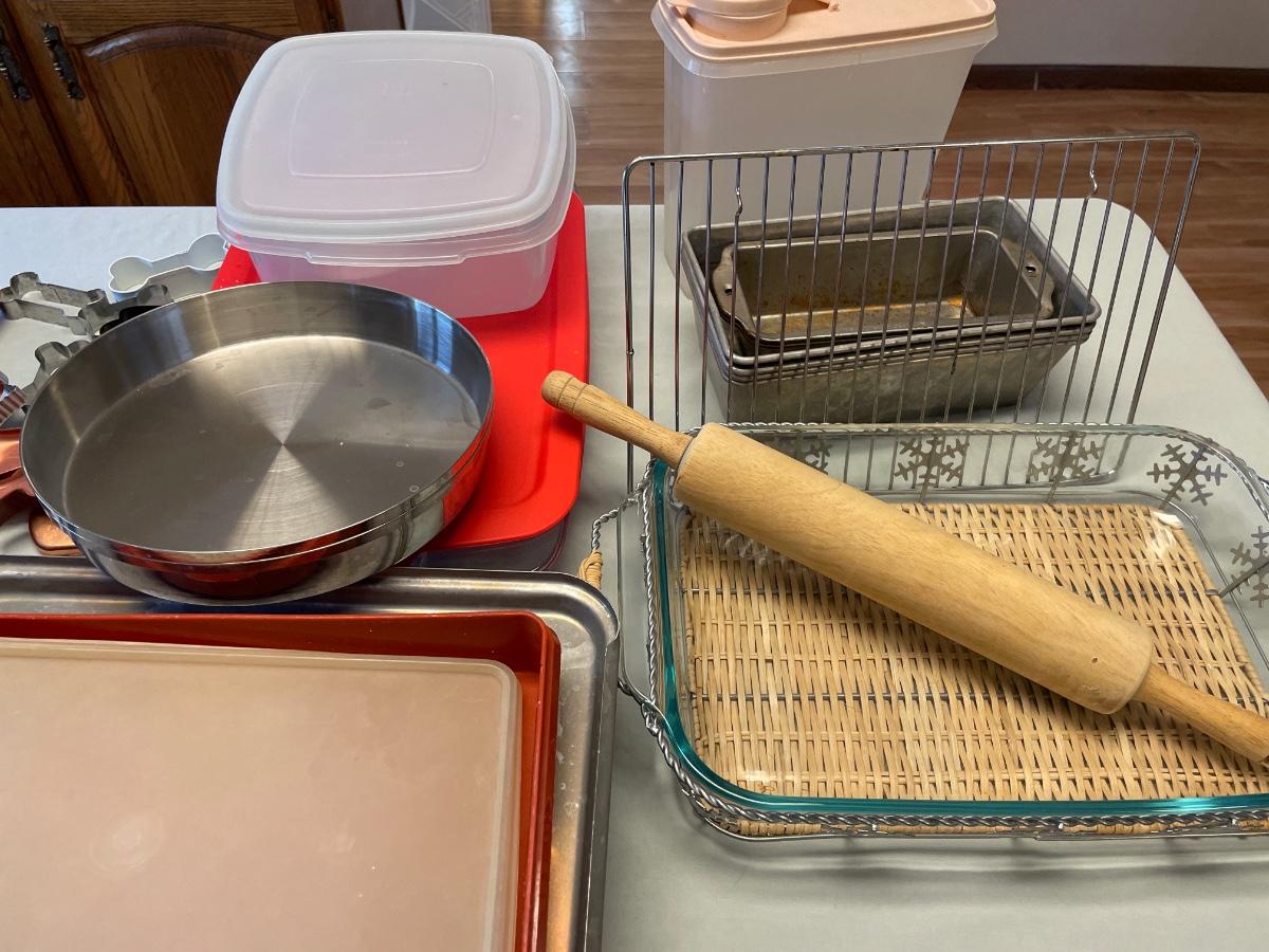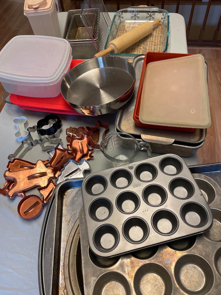 Includes cookie sheets, muffin tins, measuring cup, casserole dishes, loaf tins, rolling pin, cookie cutters, and storage containers