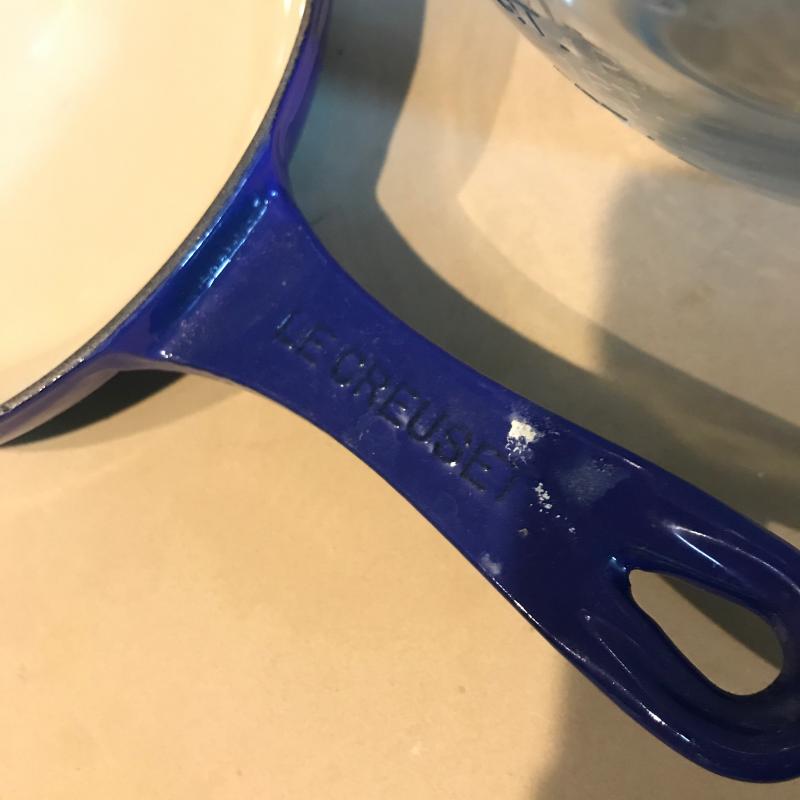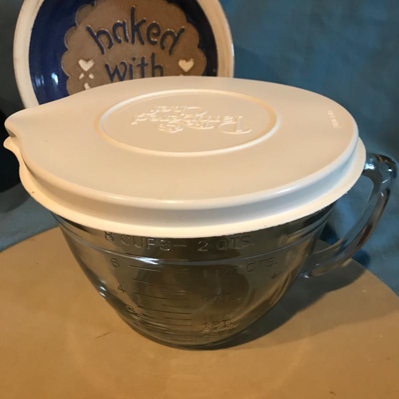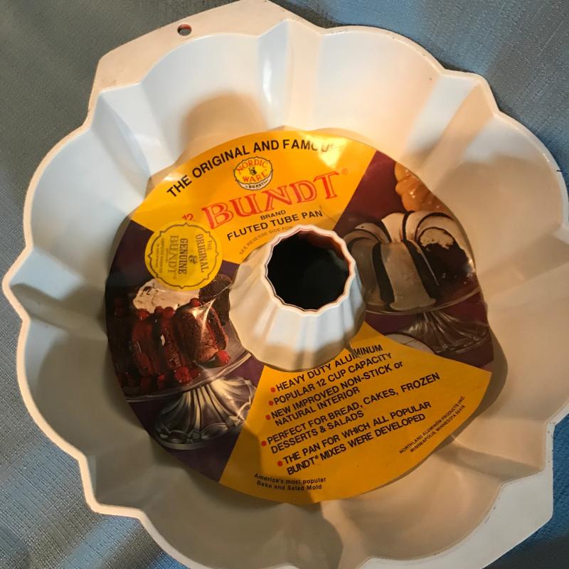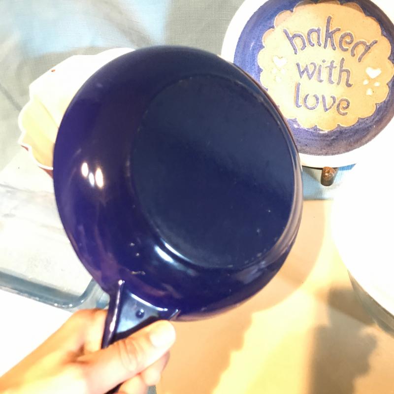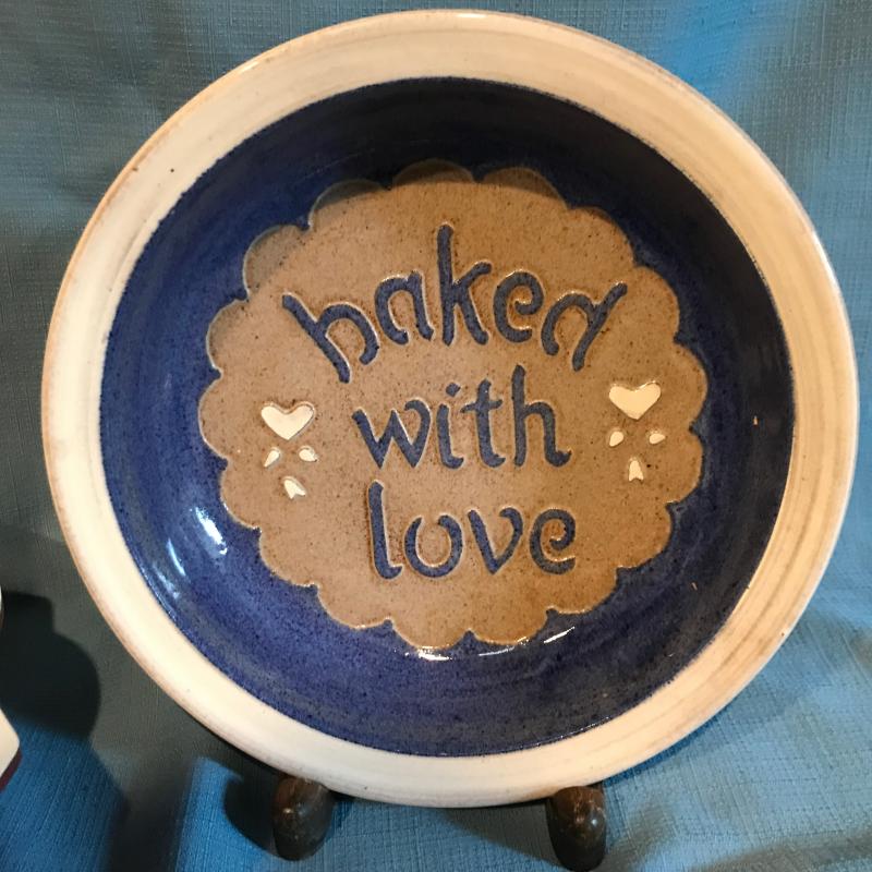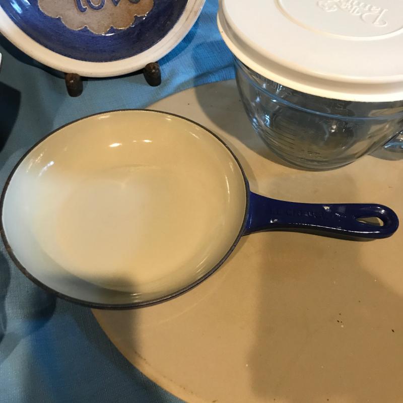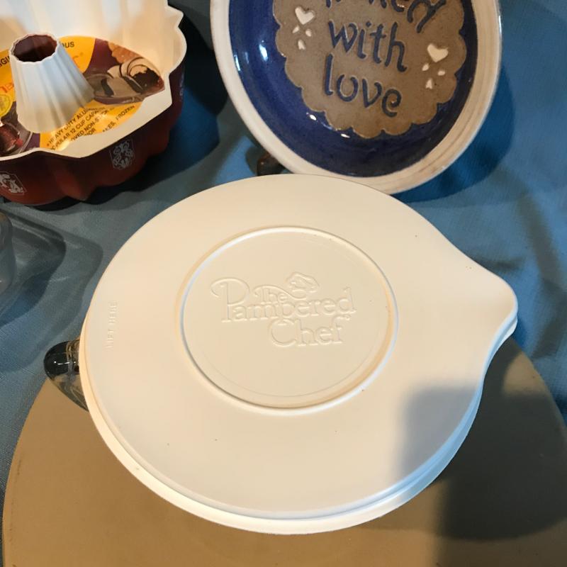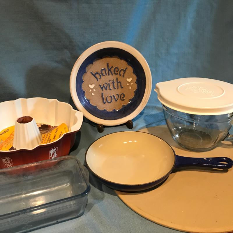 Lot includes Pampered Chef baking stone and mixing bowl with lid, two pie pans, glass bread pan, blue Le Creuset pan, and vintage metal bunt pan. No shipping available. Local pickup only in Hendersonville, NC.