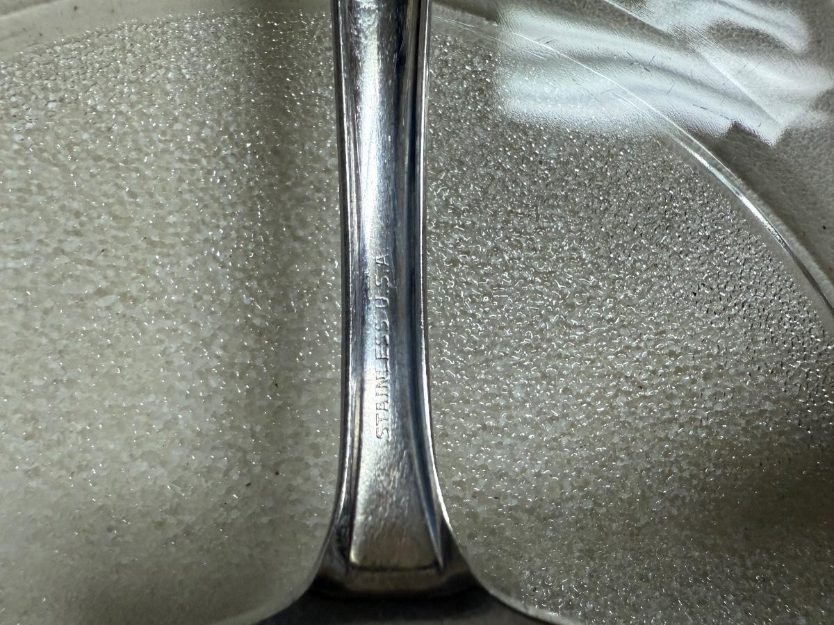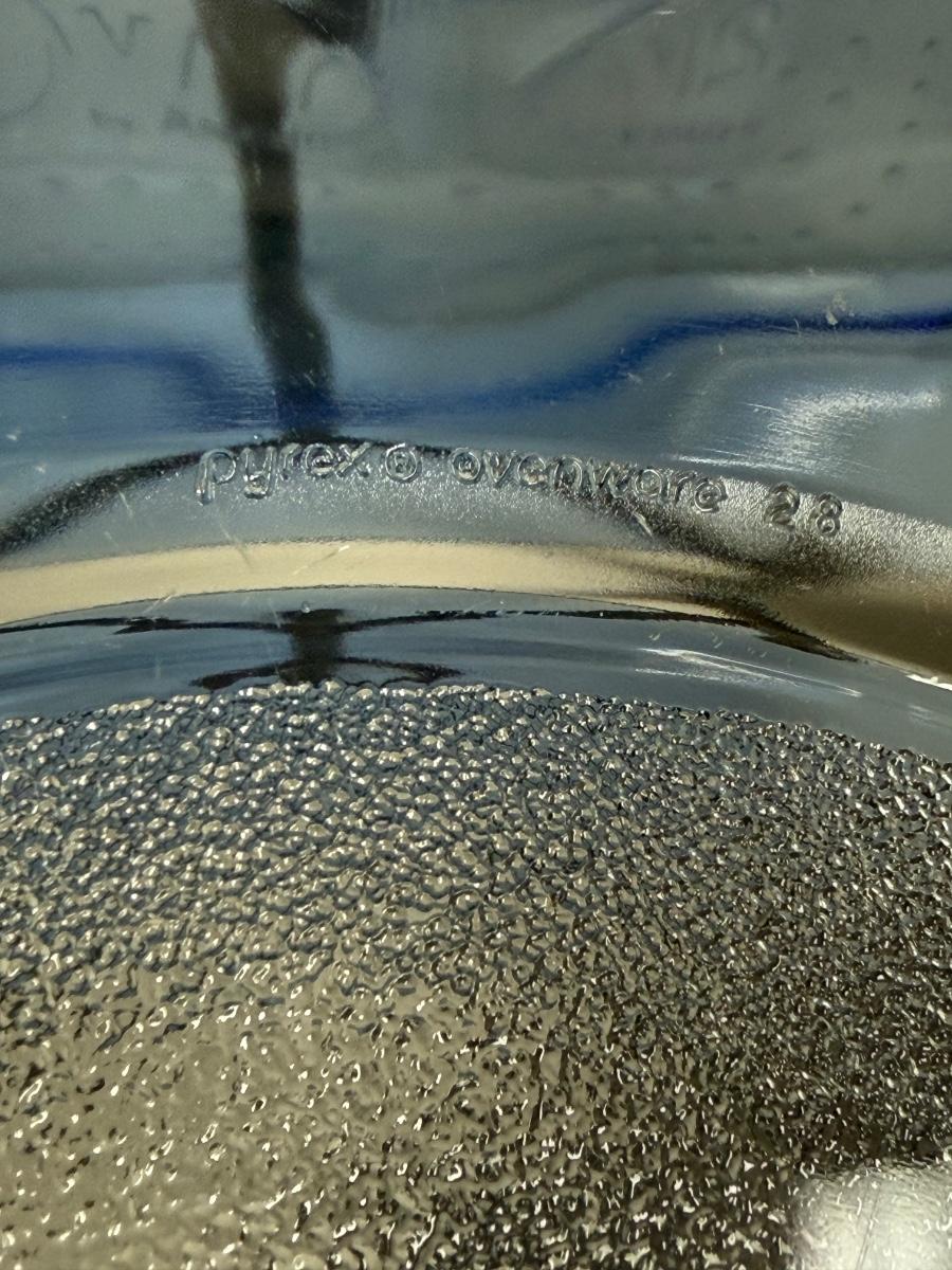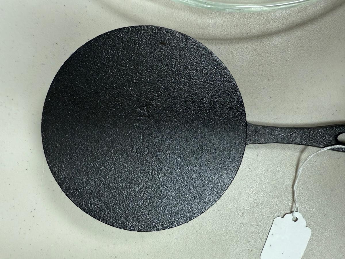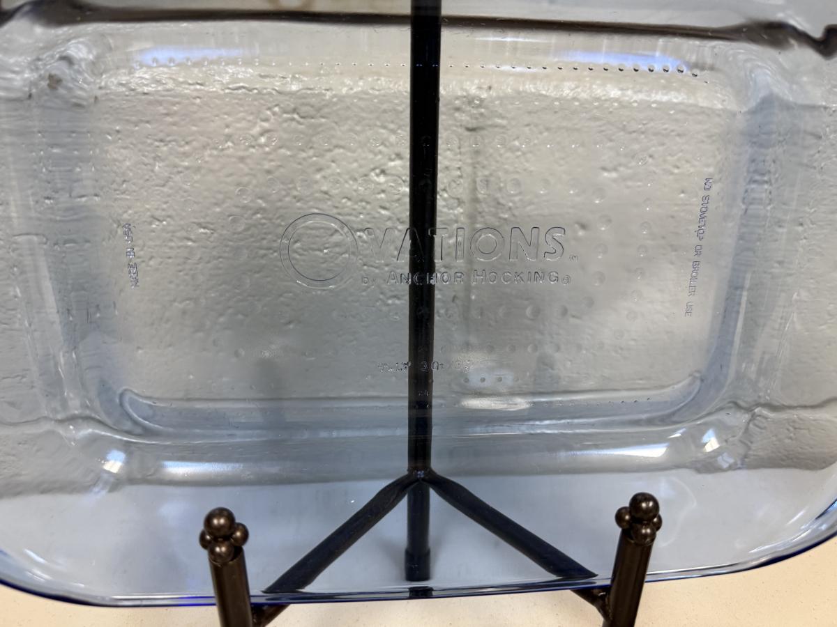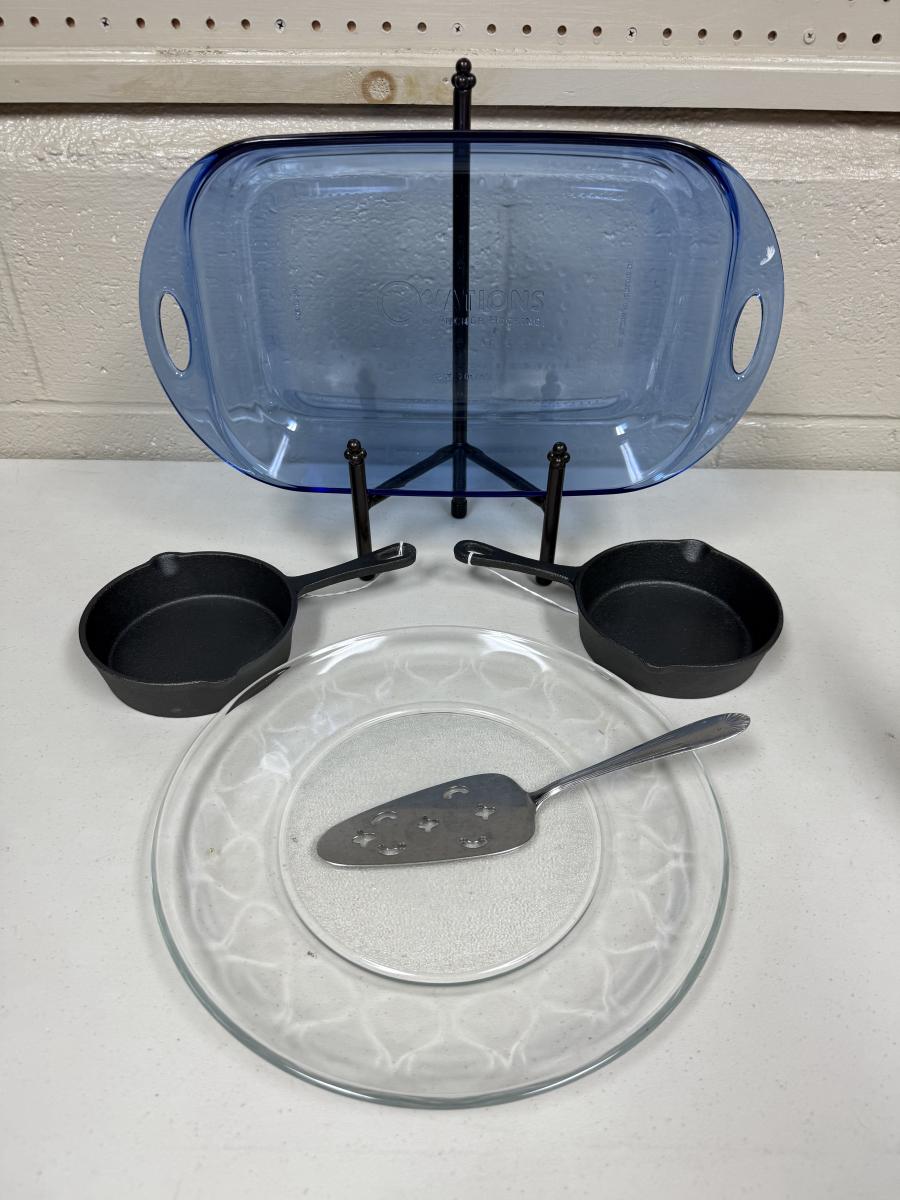 AH Ovations blue casserole, Pyrex ovenware plate, 2 mini cast iron skillets, stainless server