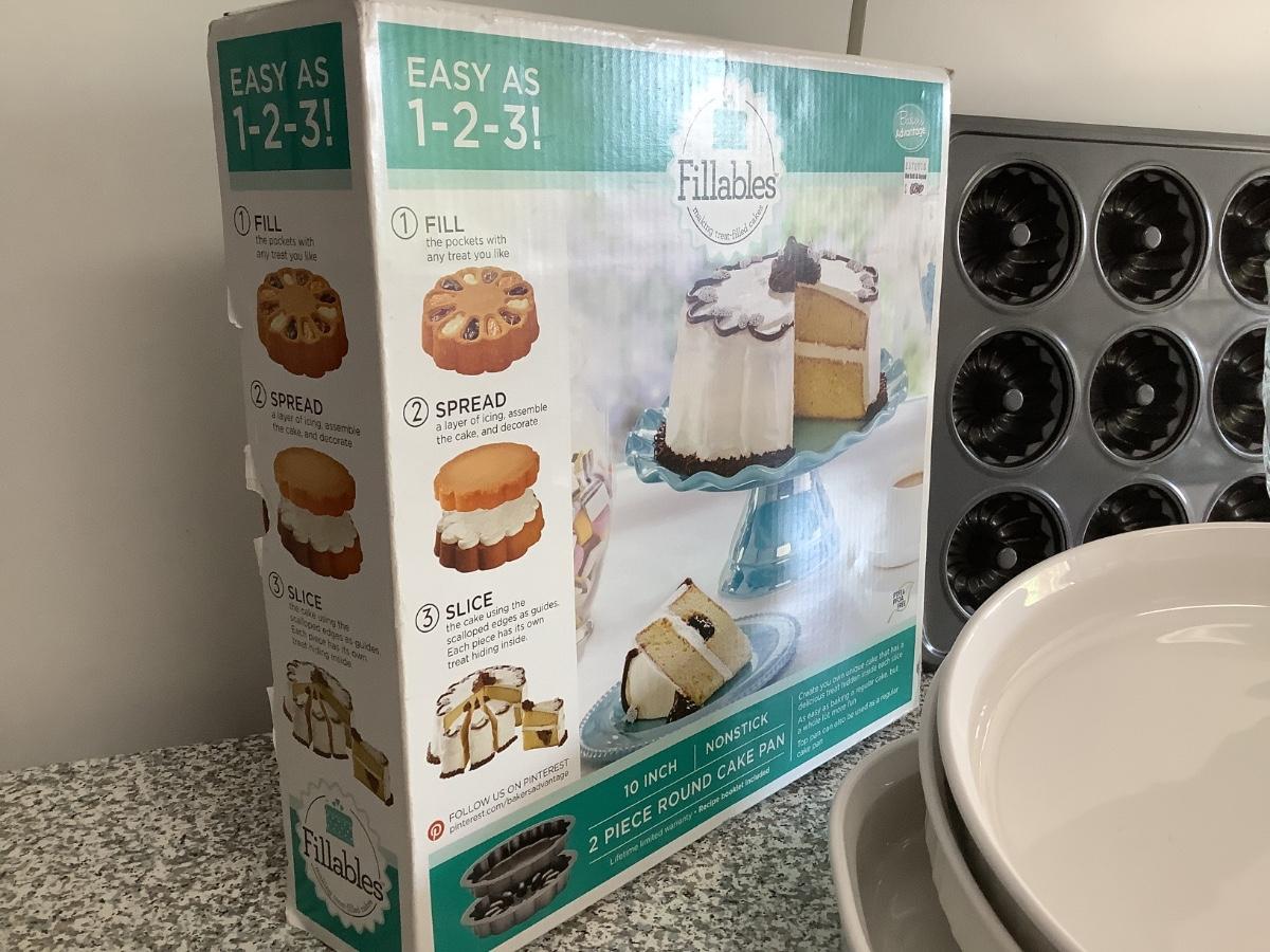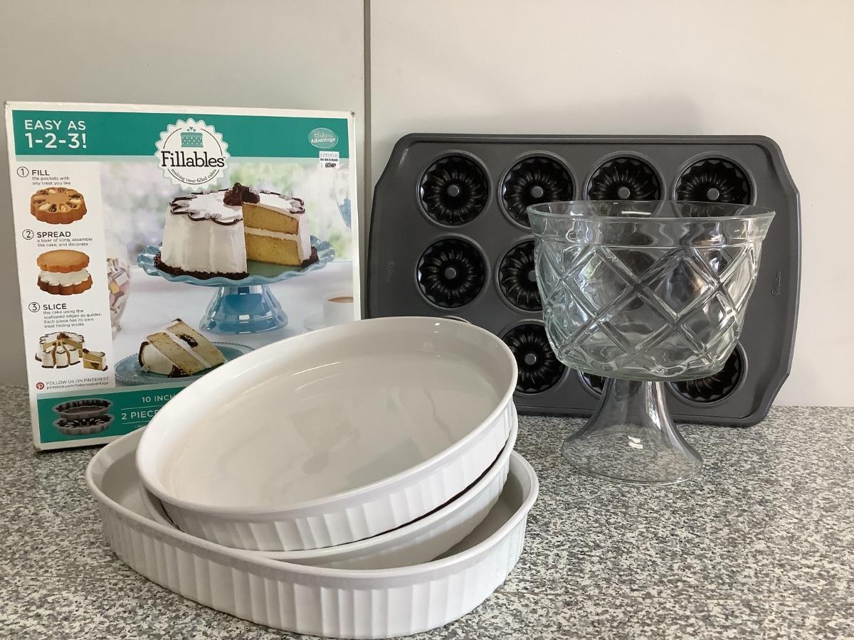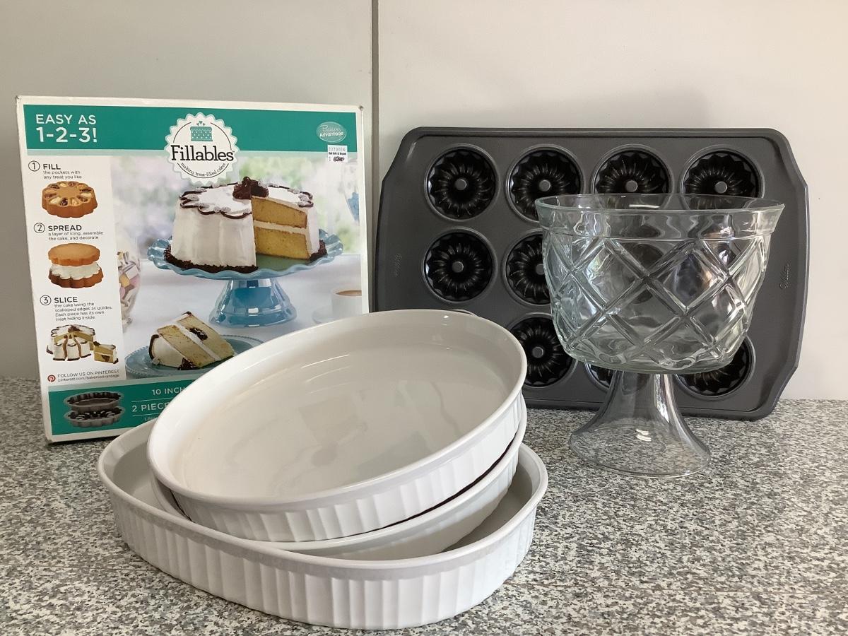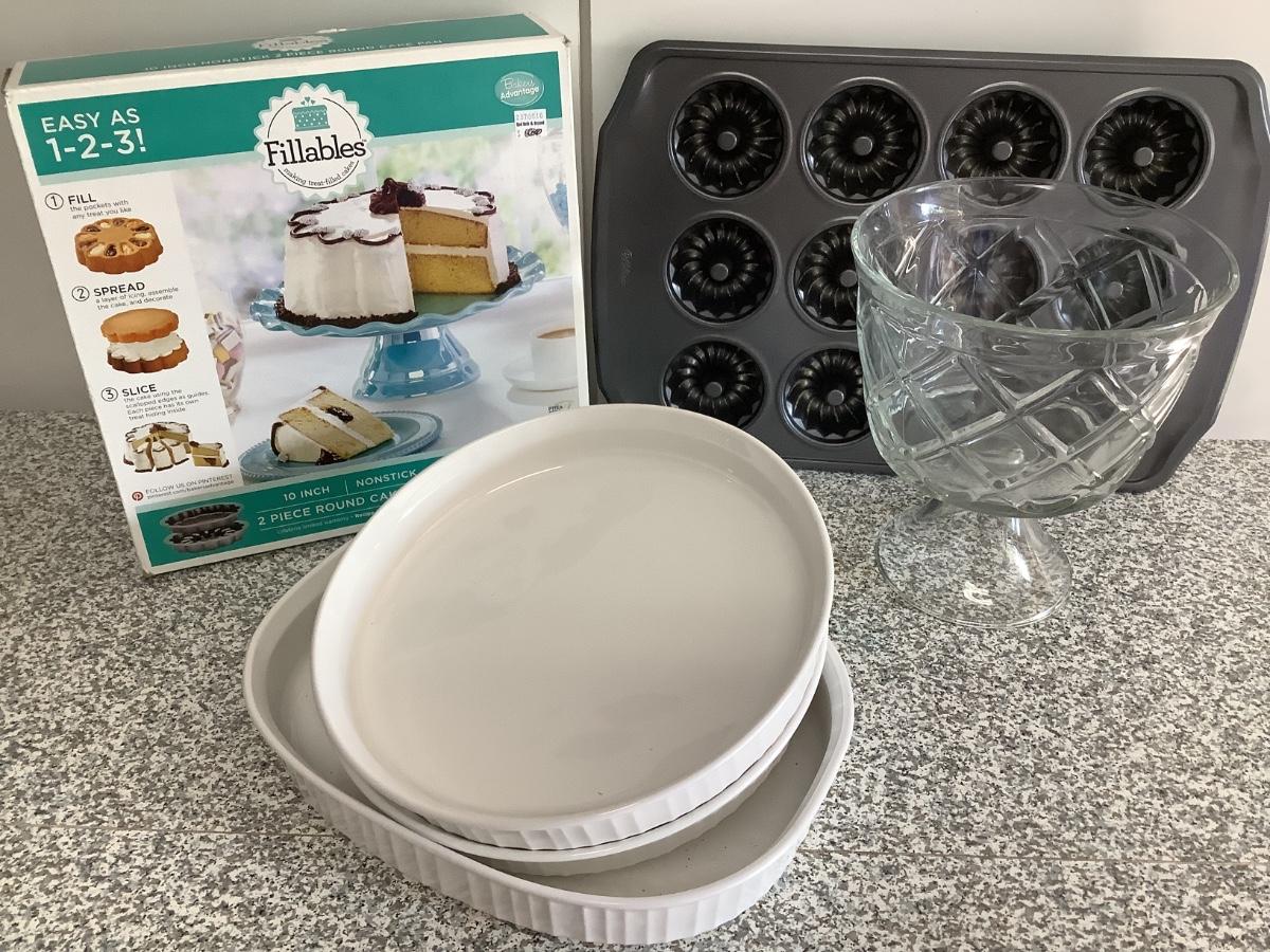 Baking Lot-Wilton Baby Bundt, 3 Corningware, Fillables Cake Pans for layered cakes in box, glass pedestal