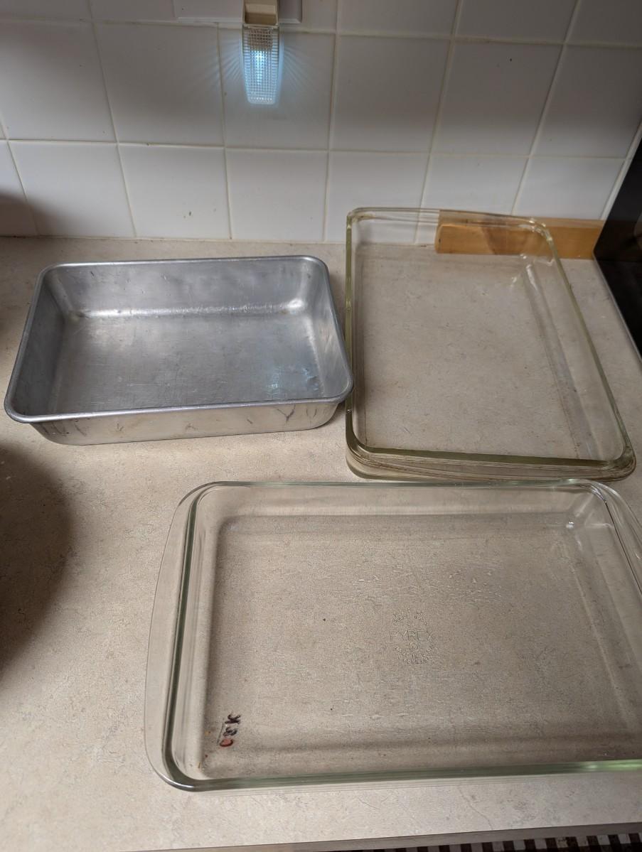 Nice baking pans, a few round including vintage glass one. Three loaf pans, a bundt pan, rectangle cake pan, and two glass baking ones.