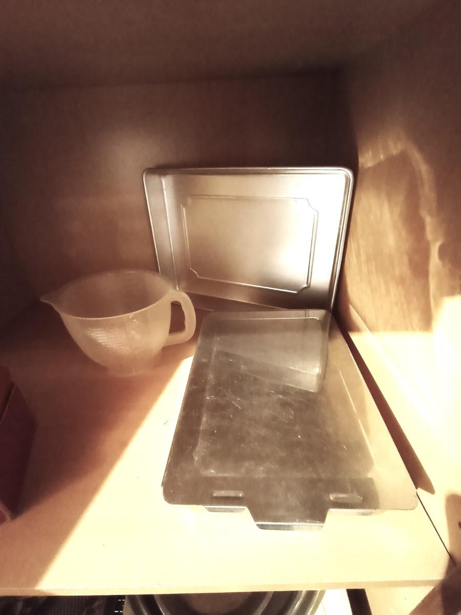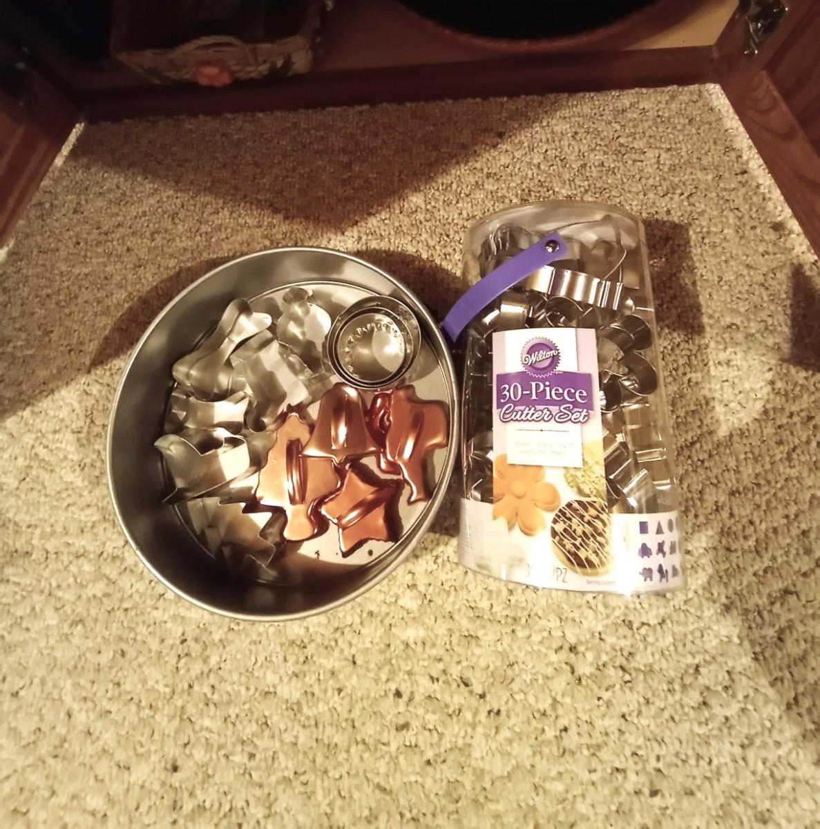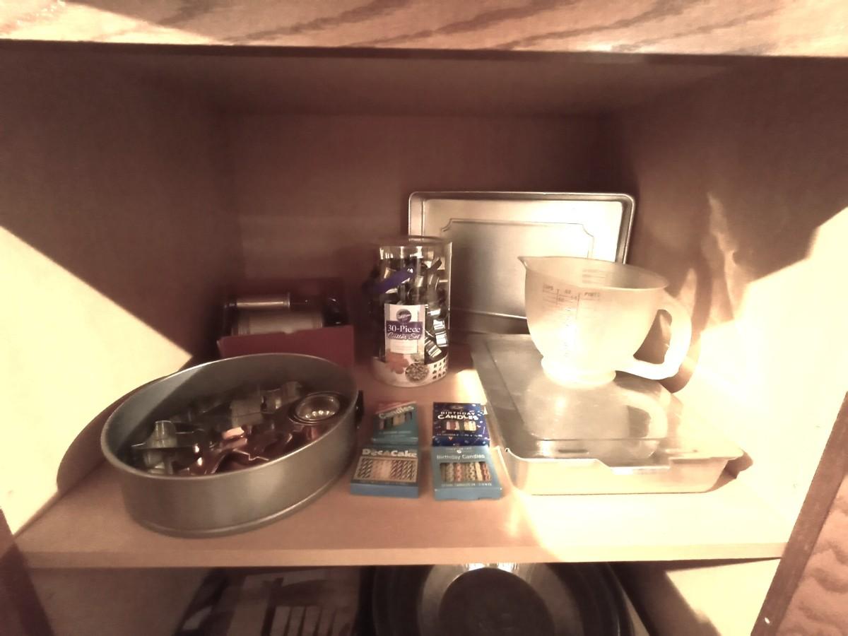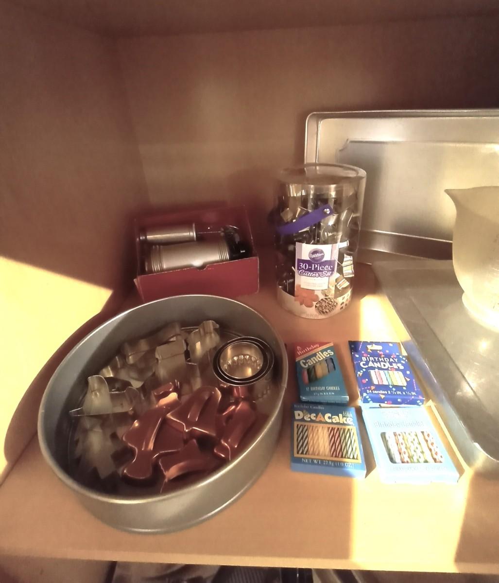 3 BAKING PANS - COOKIE CUTTERS CAKE CANDLES - LARGE MEASURING CUP-VINTAGE COOKIE/CANDY PRESS
