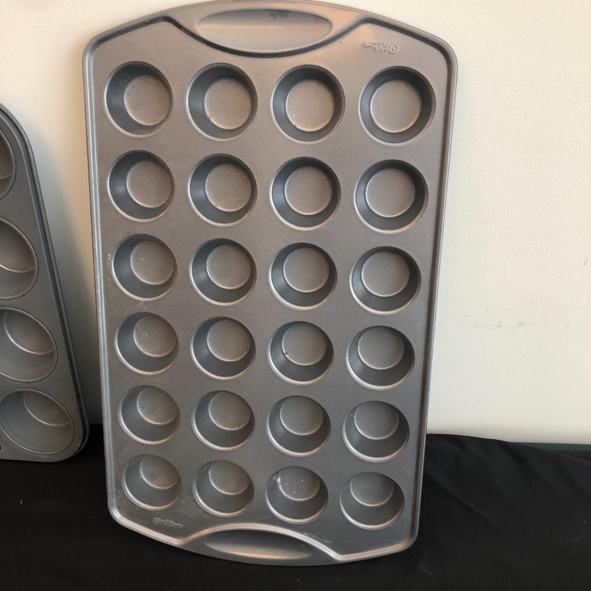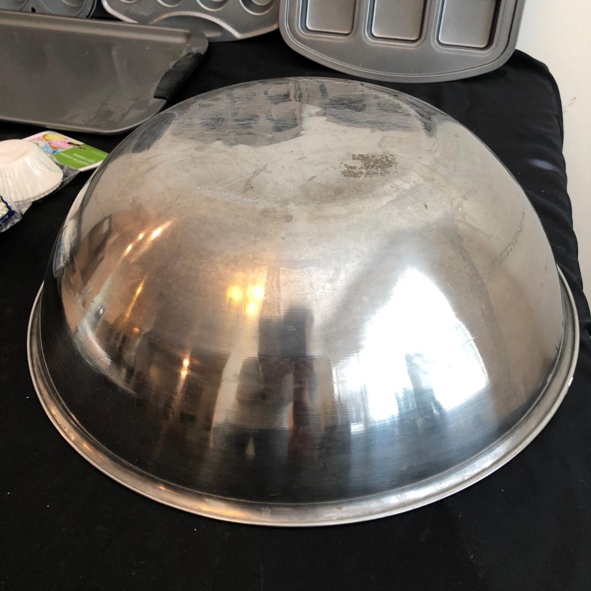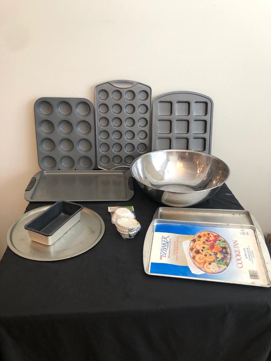 This lot has nine items: a large mixing bowl, three muffin pans, three cookie sheets, one pizza pan and one loaf pan. There are also two packages of baking cups. The Mixing bowl measures 16” in diameter and is 5.5” tall. The square muffin pan is a Pampered Chef, the small muffin pan is a Wilton and the cookie sheet with silicone handles is a Cooks. Shipping Available.