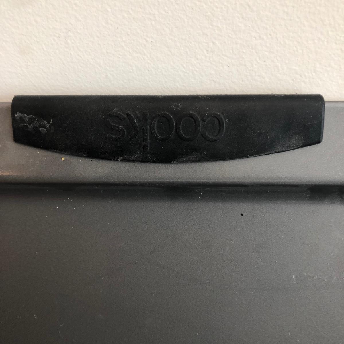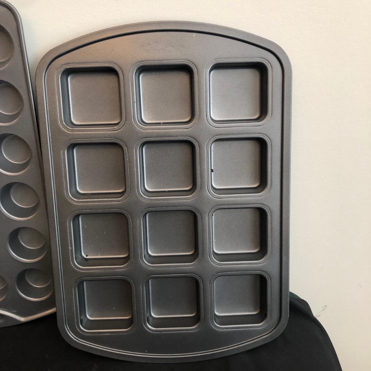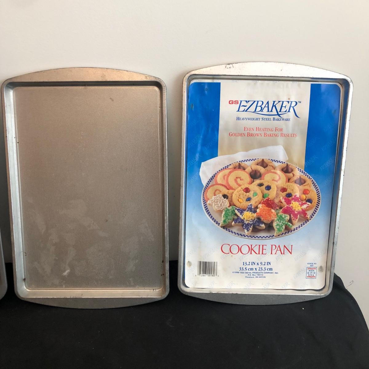 This lot has nine items: a large mixing bowl, three muffin pans, three cookie sheets, one pizza pan and one loaf pan. There are also two packages of baking cups. The Mixing bowl measures 16” in diameter and is 5.5” tall. The square muffin pan is a Pampered Chef, the small muffin pan is a Wilton and the cookie sheet with silicone handles is a Cooks. Shipping Available.