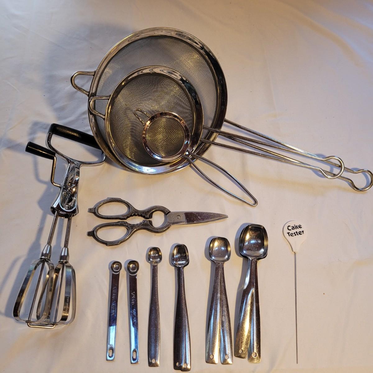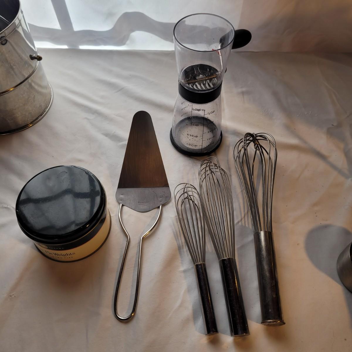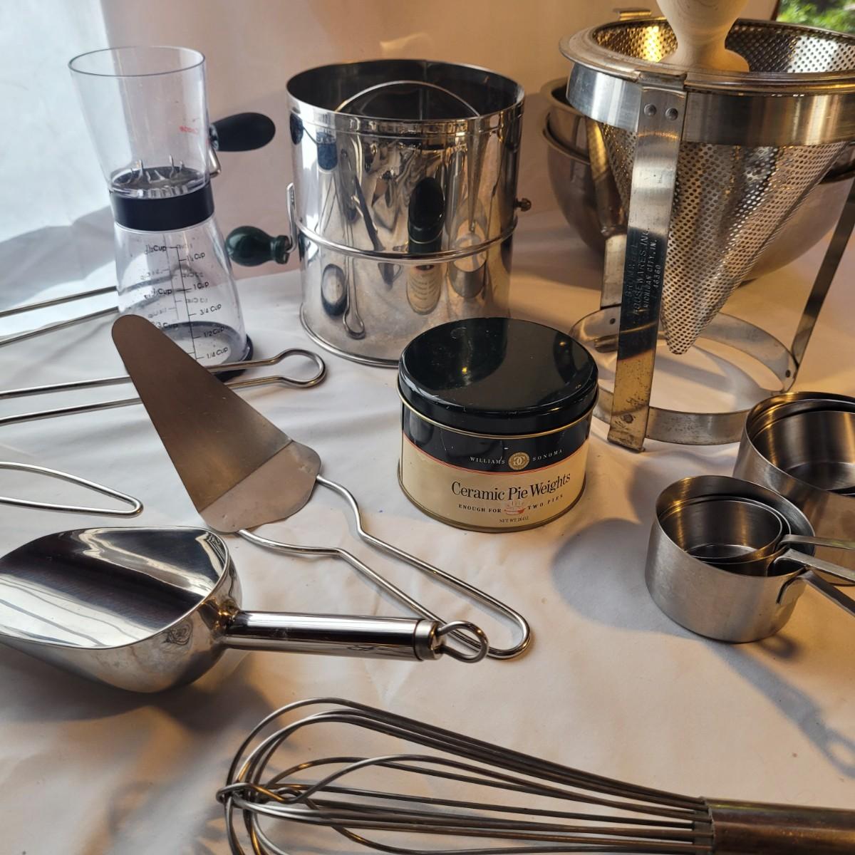 This large assortment of baking supplies includes an electronic scale, flour scoops, sifters, pie weights, handheld mixer, sieve, strainers, nut mixer and more. Sifter measures 6”D x 7”H. Shipping available.