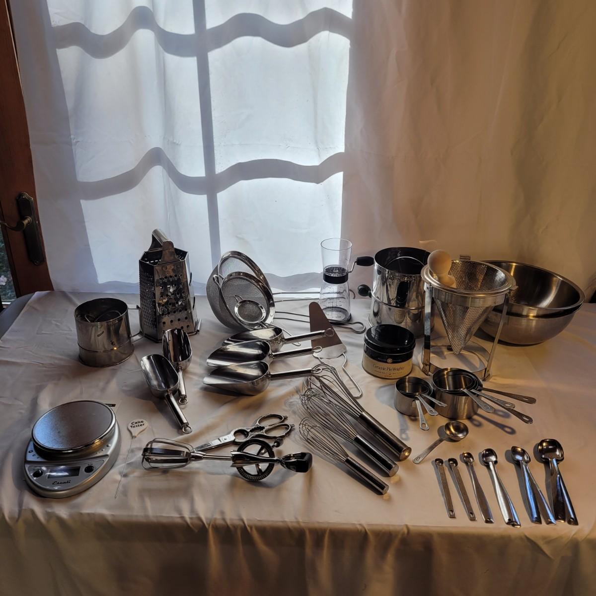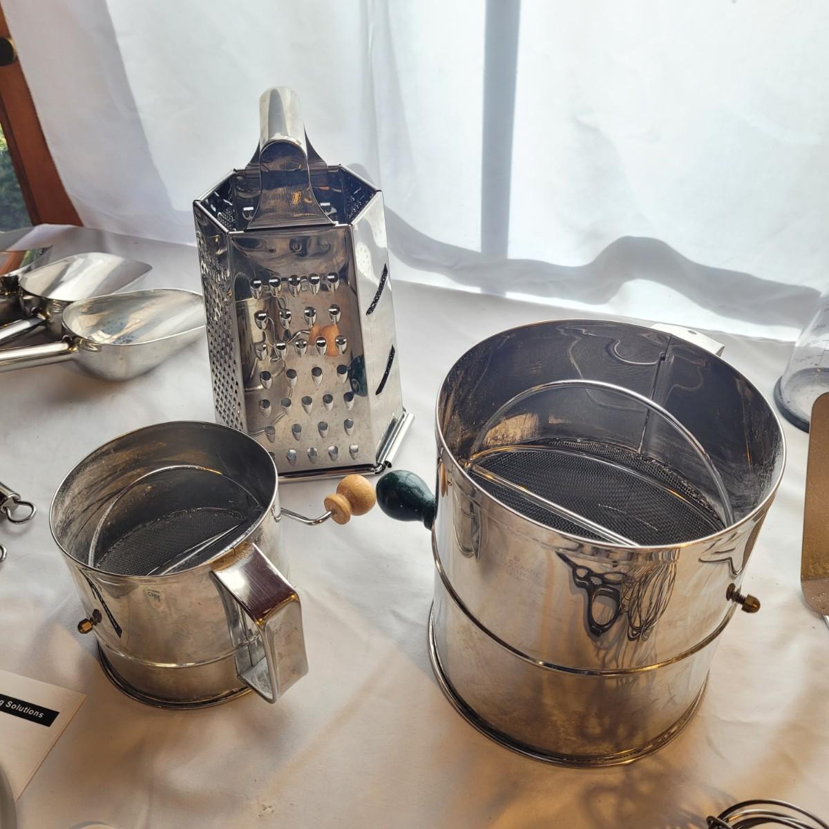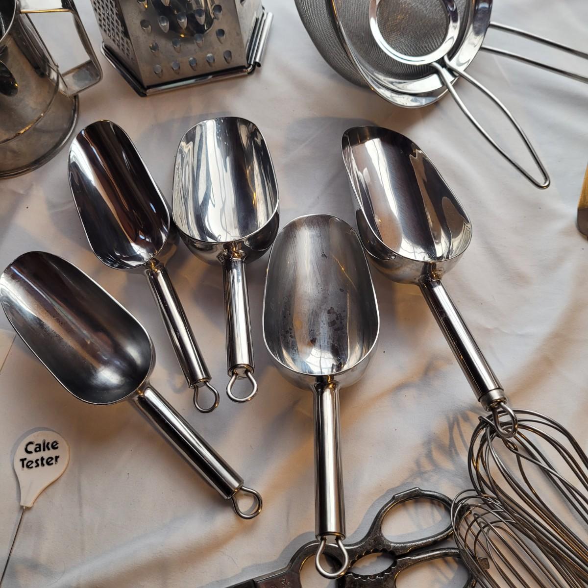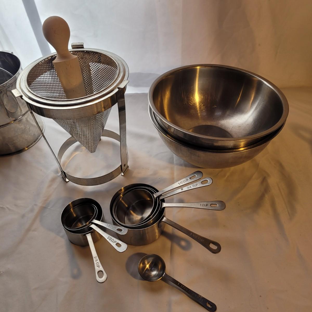 This large assortment of baking supplies includes an electronic scale, flour scoops, sifters, pie weights, handheld mixer, sieve, strainers, nut mixer and more. Sifter measures 6”D x 7”H. Shipping available.