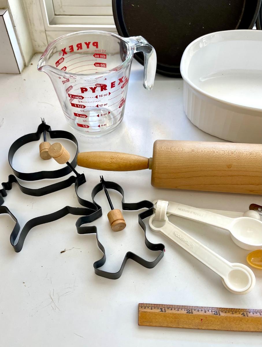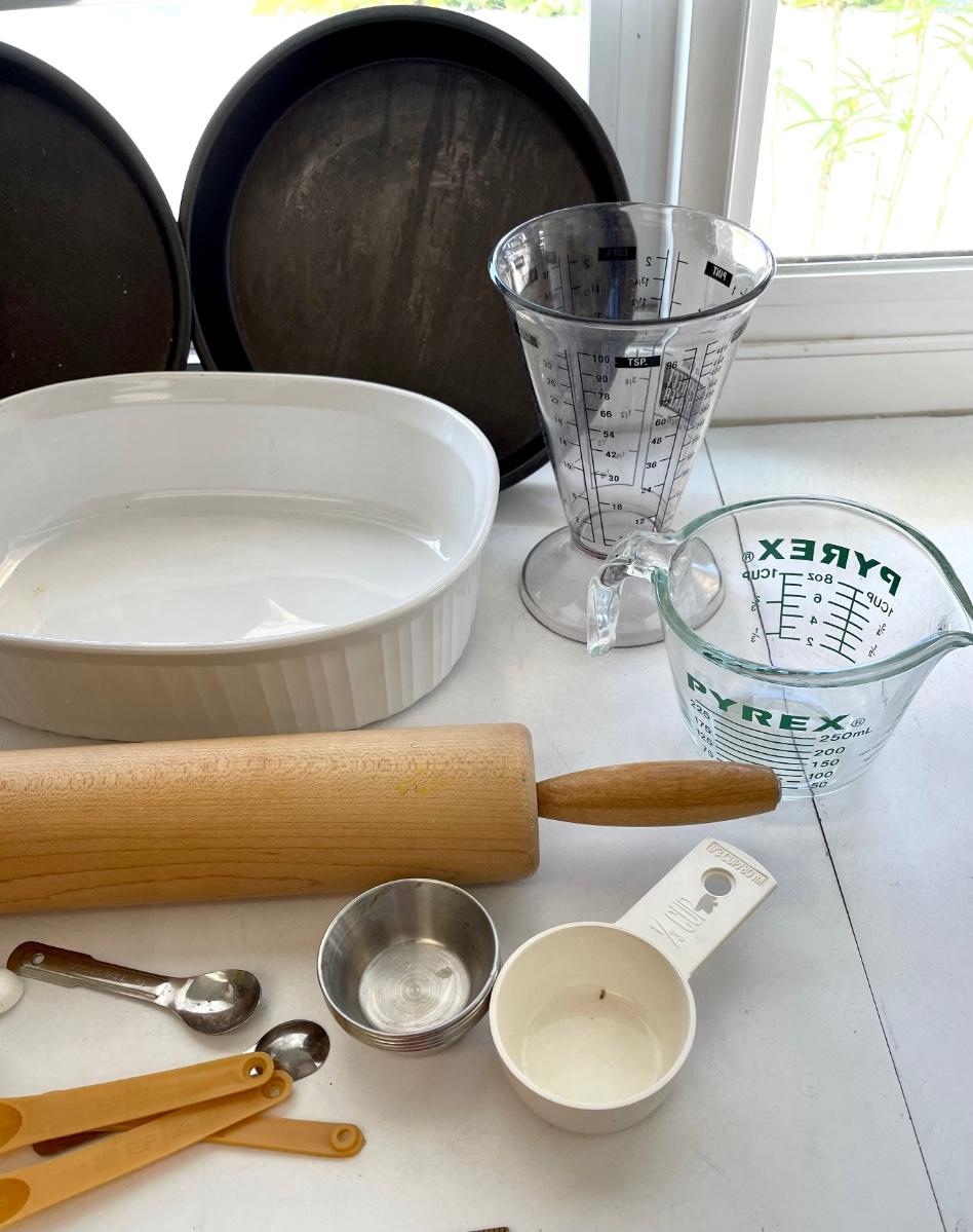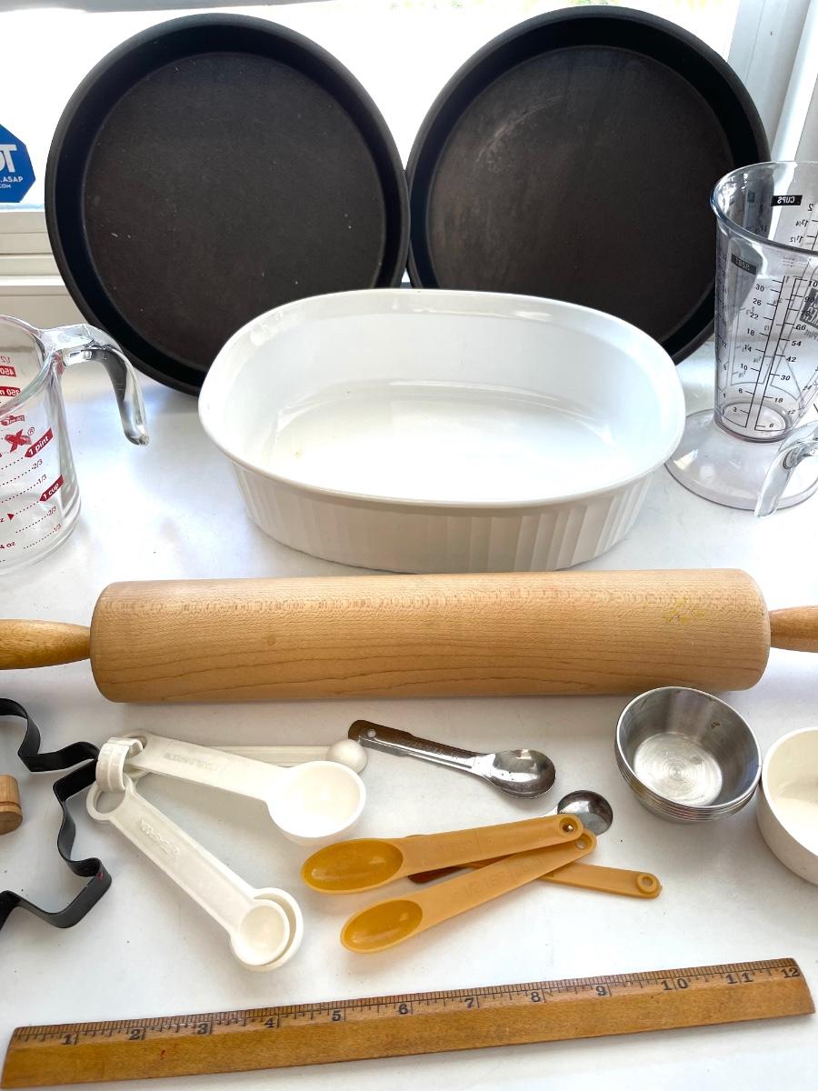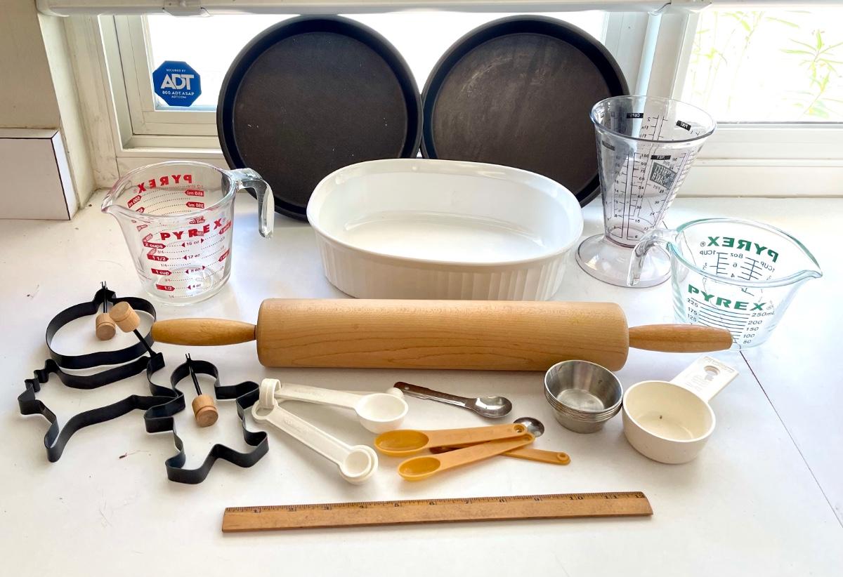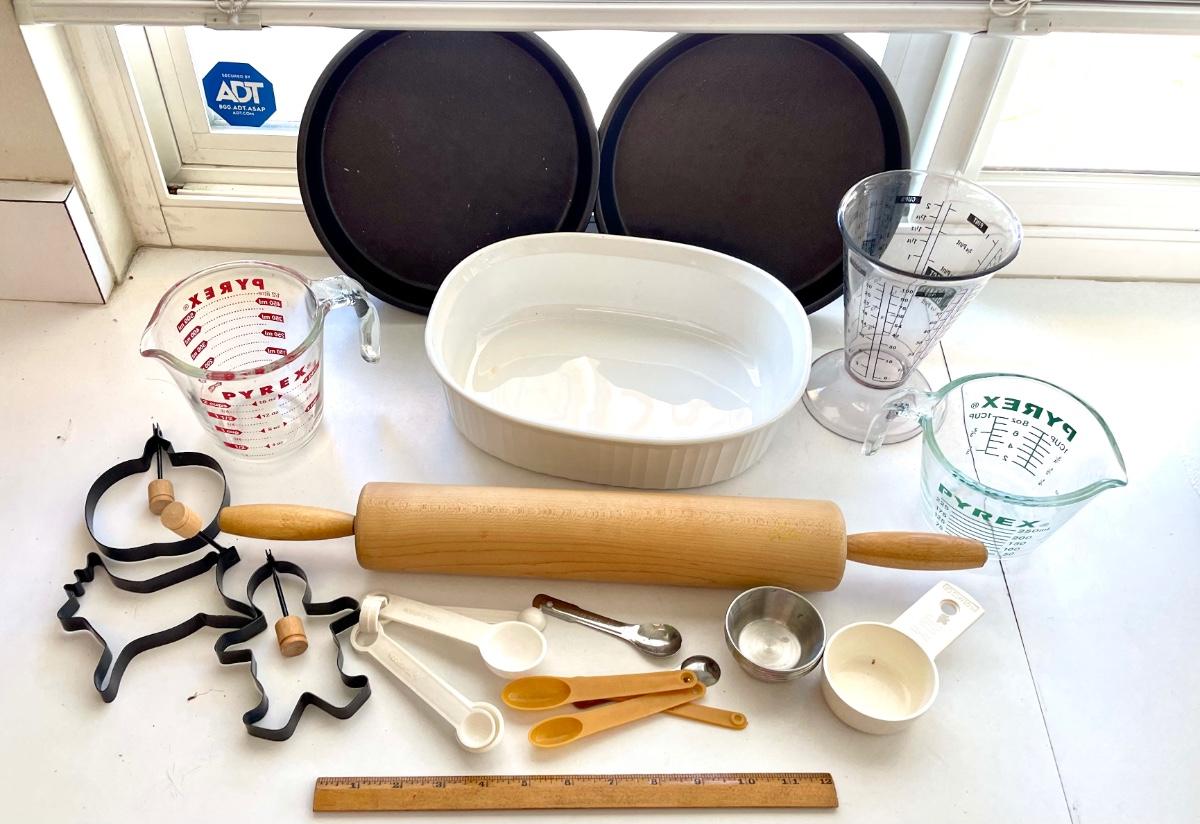 Baking tools and gadgets Lot - rolling pin, measuring cups, bowls, pans, etc