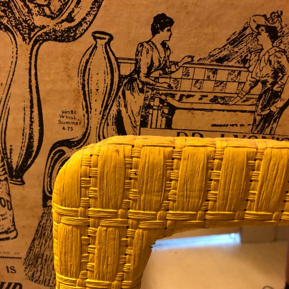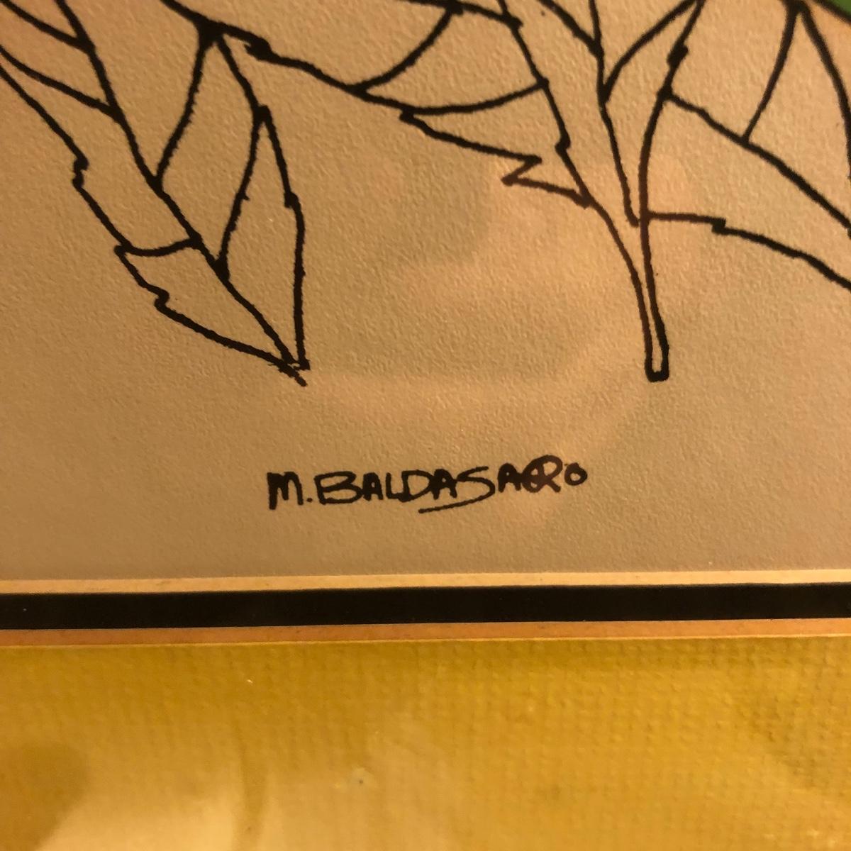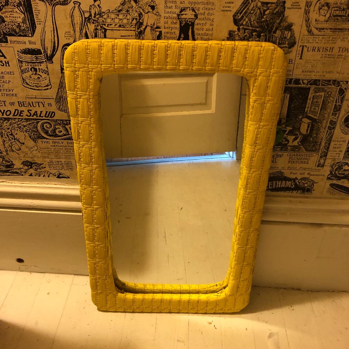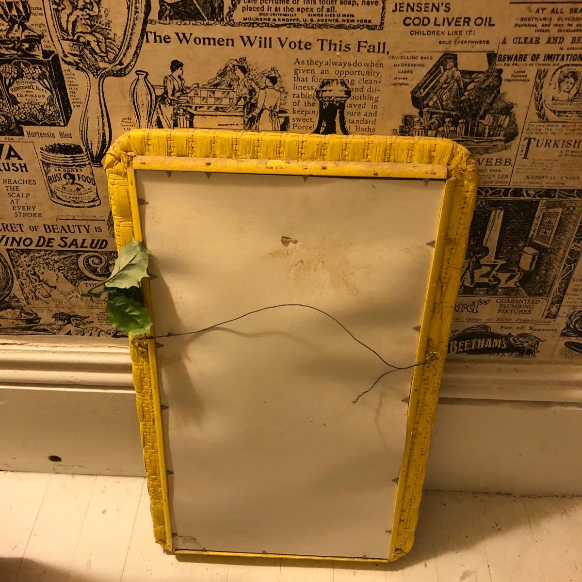 A fresh splash of yellow will brighten up any space! This M.Baldasaro print is mounted in a silver colored frame that measures 16” x 20”. The accompanying mirror has a yellow rattan frame.