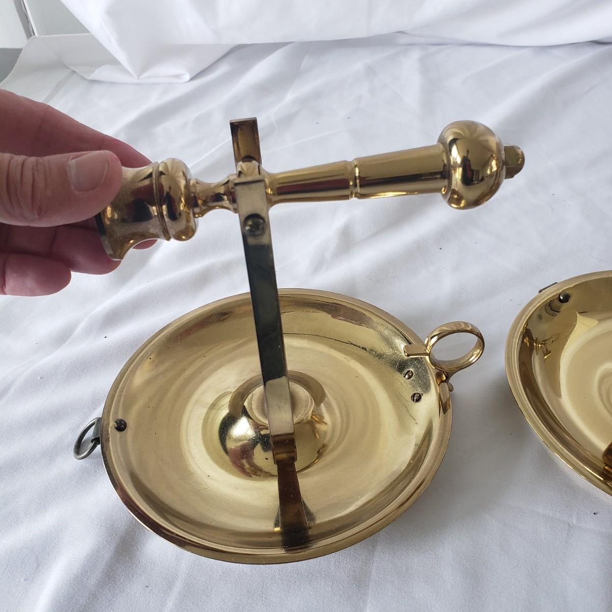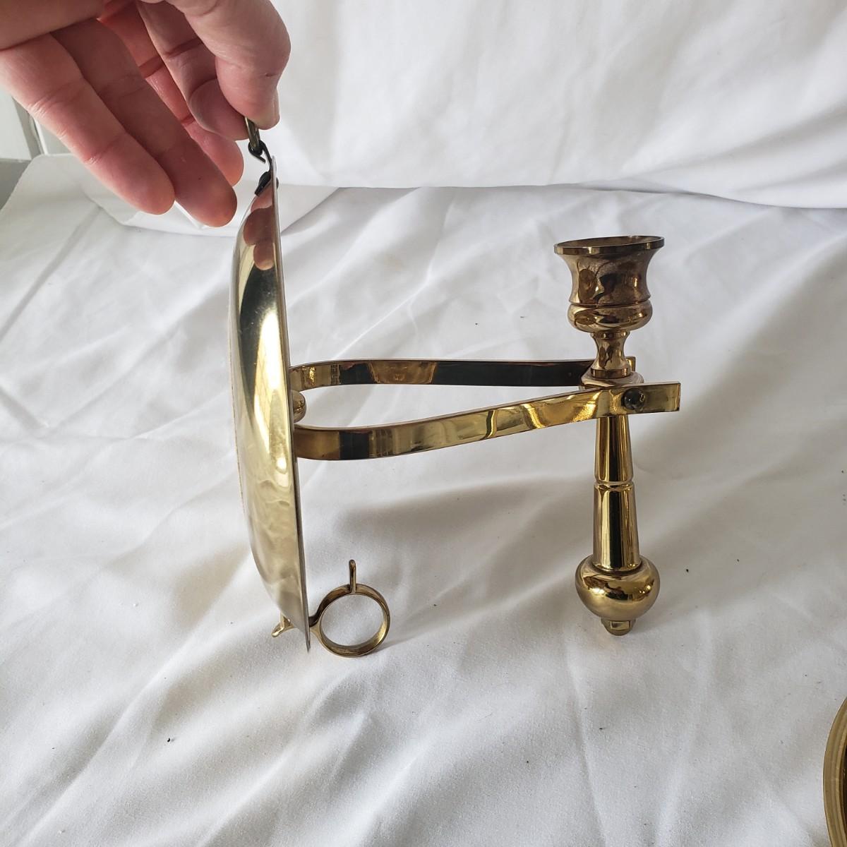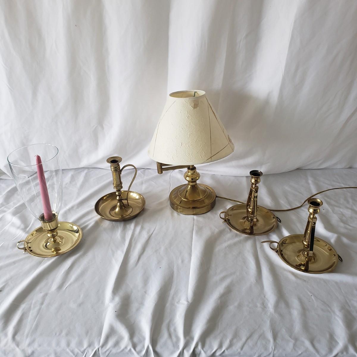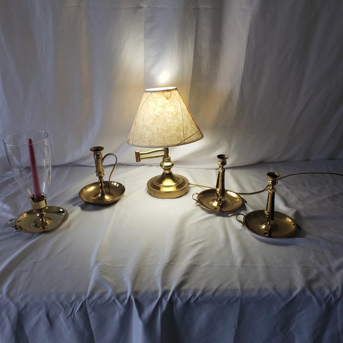 This brass collection features two matching Baldwin nautical gimbal candle holders or mount to the wall for sconces. The brass candle holder with a clear glass globe measures 5" x 11"H. The brass table lamp can extend out or in. The lamp powers on when plugged in.