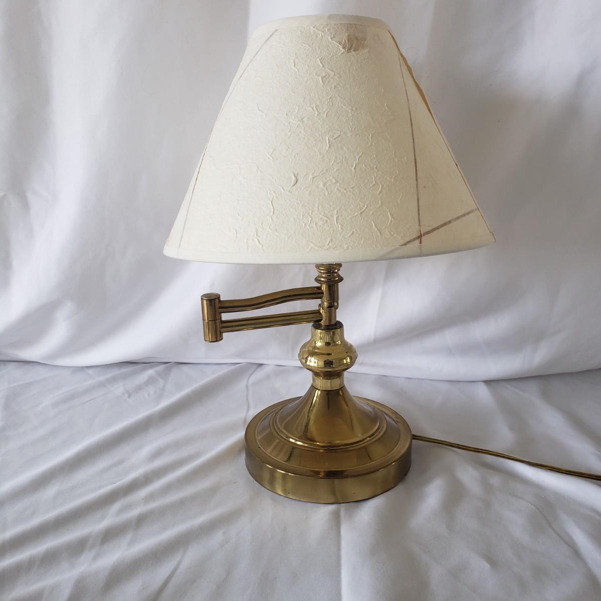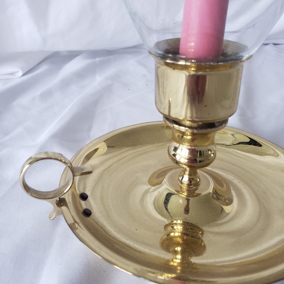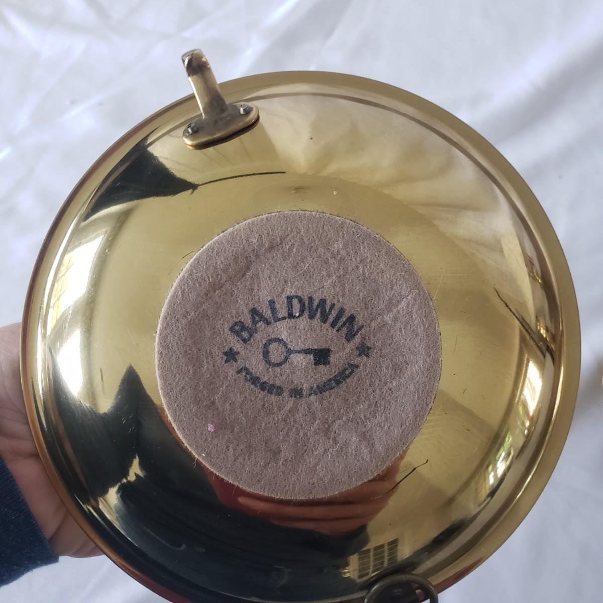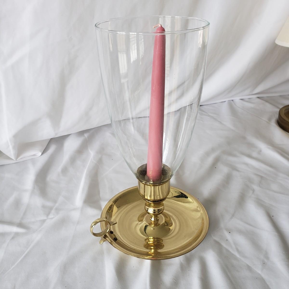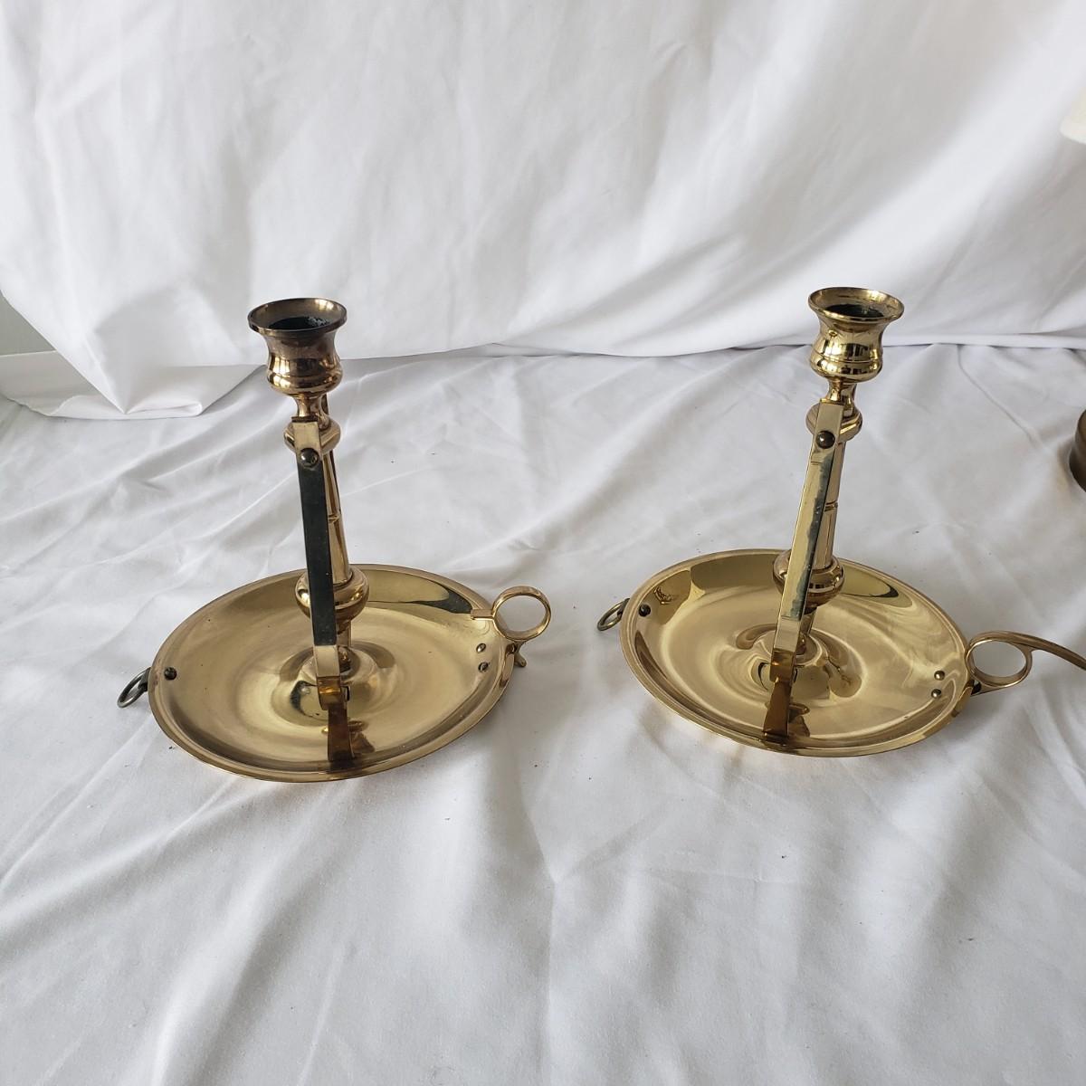 This brass collection features two matching Baldwin nautical gimbal candle holders or mount to the wall for sconces. The brass candle holder with a clear glass globe measures 5" x 11"H. The brass table lamp can extend out or in. The lamp powers on when plugged in.