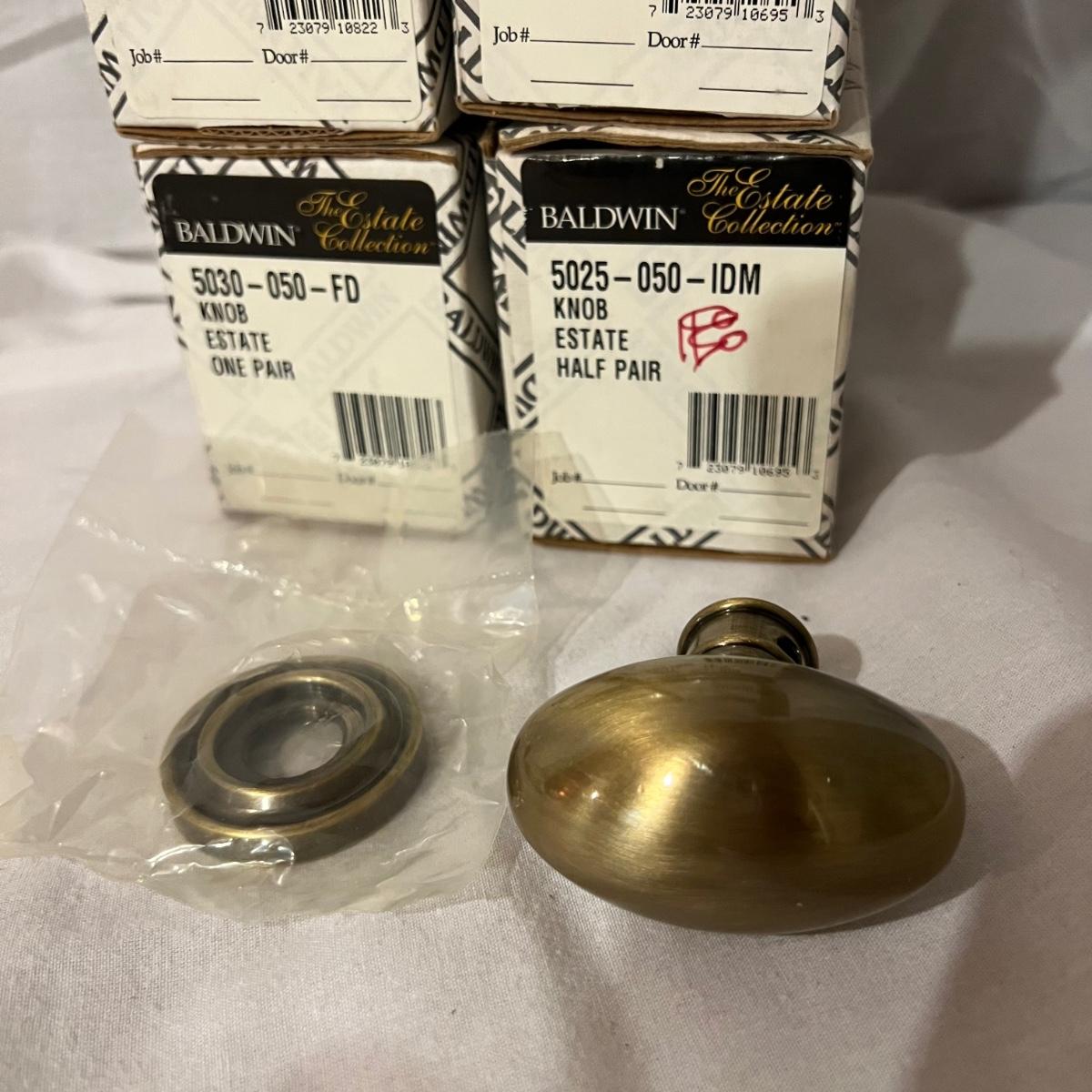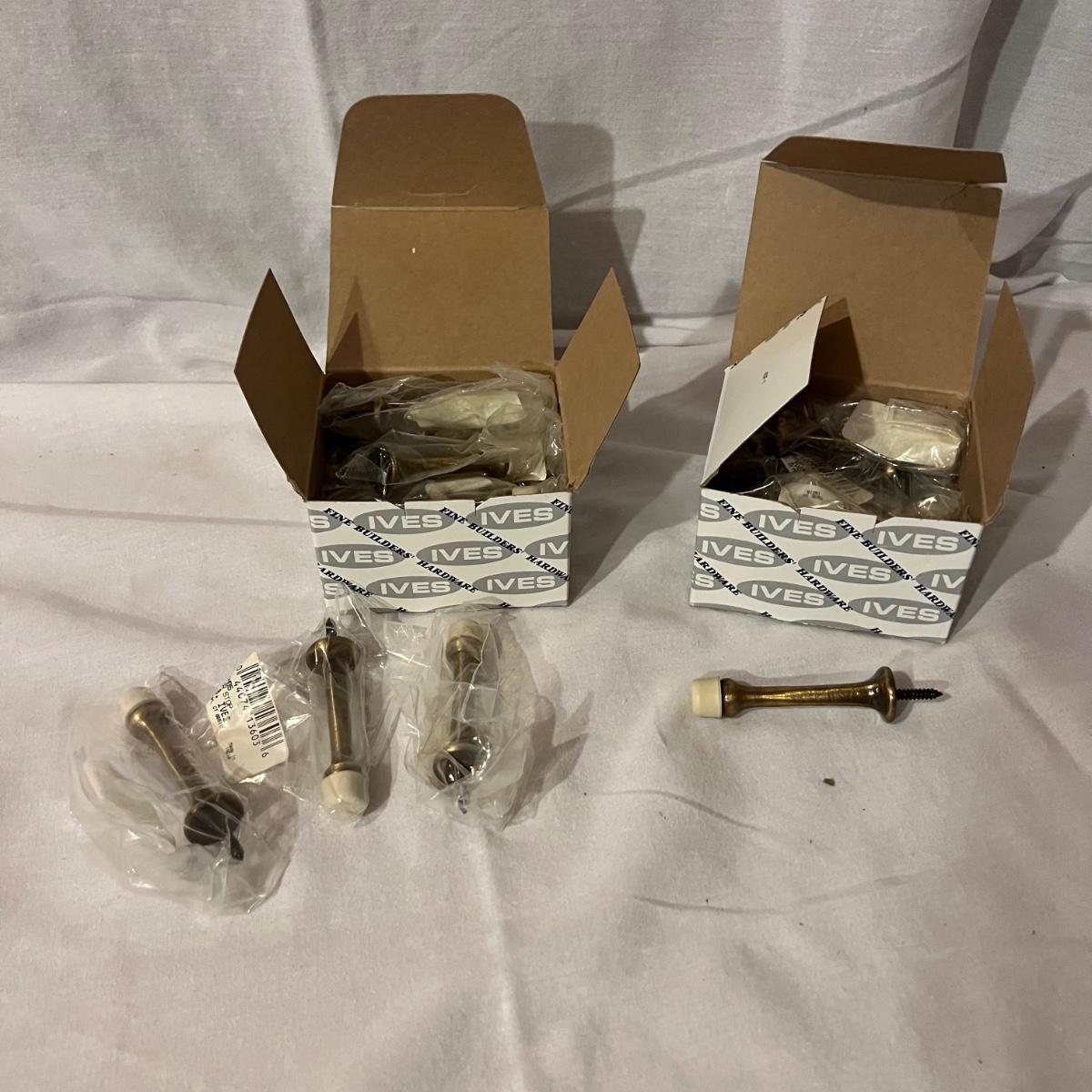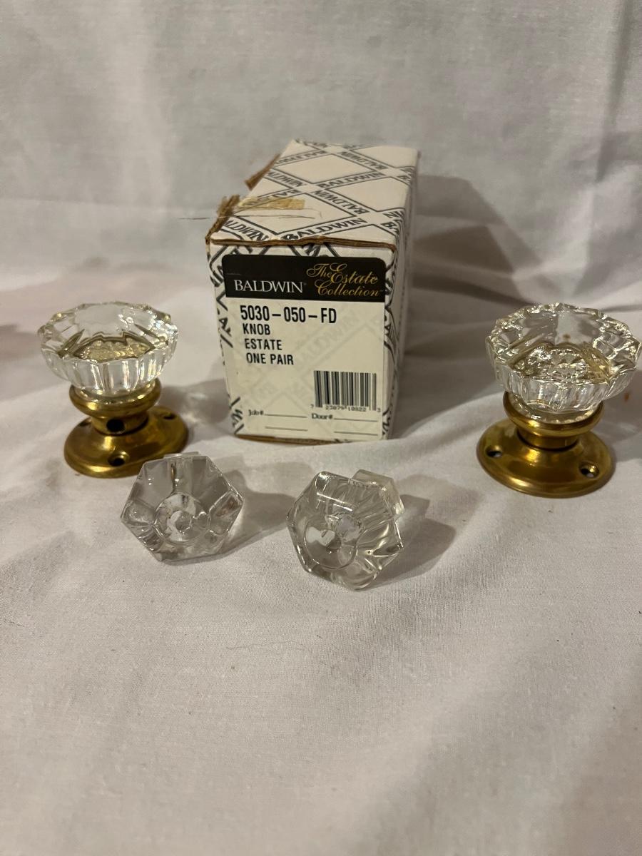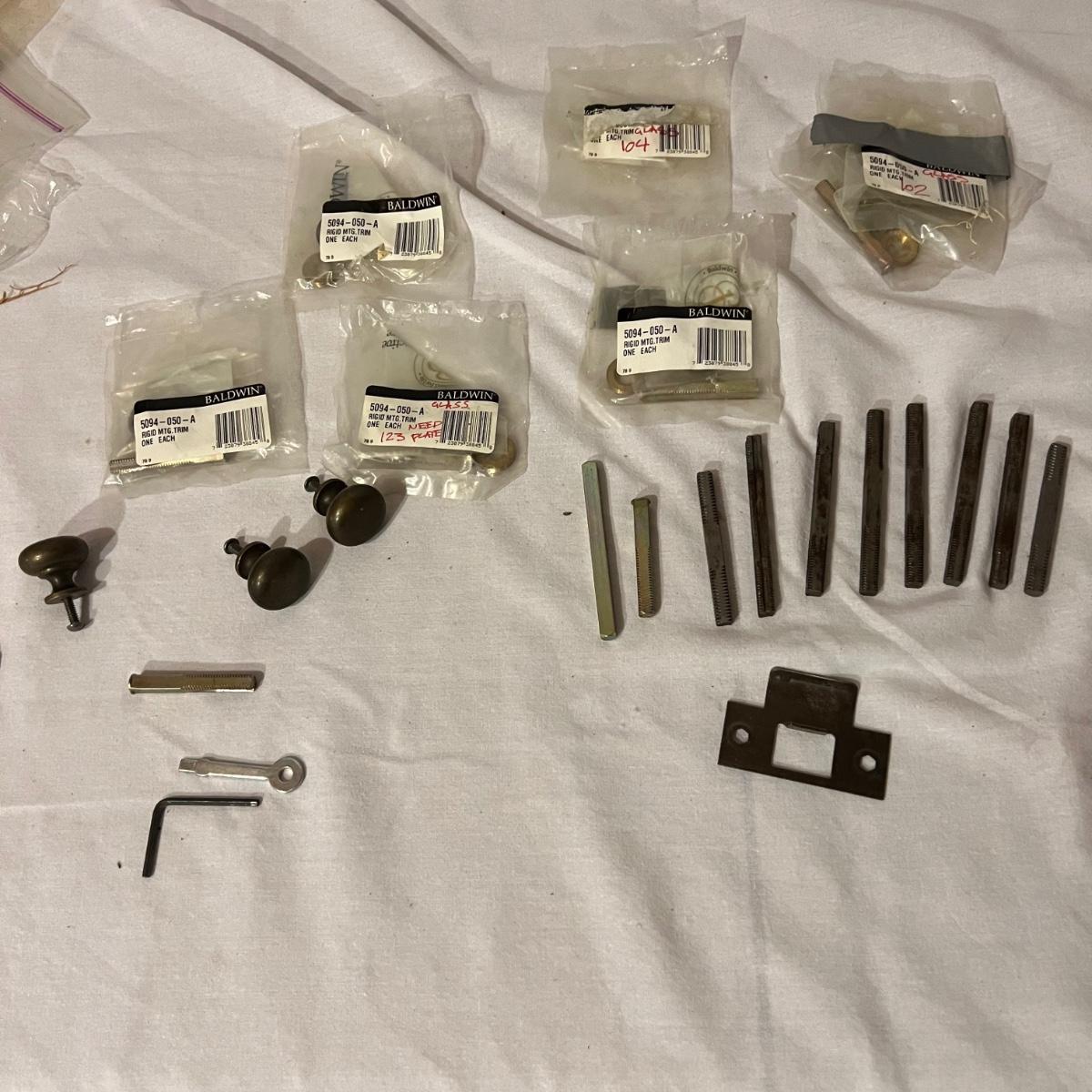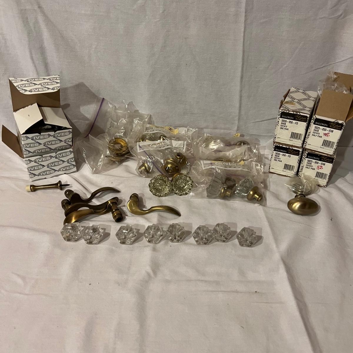 An assortment of door, hardware, and parts. For new in box, Baldwin, estate style door knobs. Eight glass pulls and six sets of glass door knobs (2 per set) also included two boxes of brass colored doorstops (22) new in wrapper. Also, an assortment of small white hardware pieces, and parts that appear to match the elements in the boxes.