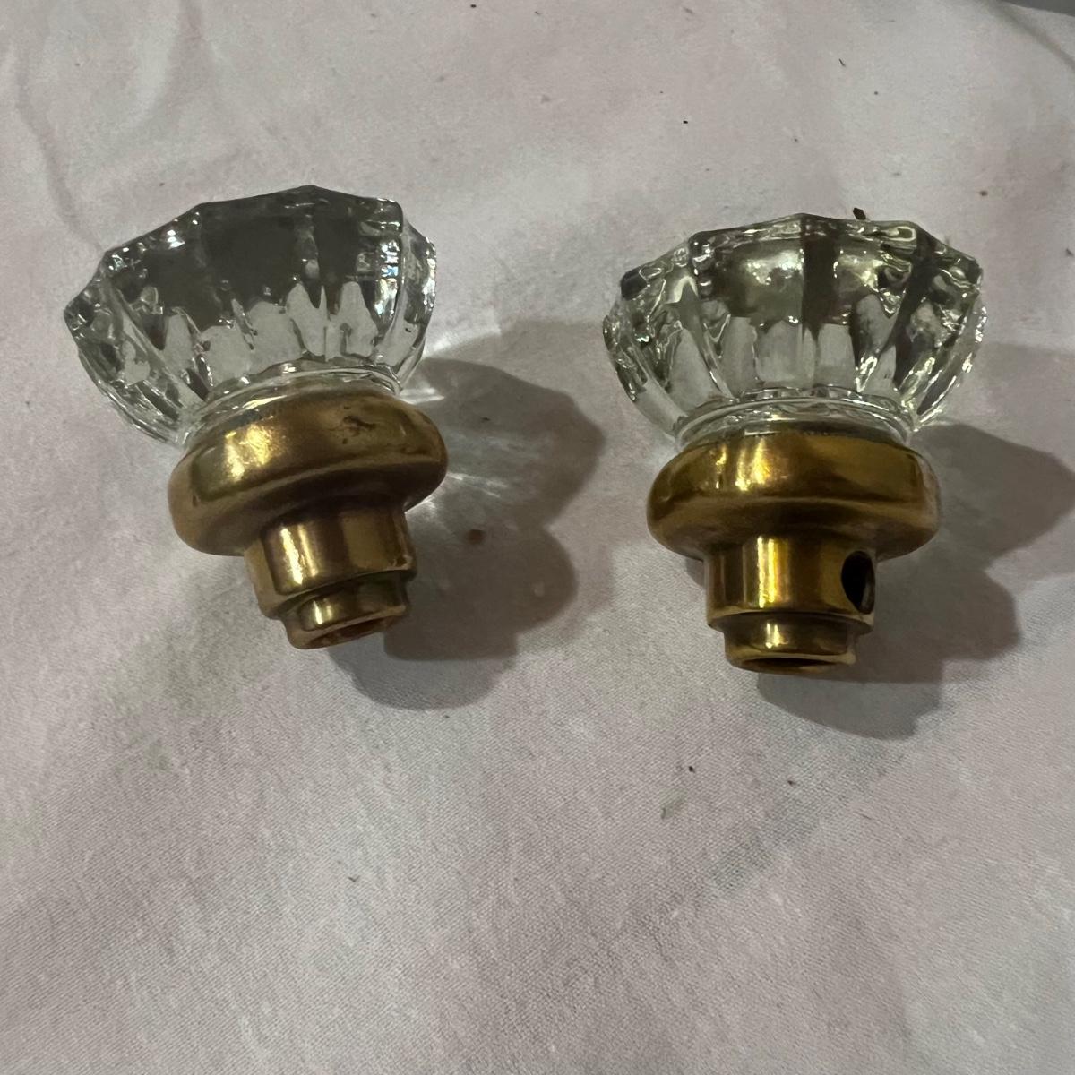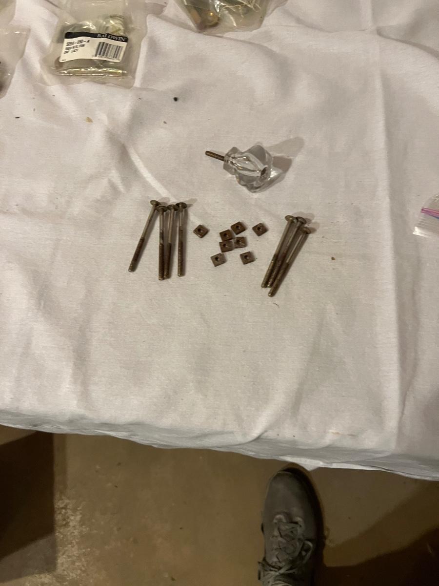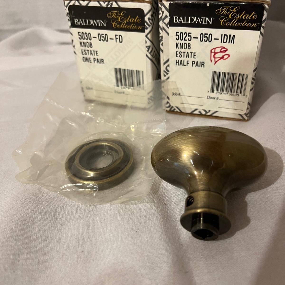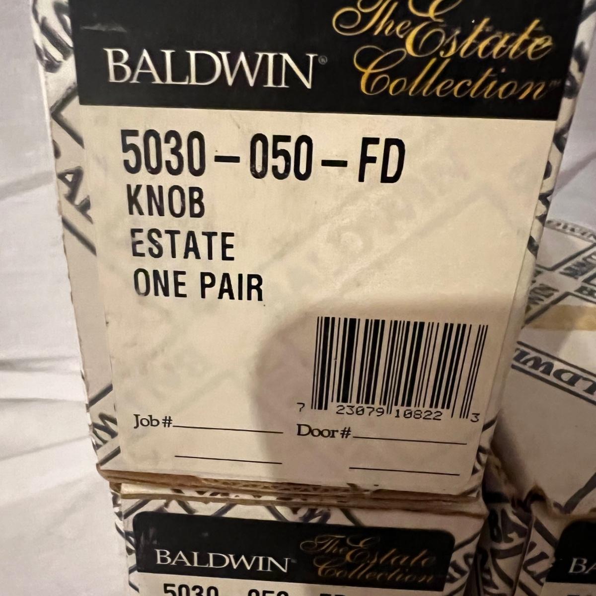 An assortment of door, hardware, and parts. For new in box, Baldwin, estate style door knobs. Eight glass pulls and six sets of glass door knobs (2 per set) also included two boxes of brass colored doorstops (22) new in wrapper. Also, an assortment of small white hardware pieces, and parts that appear to match the elements in the boxes.