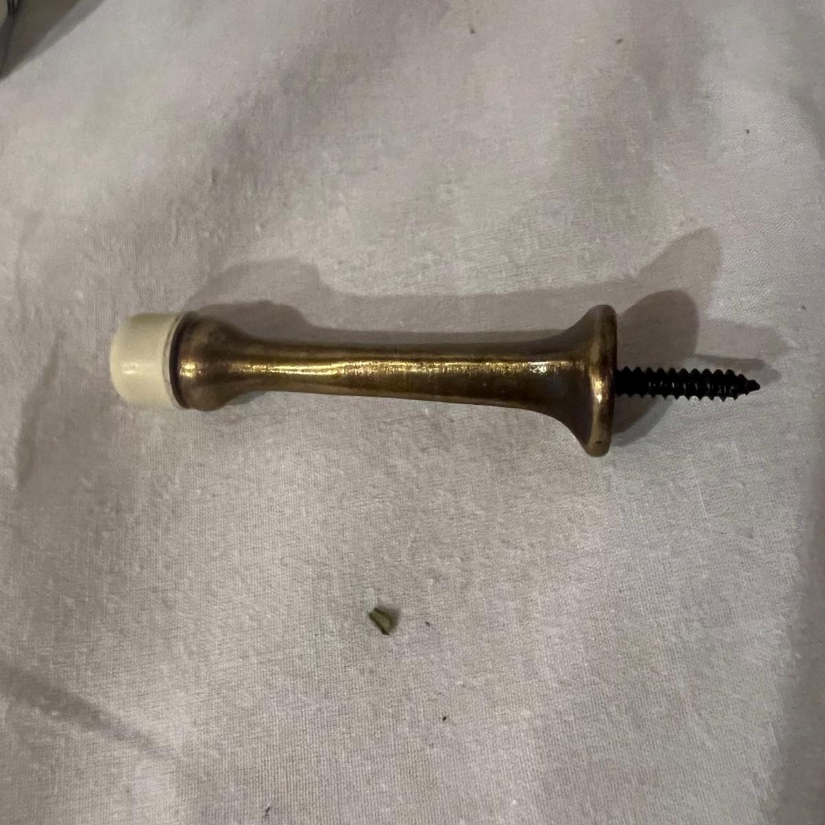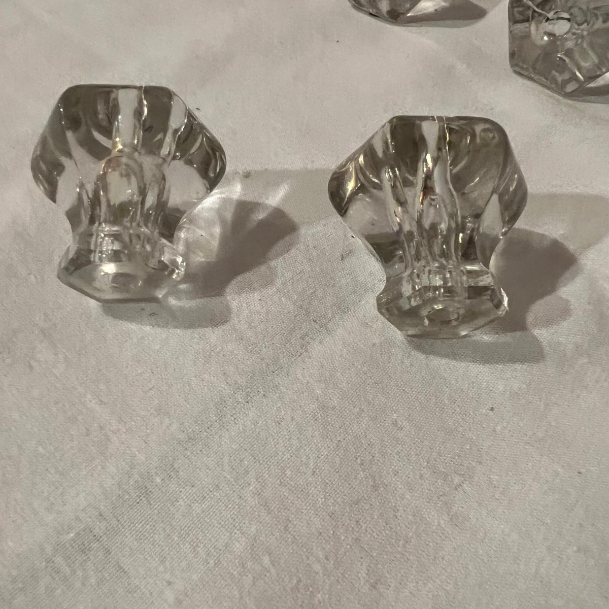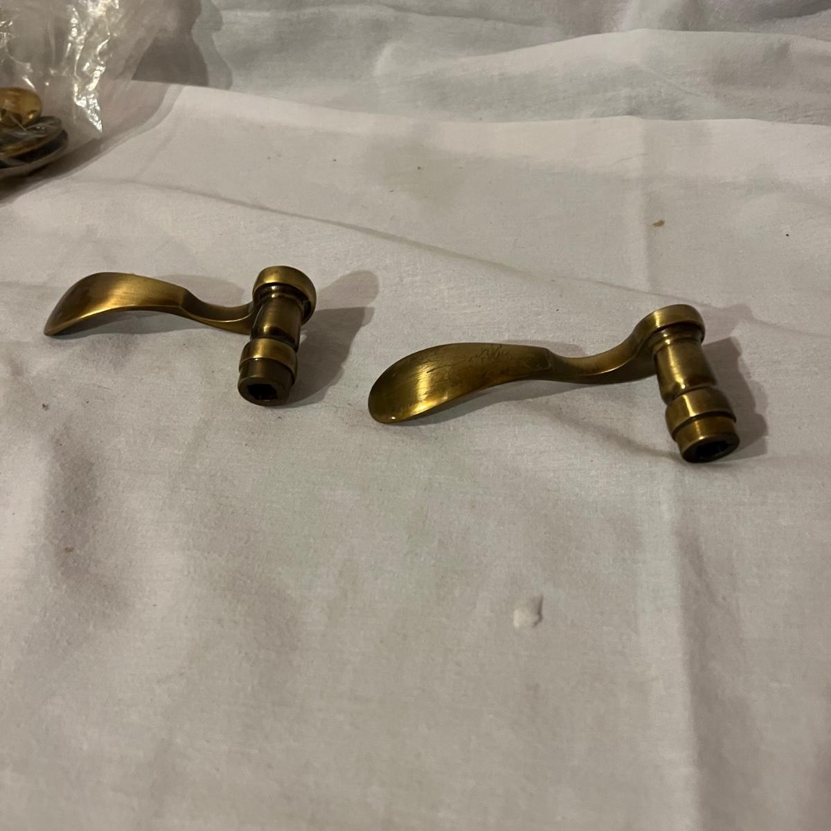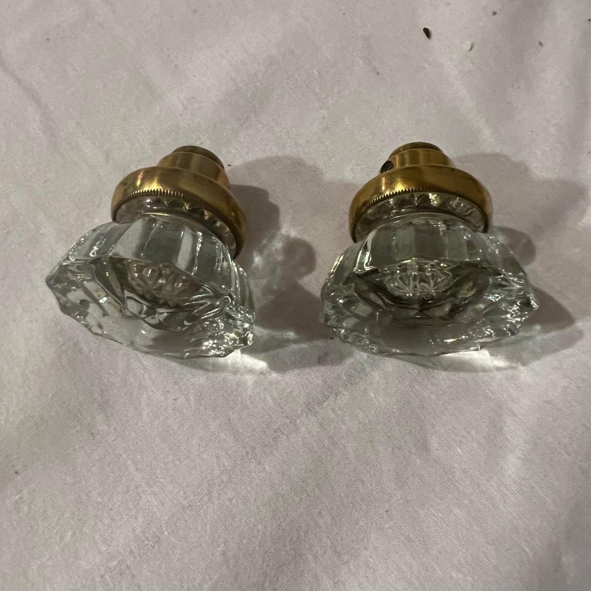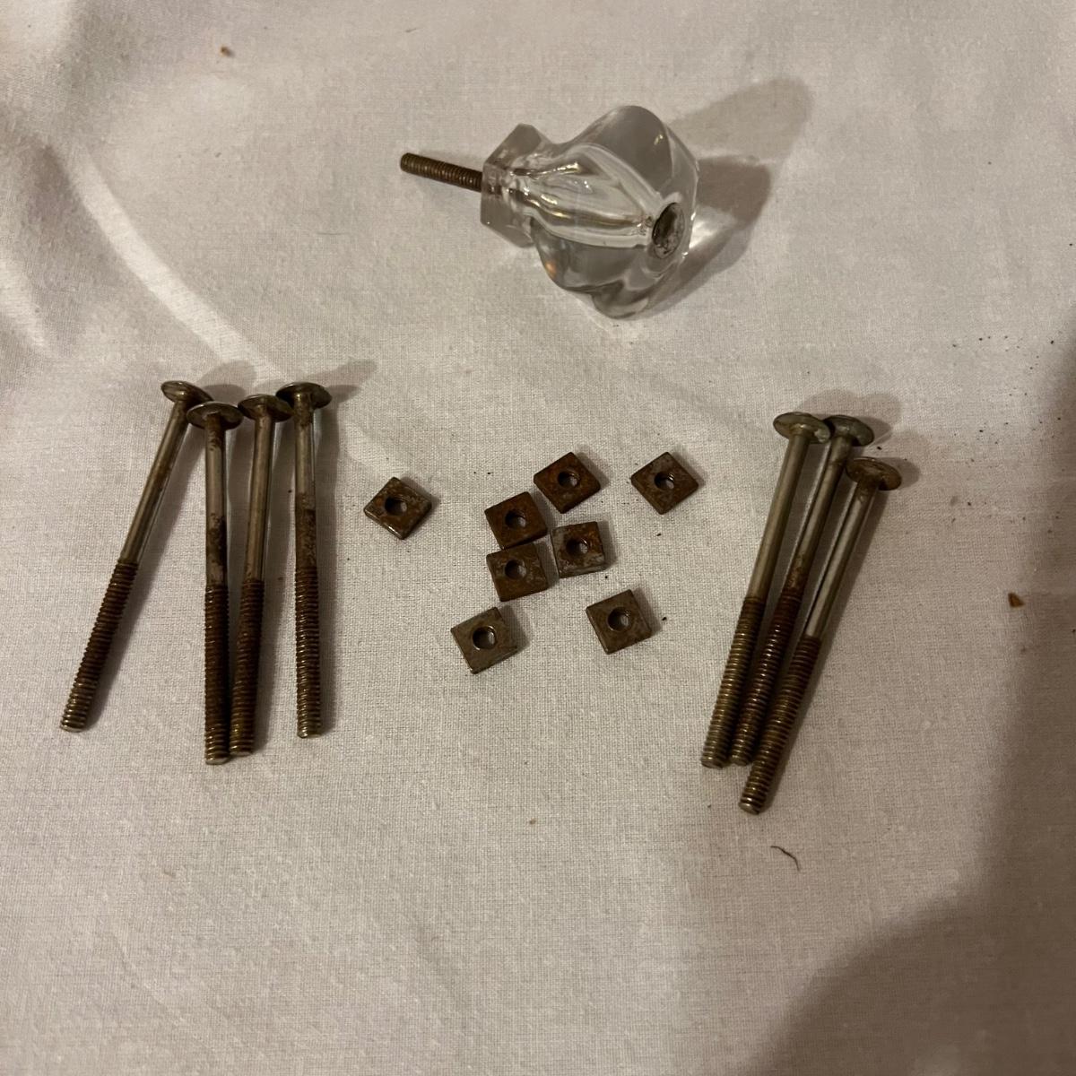 An assortment of door, hardware, and parts. For new in box, Baldwin, estate style door knobs. Eight glass pulls and six sets of glass door knobs (2 per set) also included two boxes of brass colored doorstops (22) new in wrapper. Also, an assortment of small white hardware pieces, and parts that appear to match the elements in the boxes.