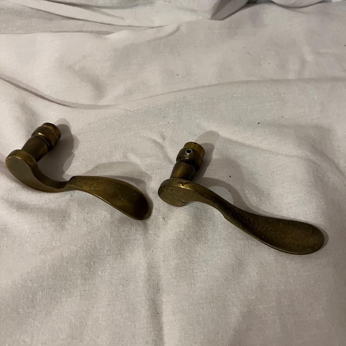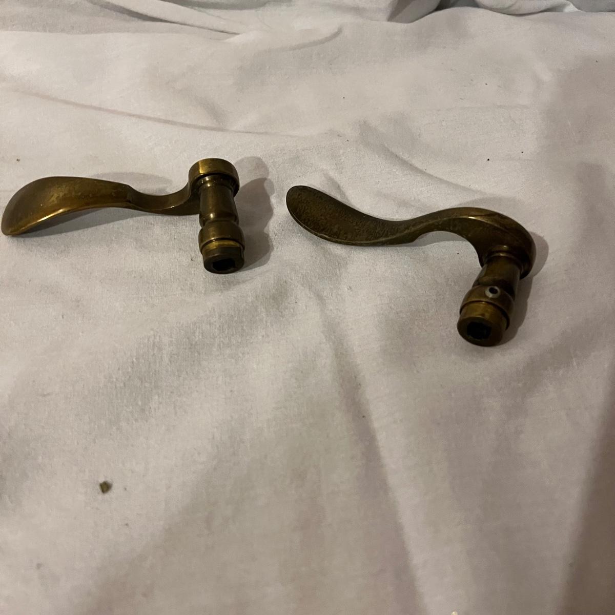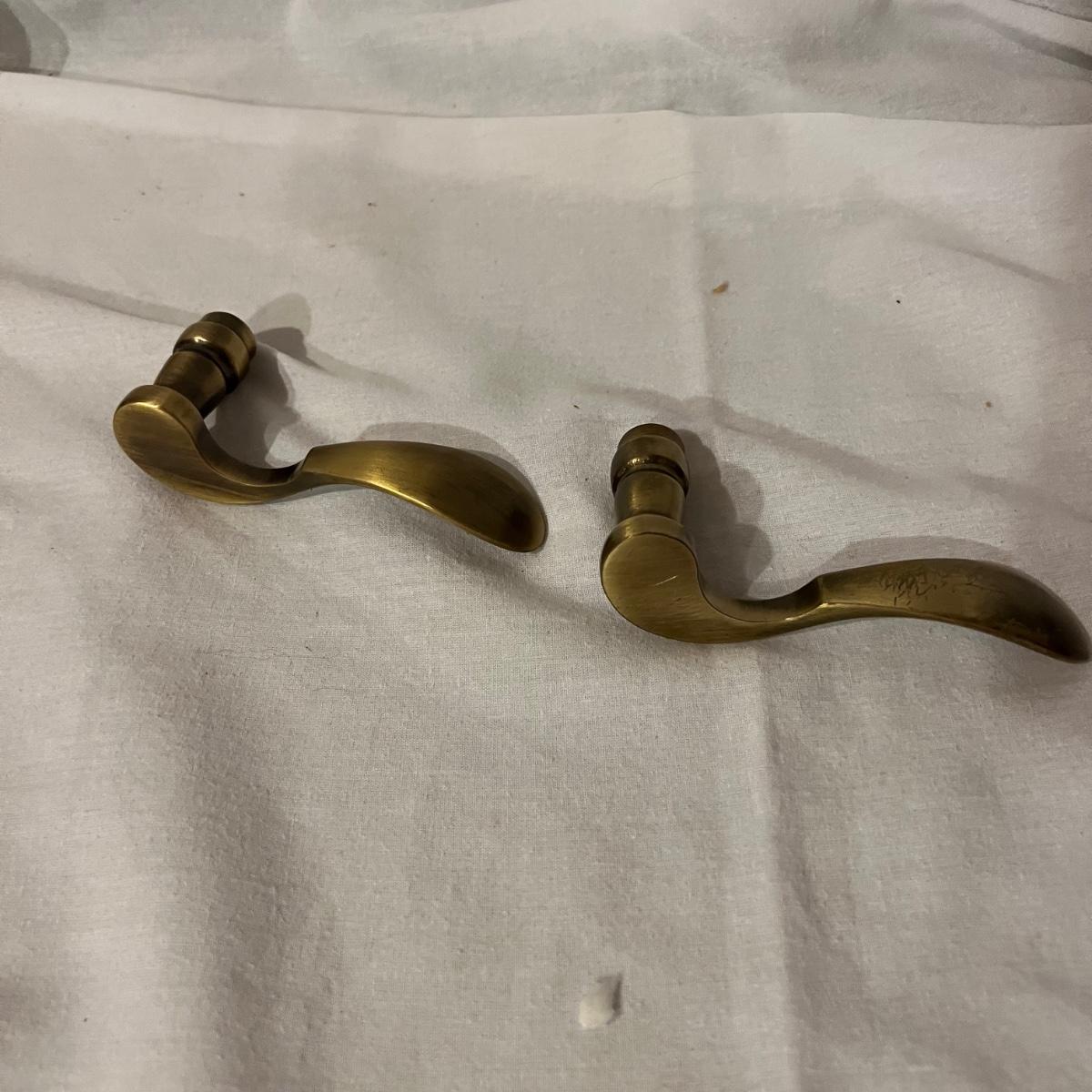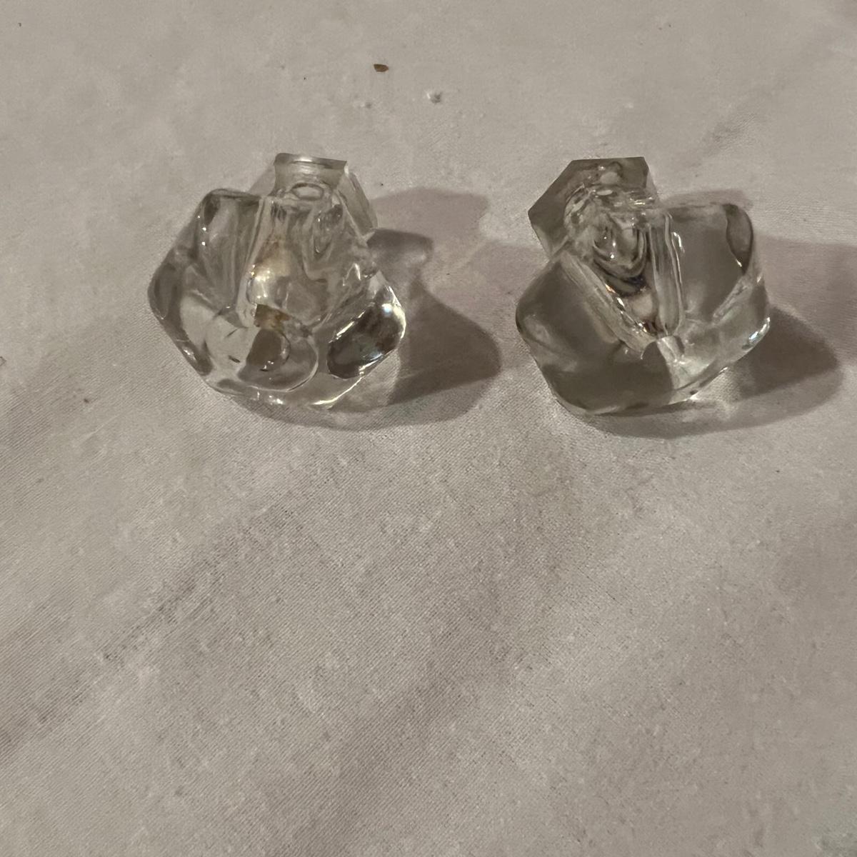 An assortment of door, hardware, and parts. For new in box, Baldwin, estate style door knobs. Eight glass pulls and six sets of glass door knobs (2 per set) also included two boxes of brass colored doorstops (22) new in wrapper. Also, an assortment of small white hardware pieces, and parts that appear to match the elements in the boxes.