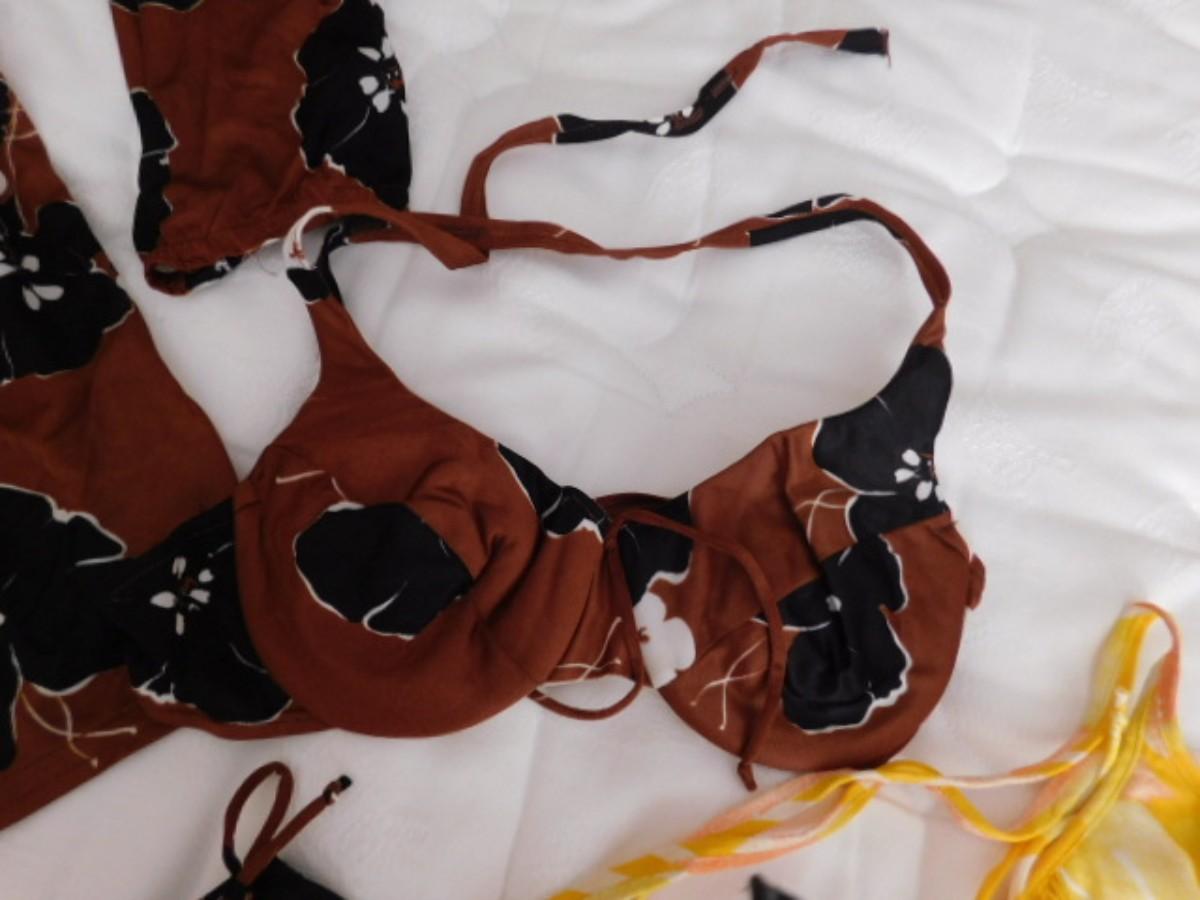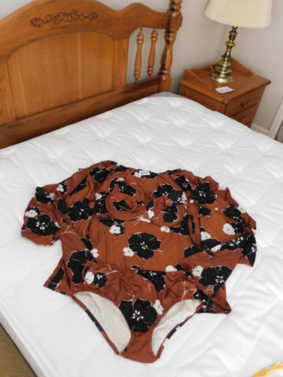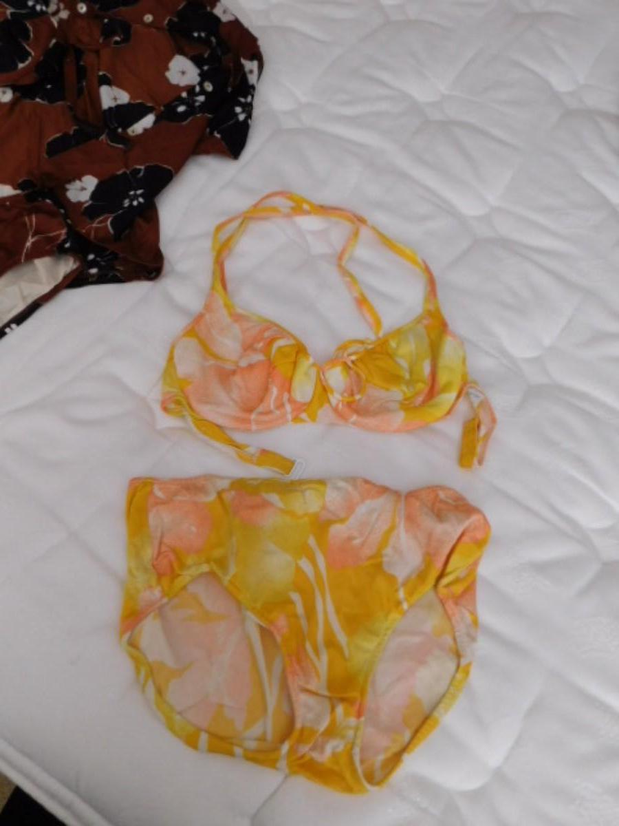 THEY BOTH HAVE A 34C TOP AND A LARGE BOTTOM, THE BROWN MATCHING COVER SHIRT IS A MEDIUM