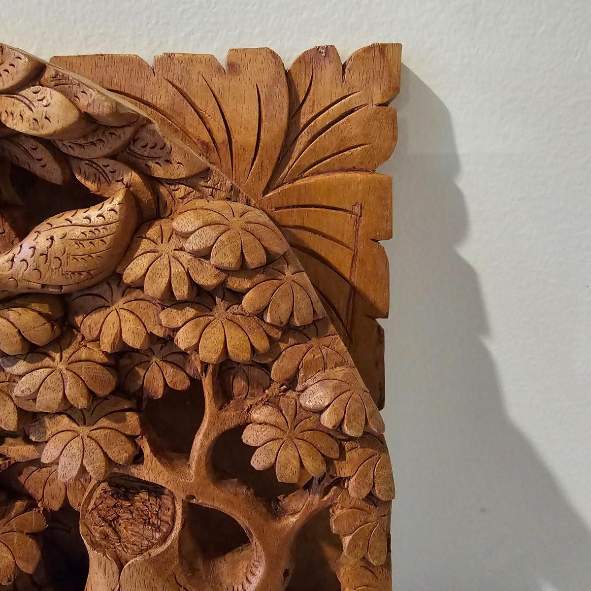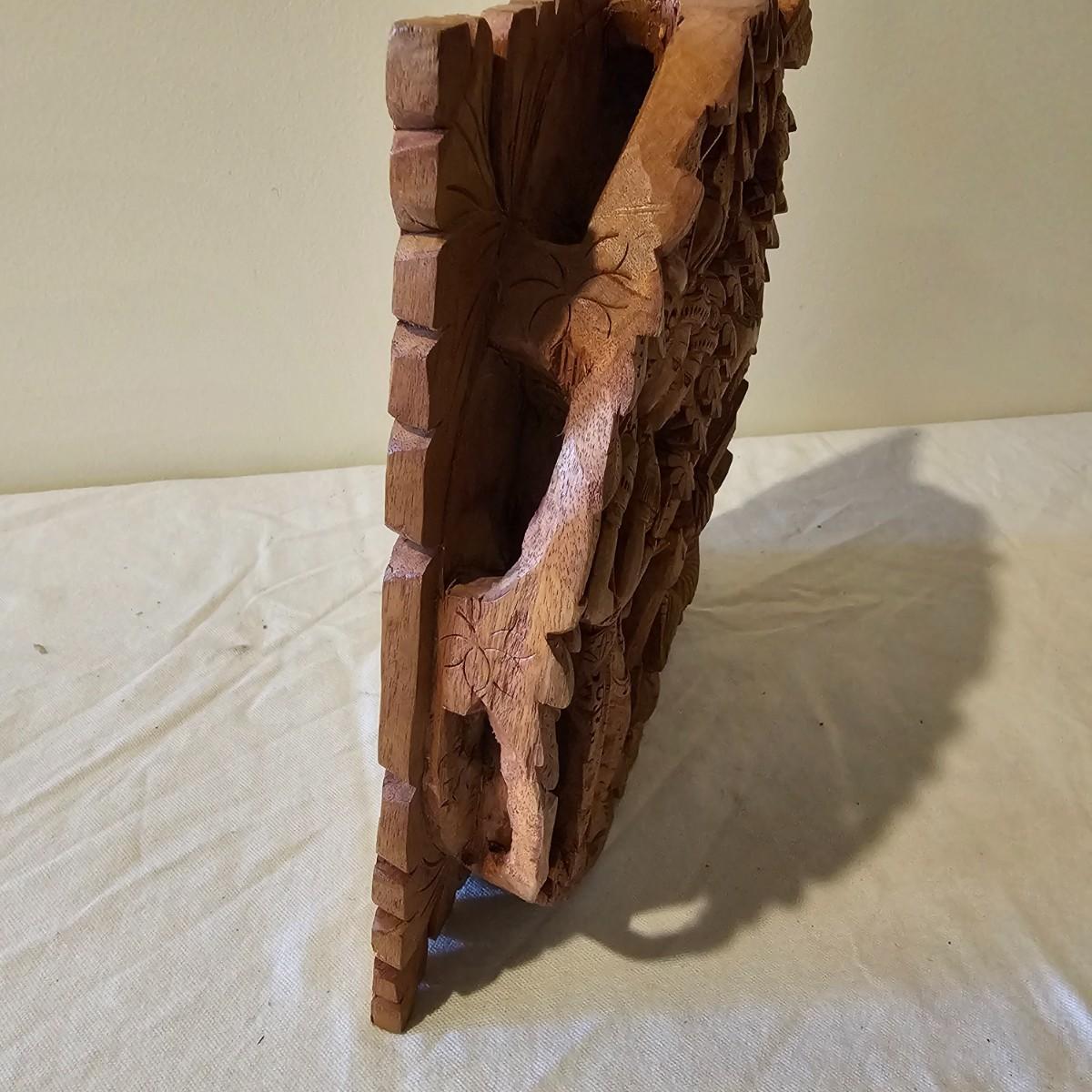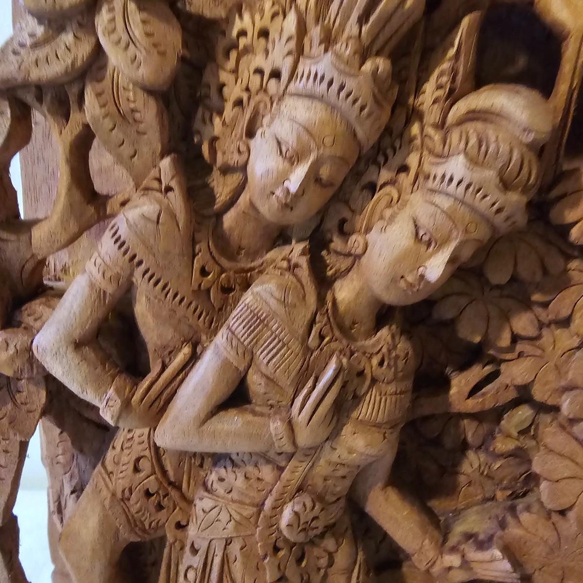 Very detailed depiction of a forest glade with Bali figures, animals and more. Deep 3-D effect shows design from all sides. Item may be teakwood, measures 10" x 2" x 10"H. Hanging hook on back. See photos for details. Shipping available.