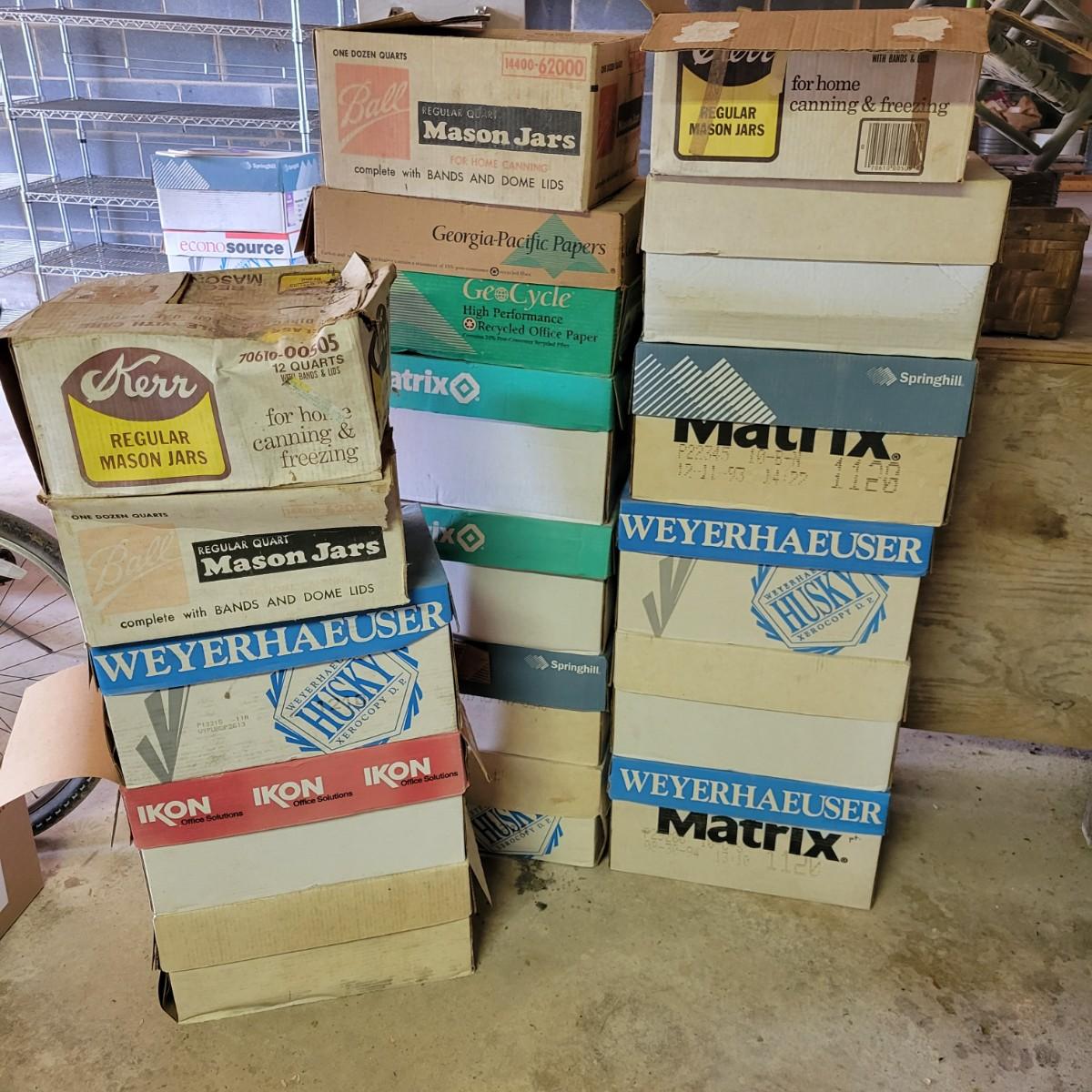 A huge assortment of canning jars manufactured by Ball and Atlas. There are 17 boxes of quart jars. The larger boxes have an average of a dozen jars in each one. There is over 100 quart jars in this lot and two bags of bands. Local pickup only