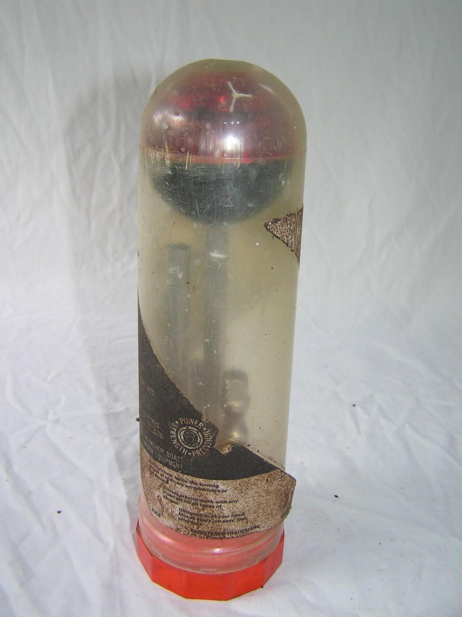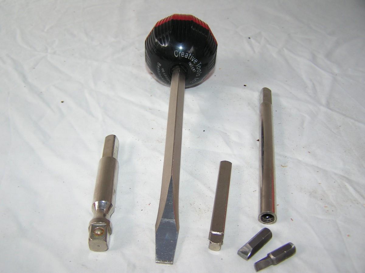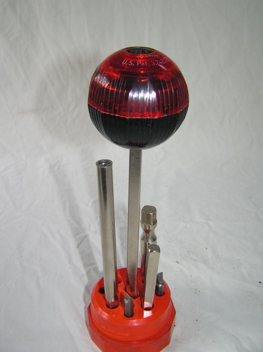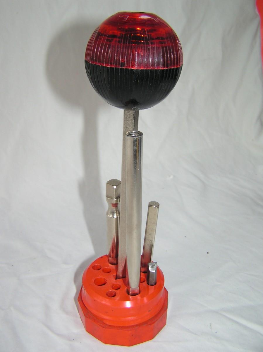 Ball Head ratcheting driver tool set. W/large flat blad screw driver bit, 3/8" drive socket adapter, 1/4" drive socket adapter, 1/4" hex bit adapter & bits, tool stand with integral tool cover. Handy! Handy!