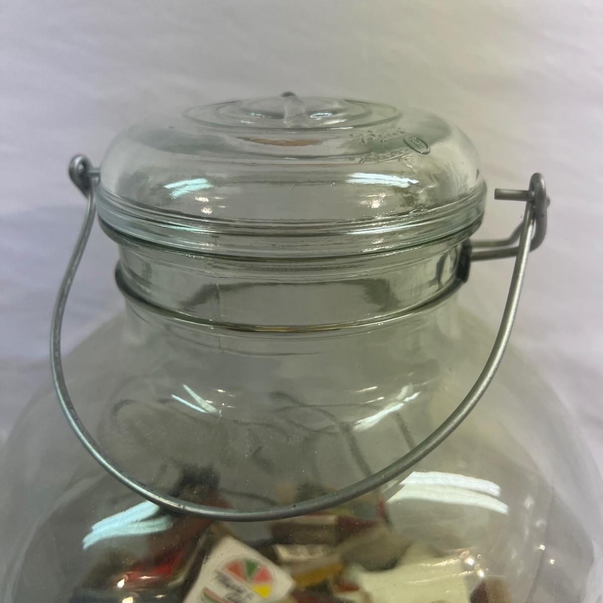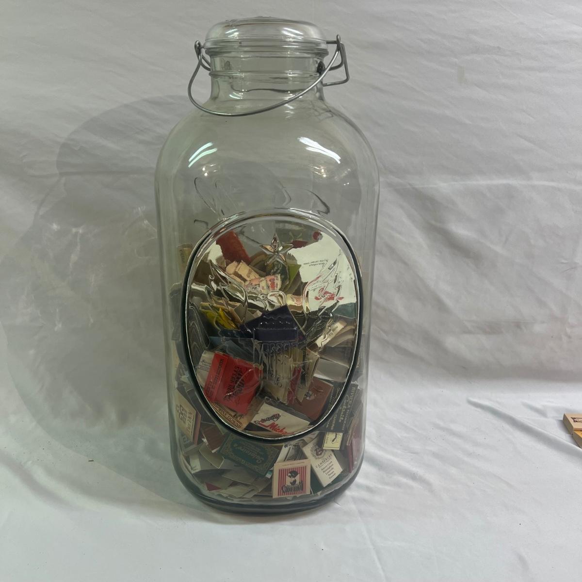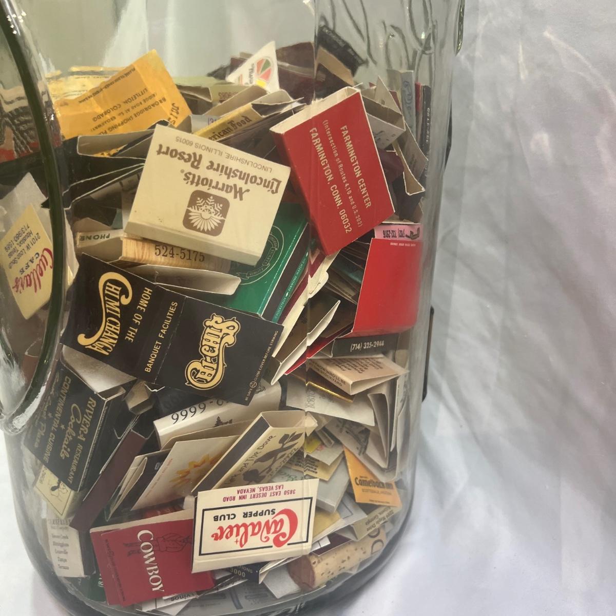 A very large ball jar measures 9”D x 20”H. It is filled with a large assortment of matchbook covers from around the world.