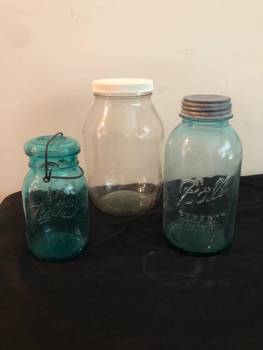 This lot has seven items: three Ball jars, three Golden Harvest jars and a lidded blue jar. The Ball jar with white lid measures 5.5” in diameter and stands 10.5” tall. The blue Ball jar with vintage lid measures 4.5” in diameter and stands 10” tall. The tallest Golden Harvest jar measures 4” x 4” x 9.5”. Shipping Available.