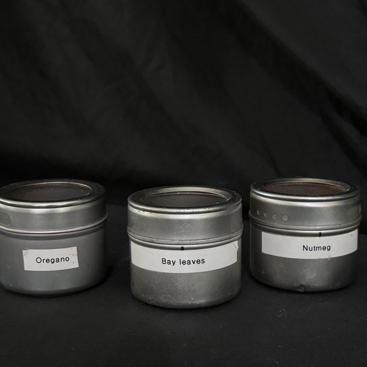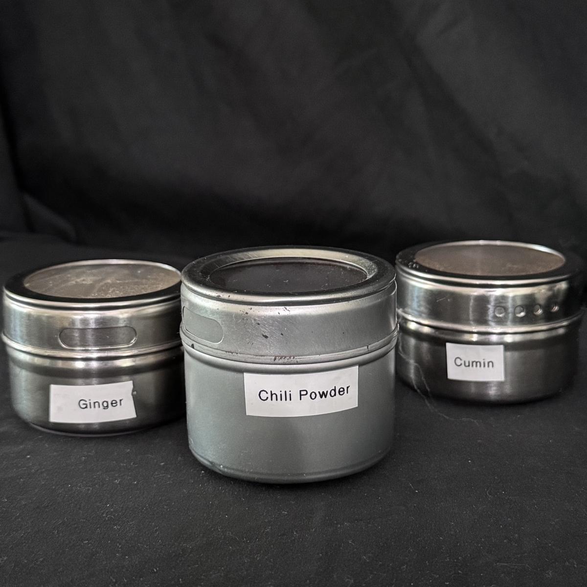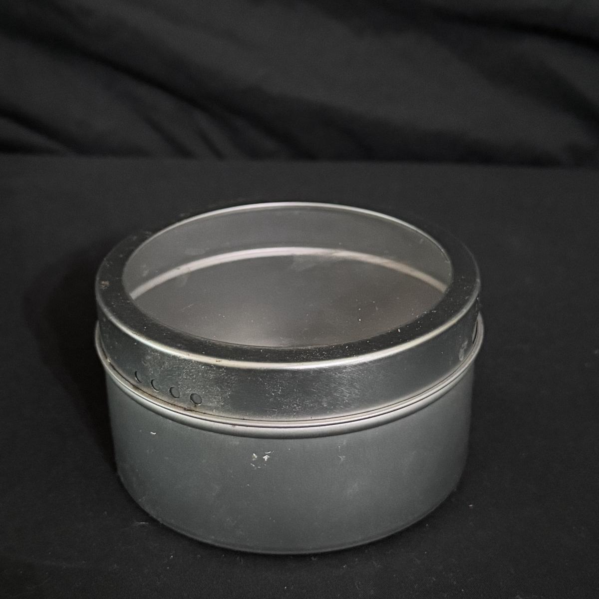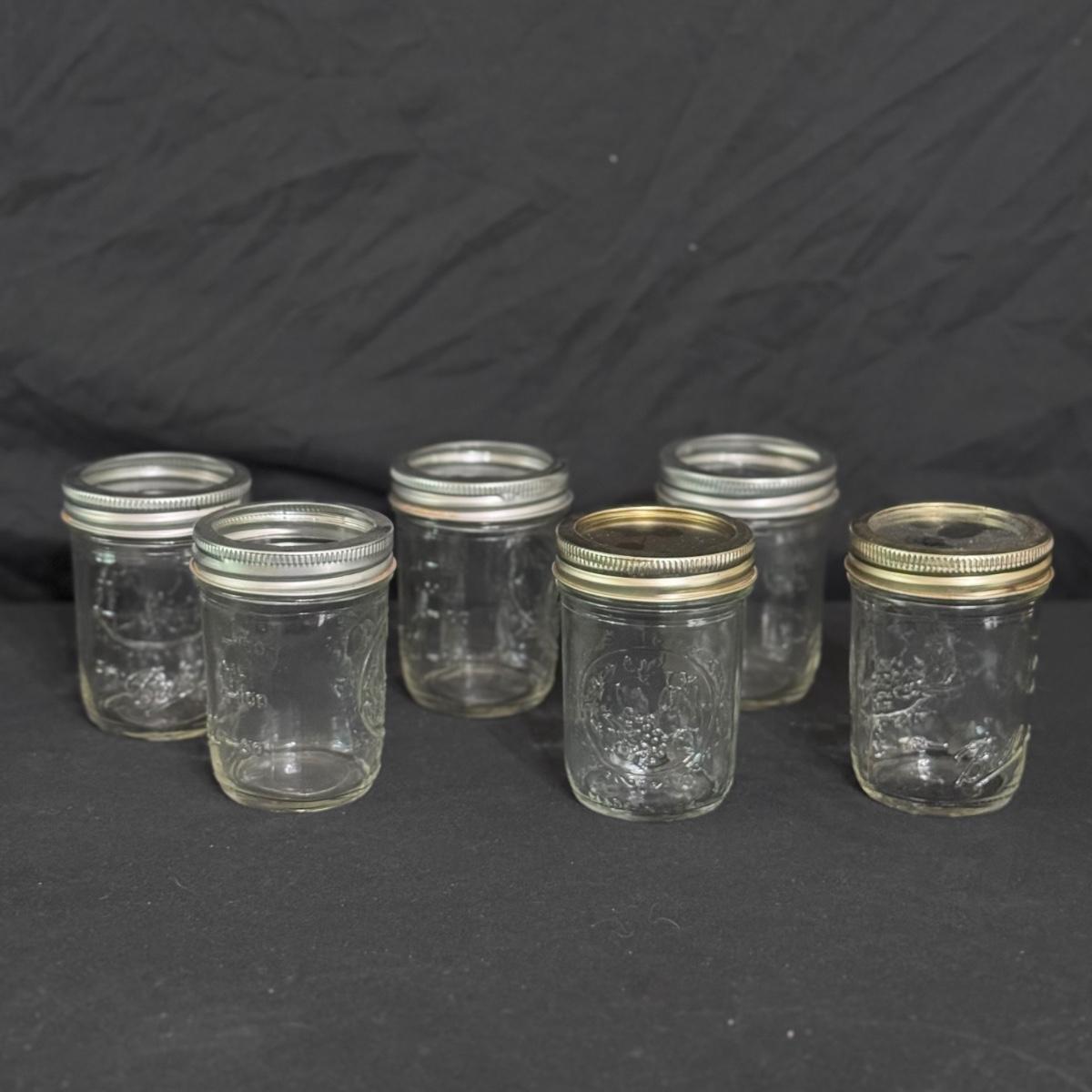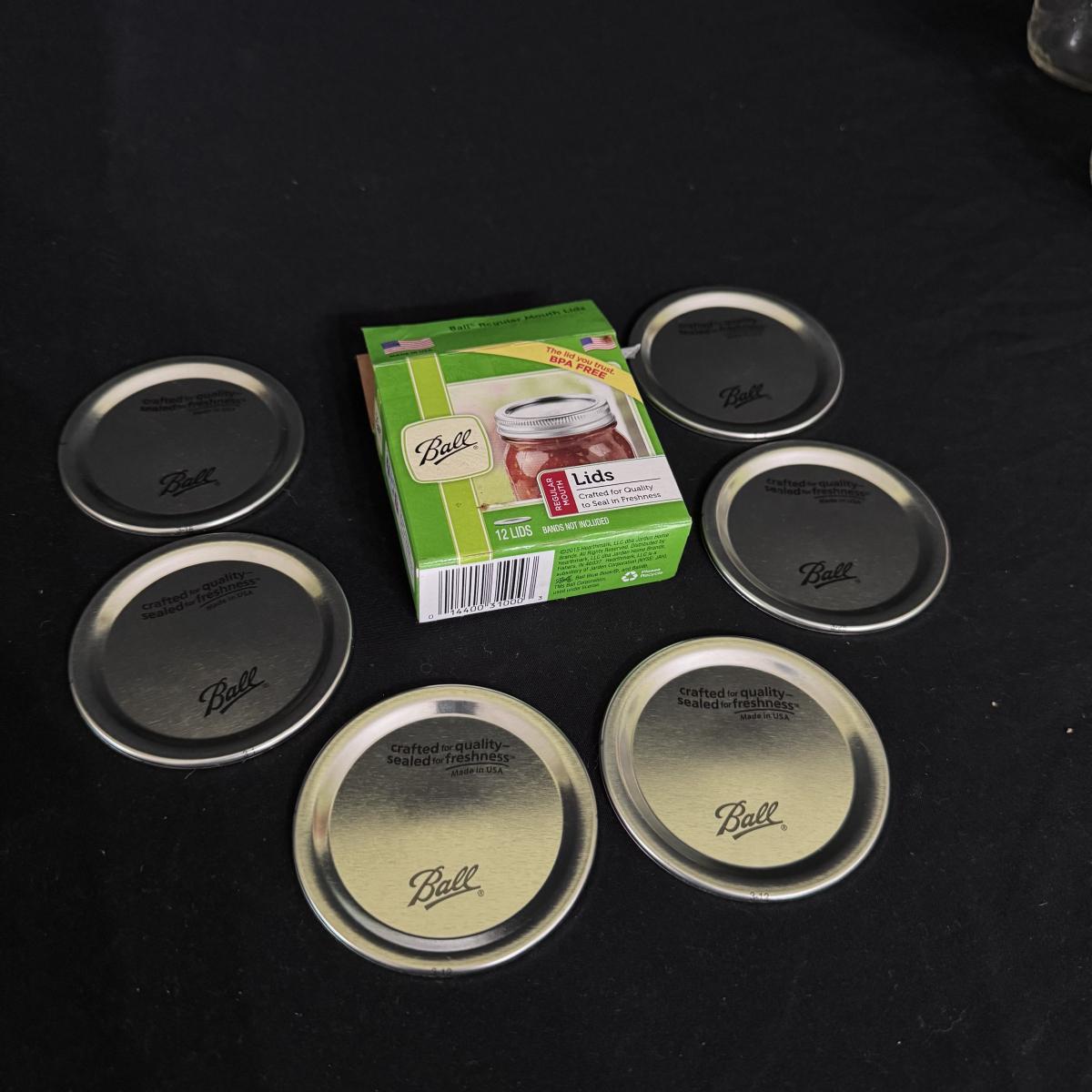 This lot includes six Ball mason jars for canning, six additional lids for the jars, five small glass jars with black metal lids, and five more of the same small glass jars. All contents pictured have been discarded. Lastly, you’ll find eleven metal canisters (some have labels - see pictures), four adhesive labels, and one Kerr mason jar with a green lid. The small glass jars have magnets on the inside of the lids - making it easy to attach to the side of your fridge. The largest mason jar is the Kerr one with the green lid that measures 4” x 5”D.