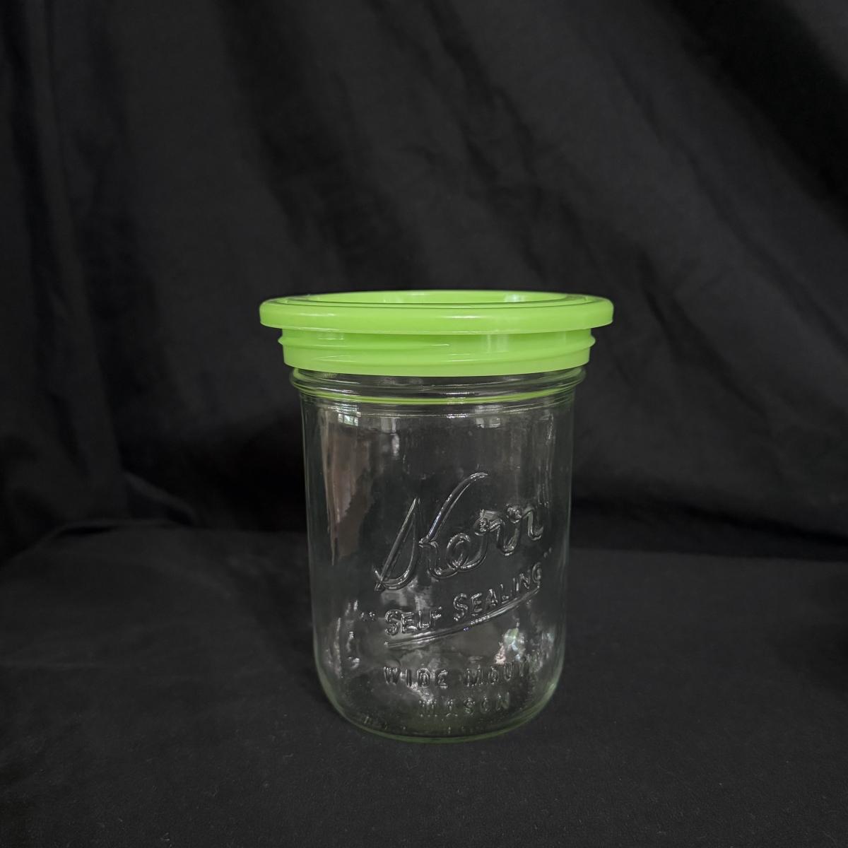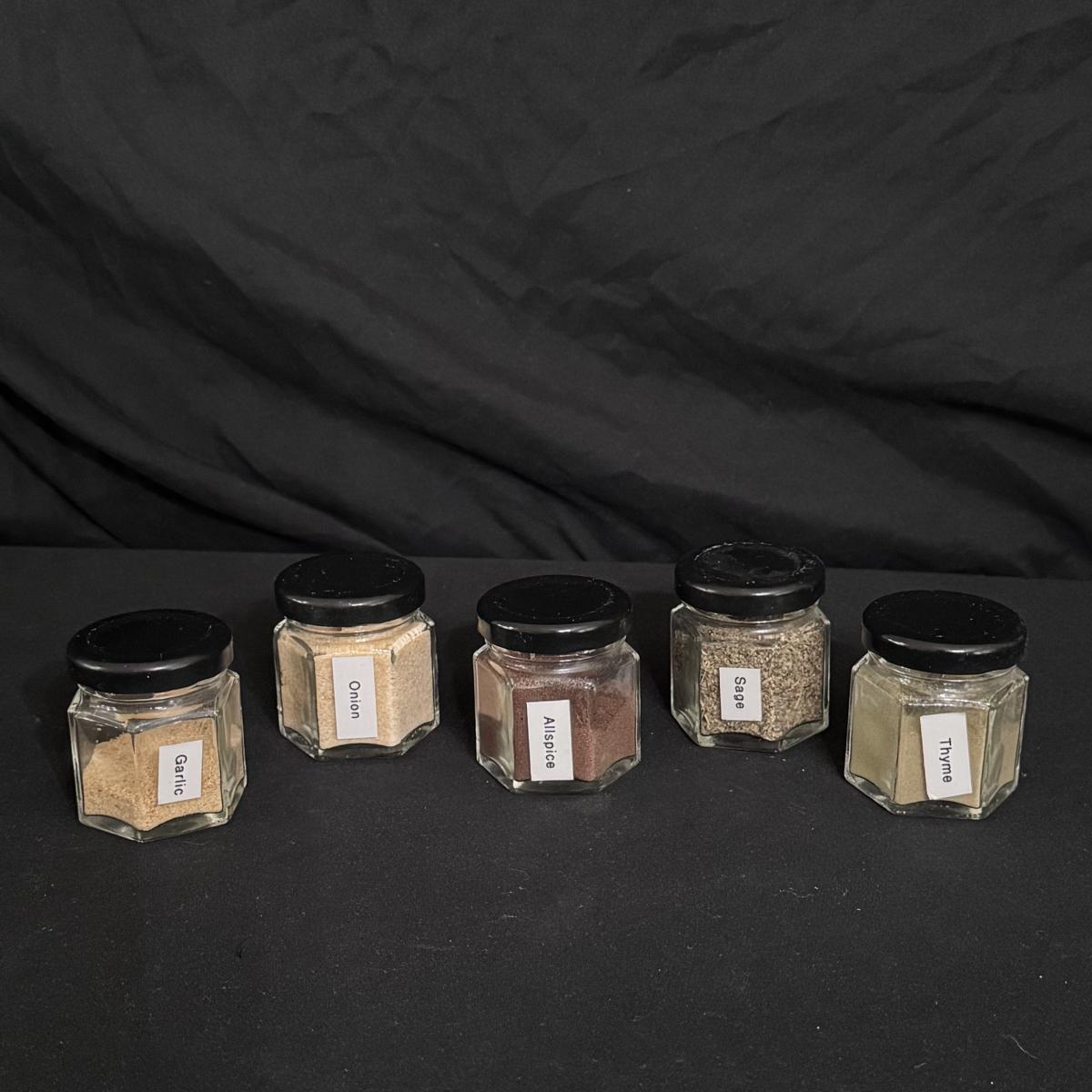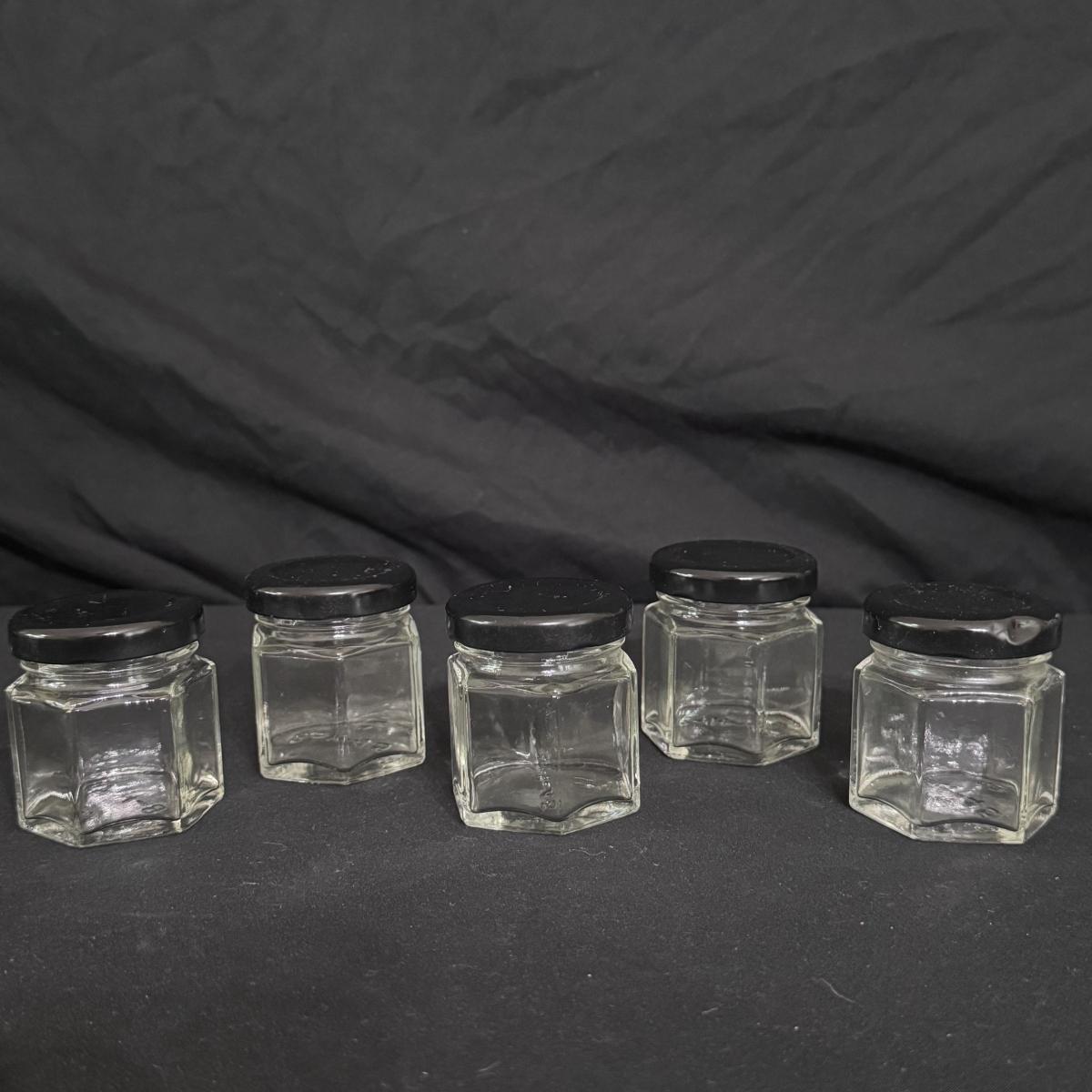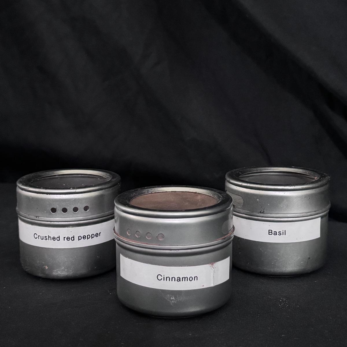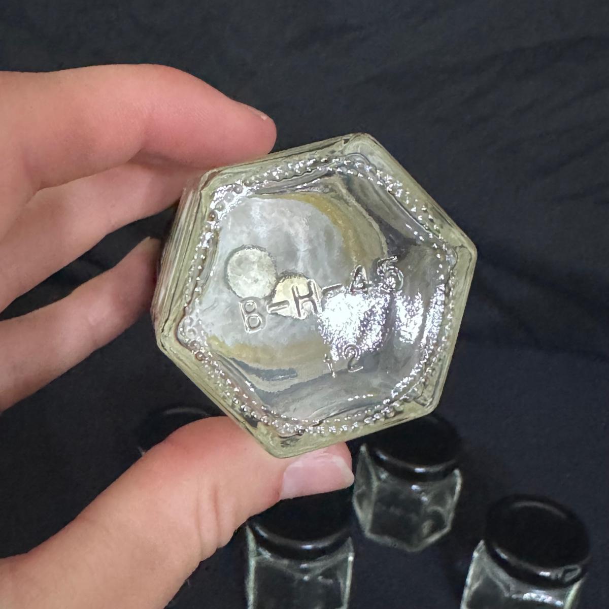 This lot includes six Ball mason jars for canning, six additional lids for the jars, five small glass jars with black metal lids, and five more of the same small glass jars. All contents pictured have been discarded. Lastly, you’ll find eleven metal canisters (some have labels - see pictures), four adhesive labels, and one Kerr mason jar with a green lid. The small glass jars have magnets on the inside of the lids - making it easy to attach to the side of your fridge. The largest mason jar is the Kerr one with the green lid that measures 4” x 5”D.