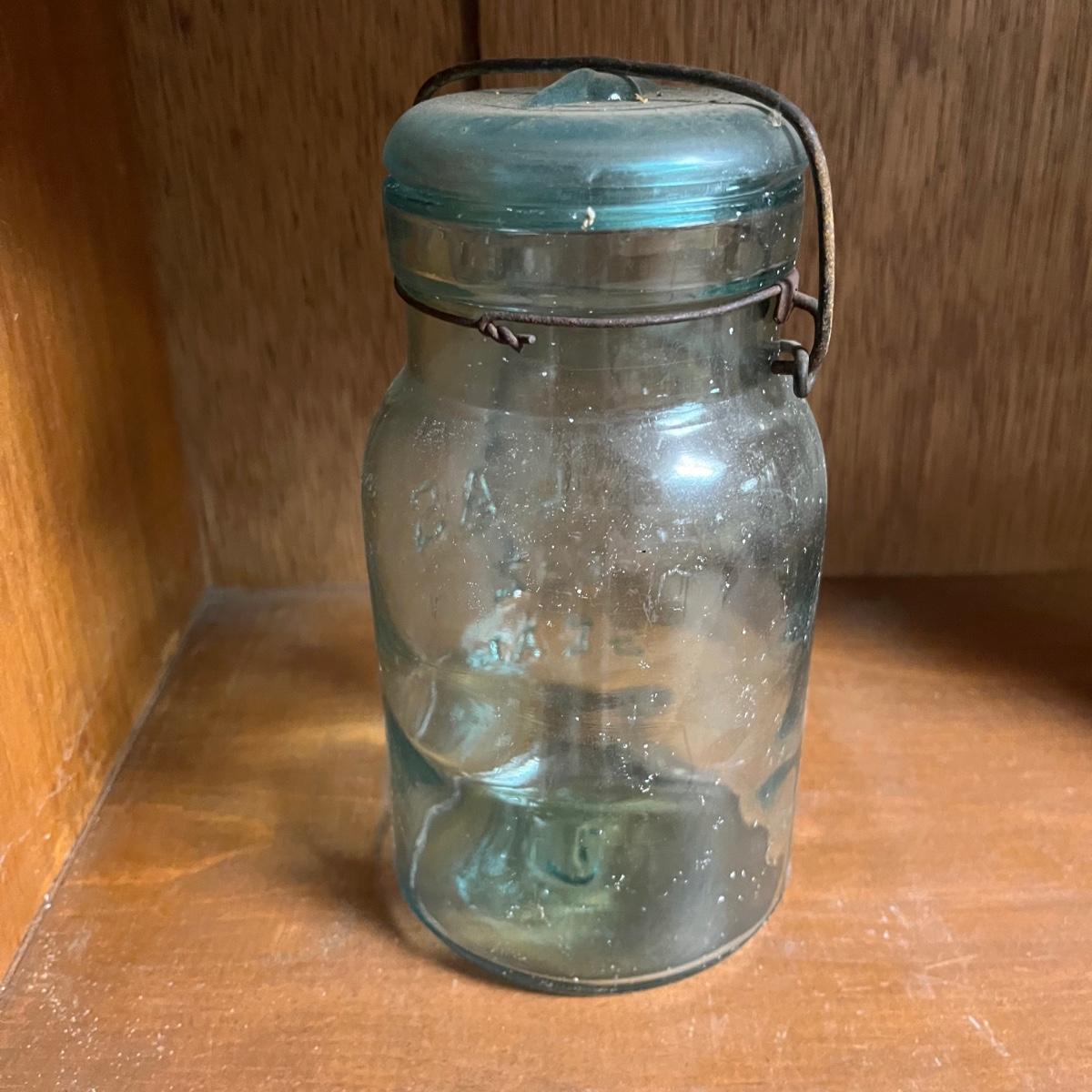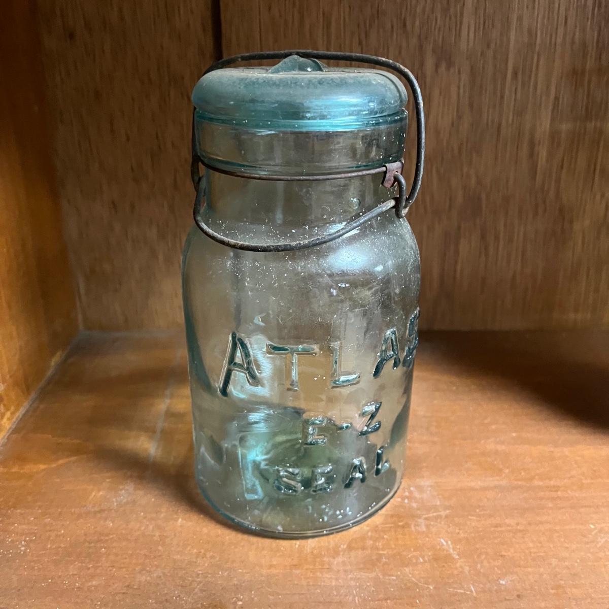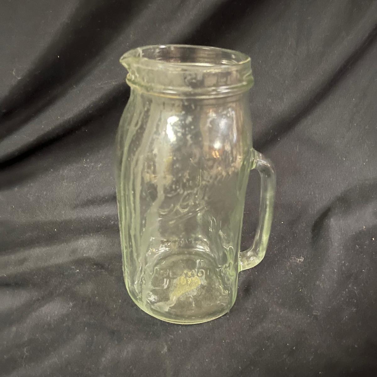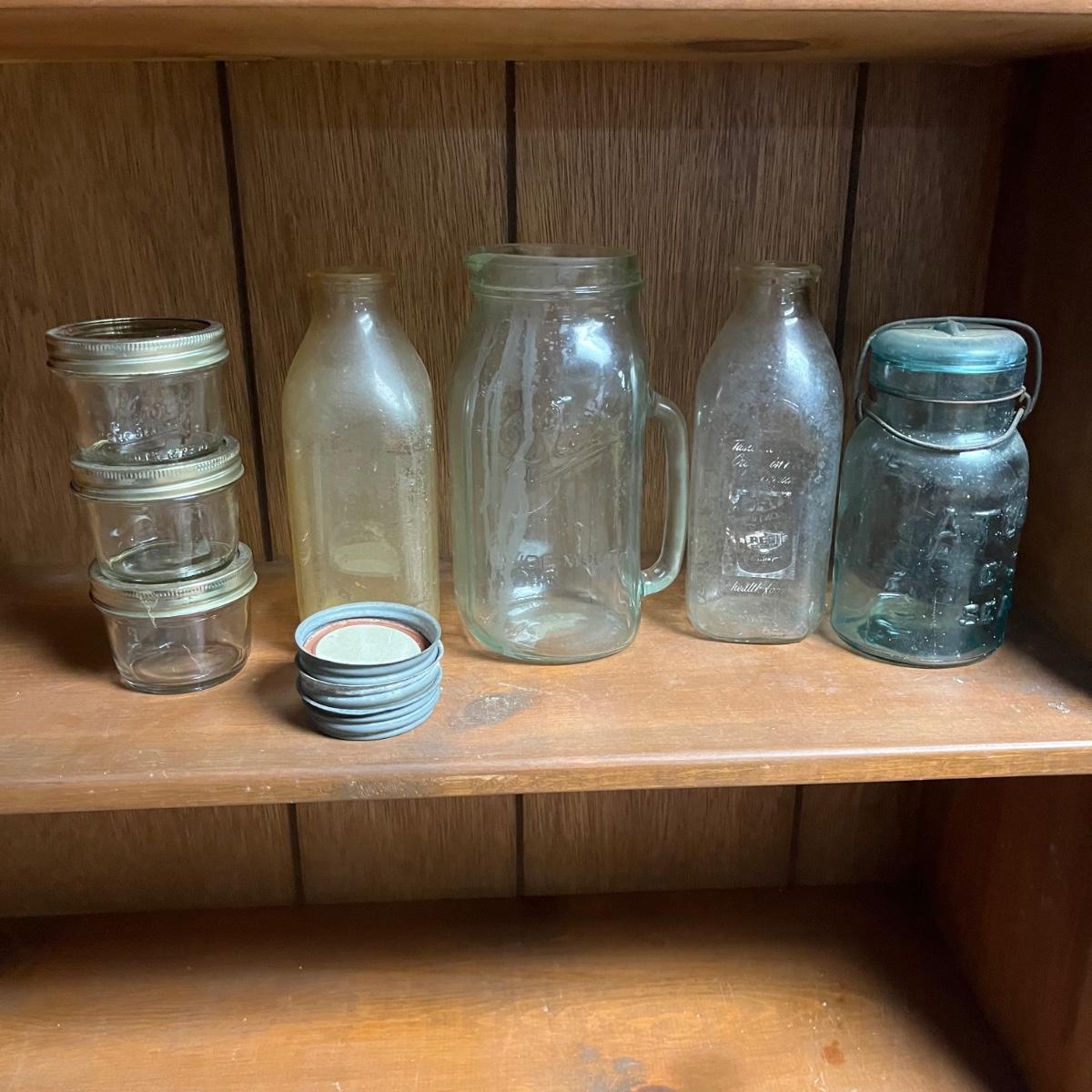 Lot includes a Ball pitcher, Atlas glass top canning jar, Pet milk bottle unmarked milk bottle, three Kerr canning jars and three zinc tops. Ball pitcher measures 4.5” x 5.5” x 9”.