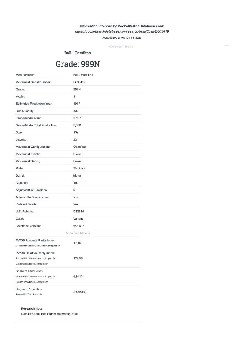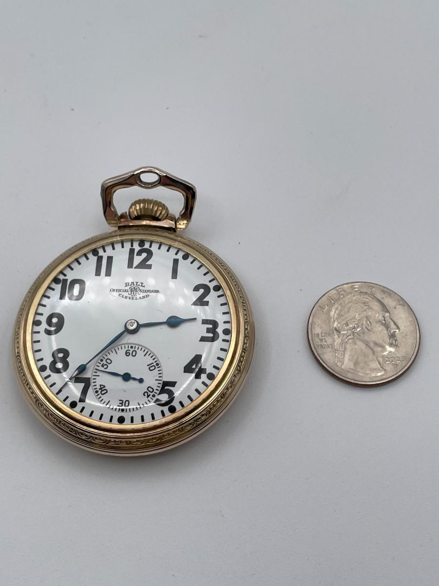 Ball Official RR Standard Pocket Watch, No. (B603419), Size 16s, Prod Yr 1917, 23 Jewels. Case: Keystone No. 8306611, JBoss GF. Condition - Winder & watch are in working order. This is not a guarantee that all parts are original nor is the watch autheniticated.